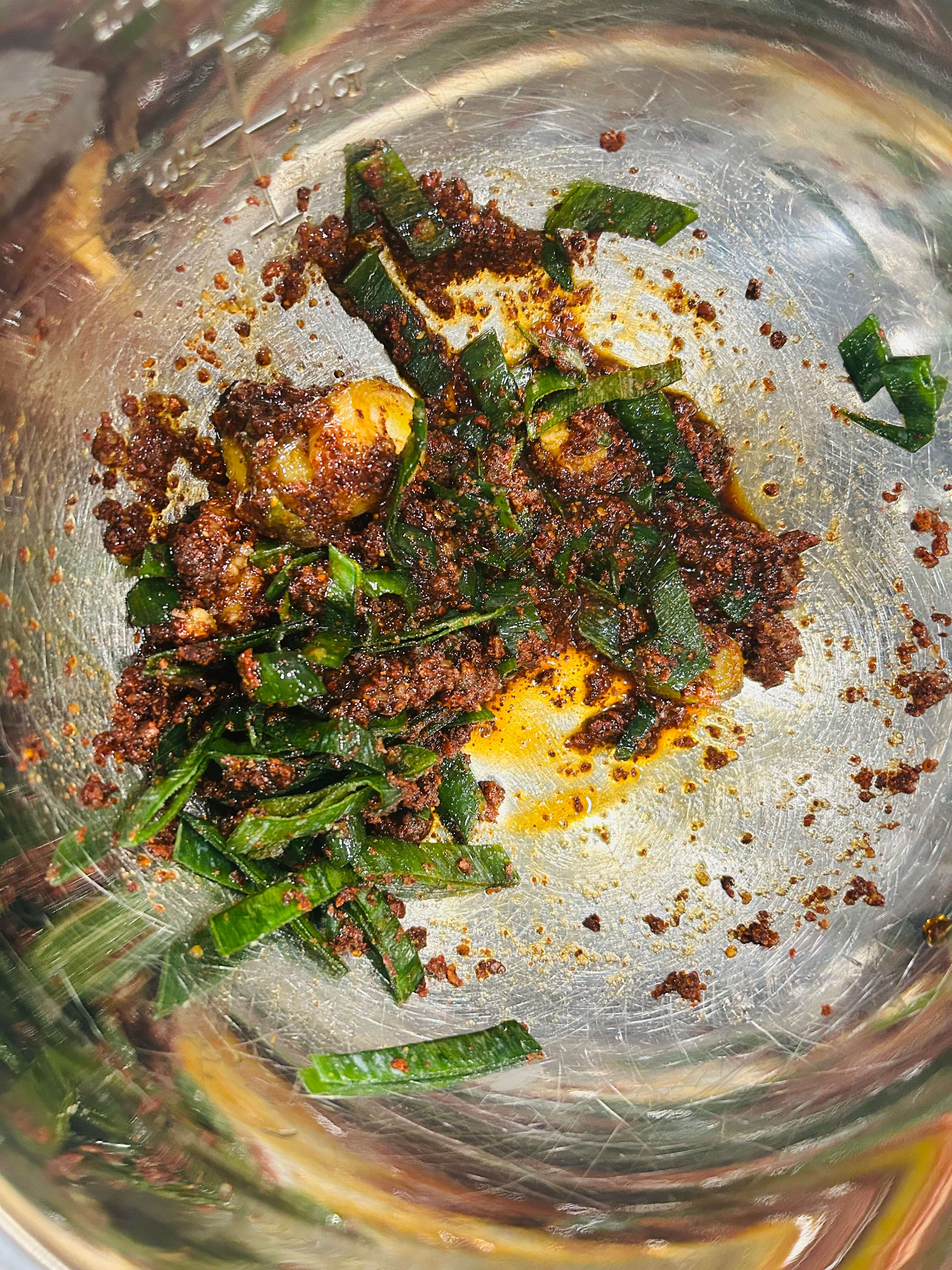 7. 고춧가루 4, 간장 3, 멸치액젓 1, 물엿 2, 설탕 2, 간 마늘 1, 대파를 넣어 양념을 잘 버무려 준비해 줍니다.