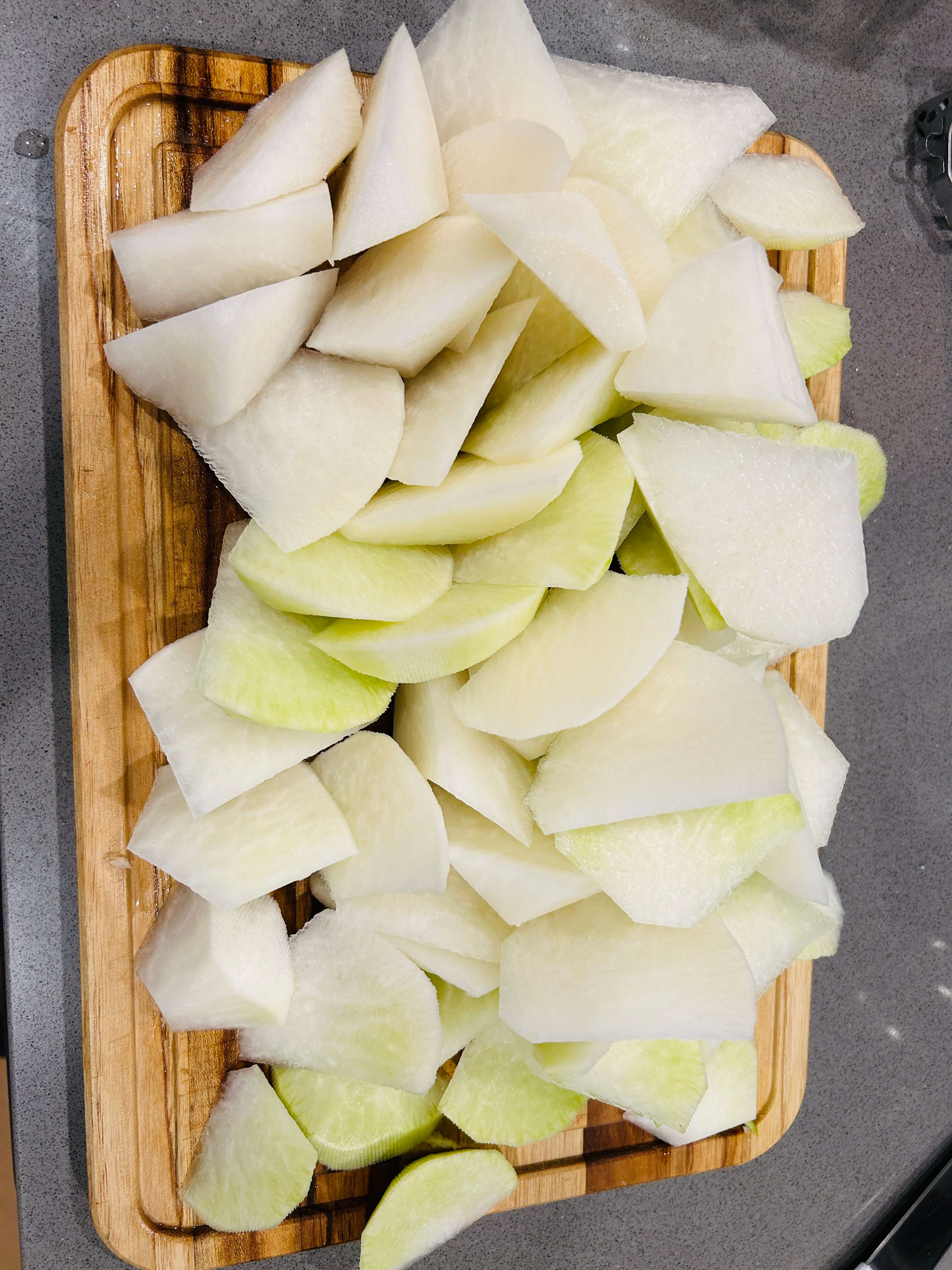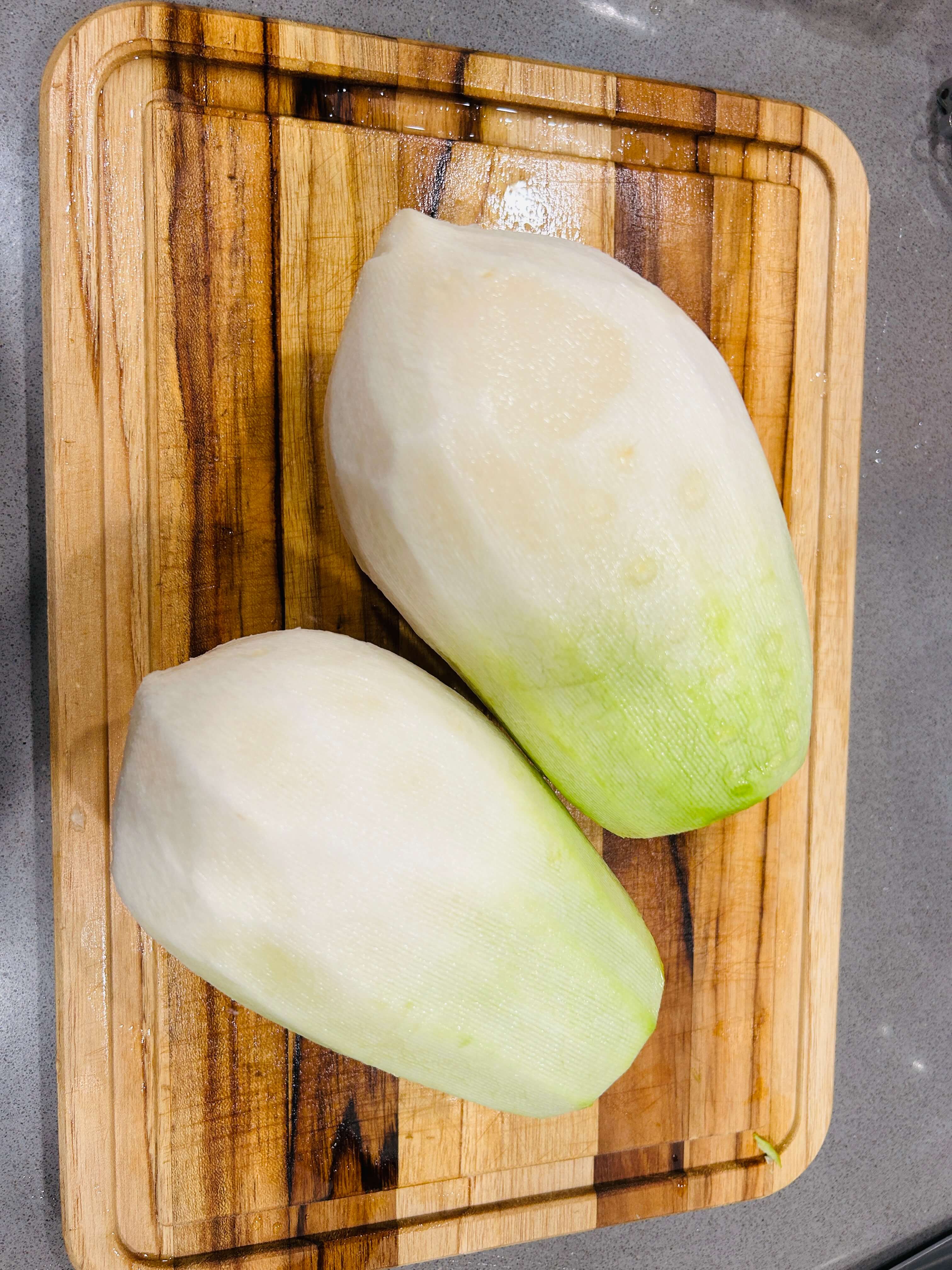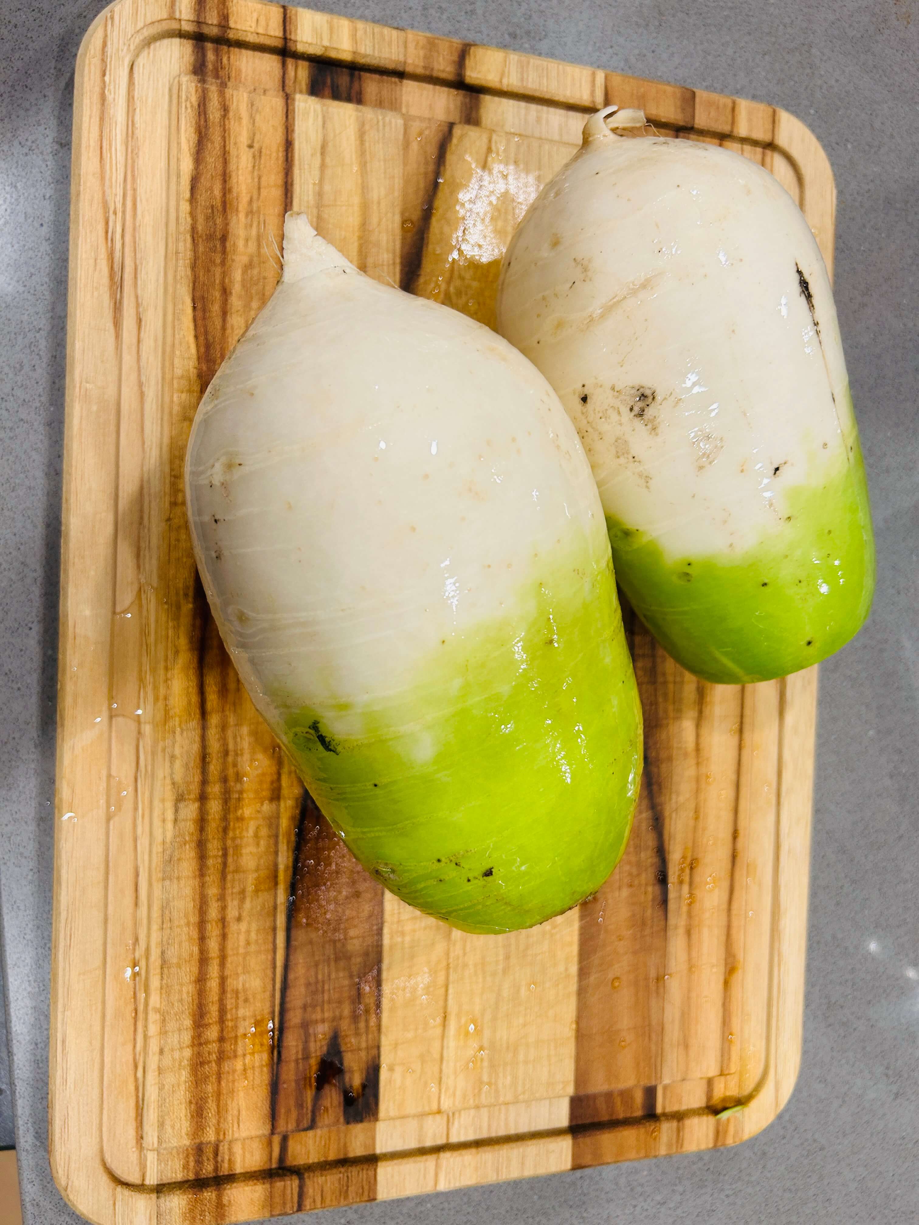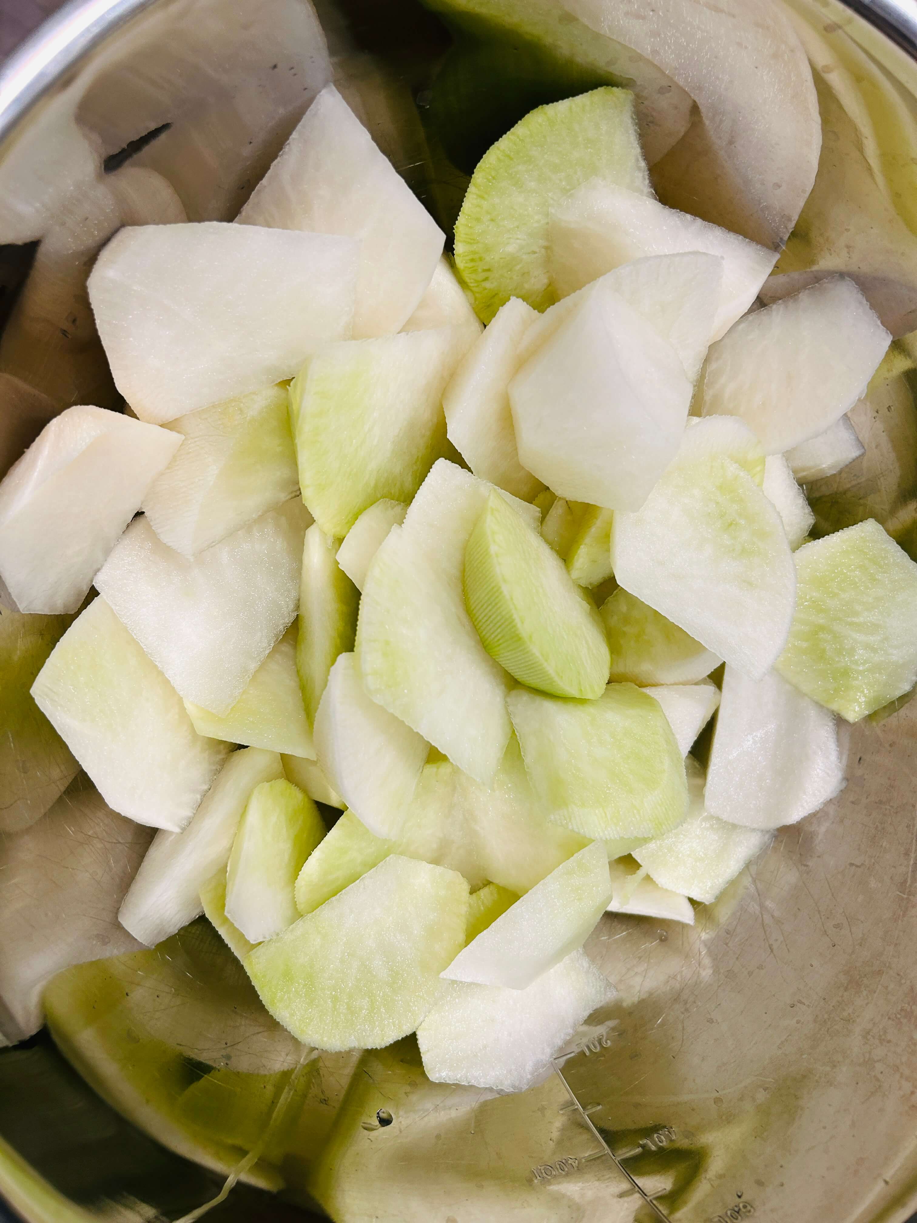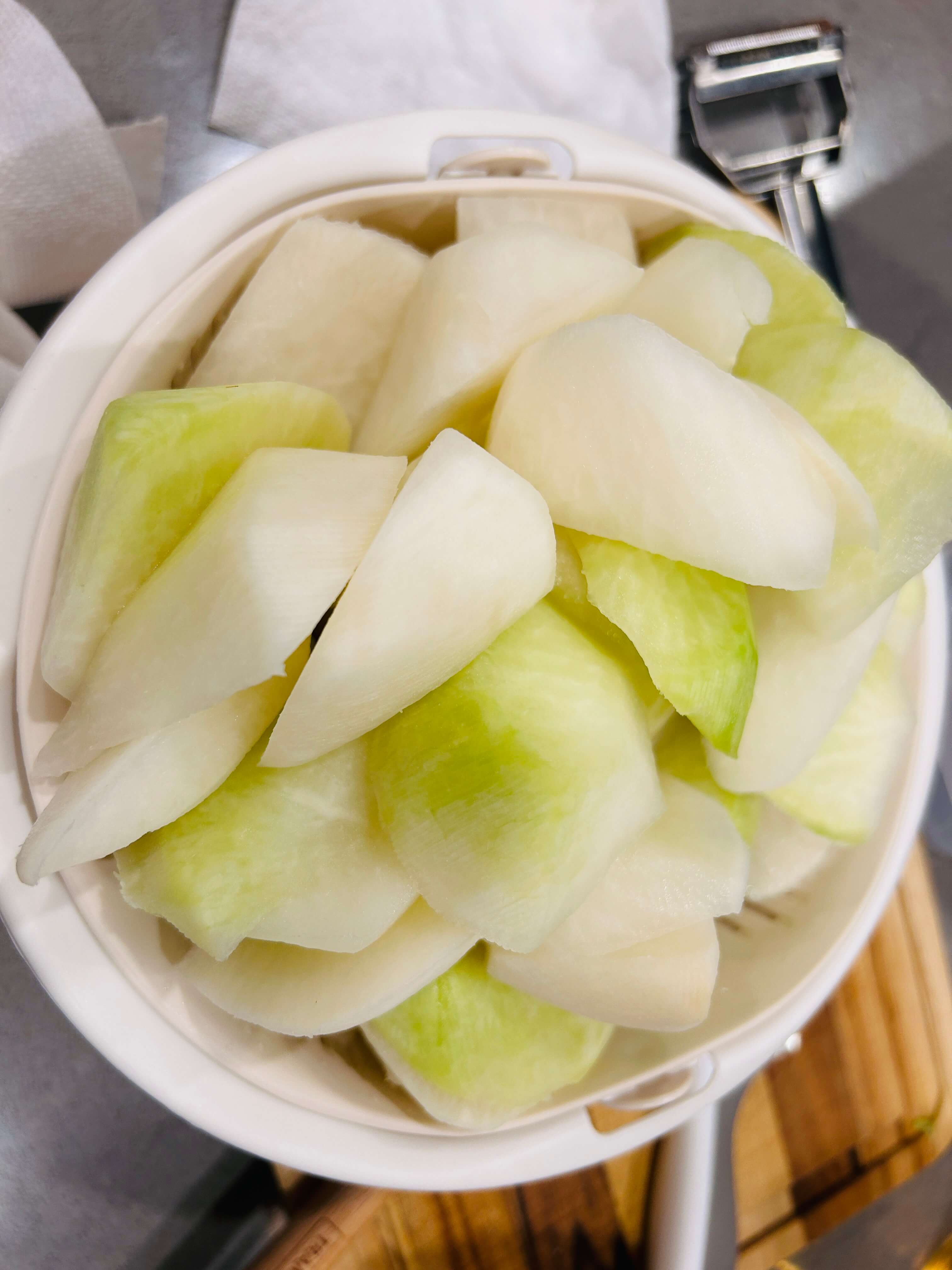 1. 무는 깨끗이 씻어 껍질을 제거한 뒤 투박하게 썰어서 준비해 줍니다.