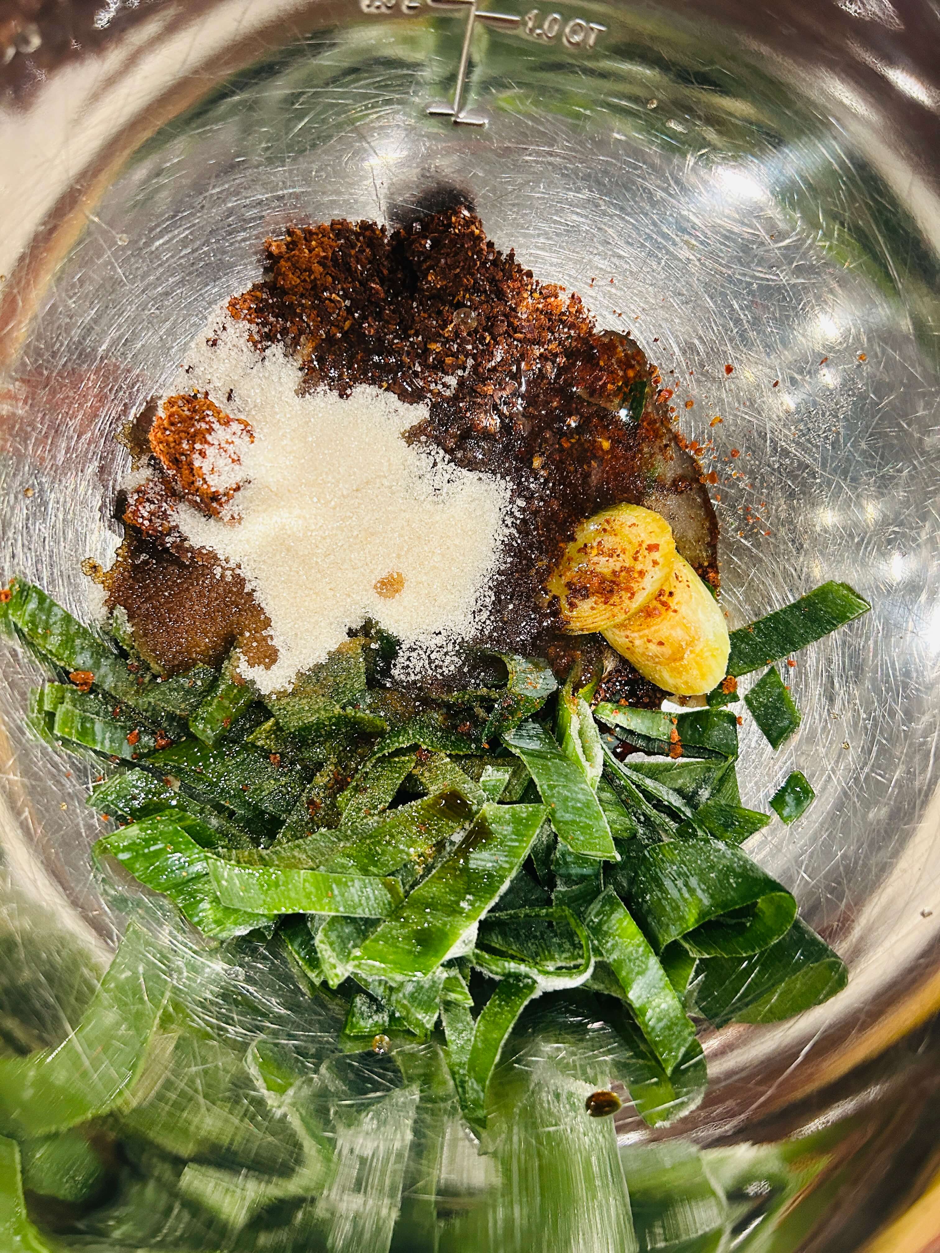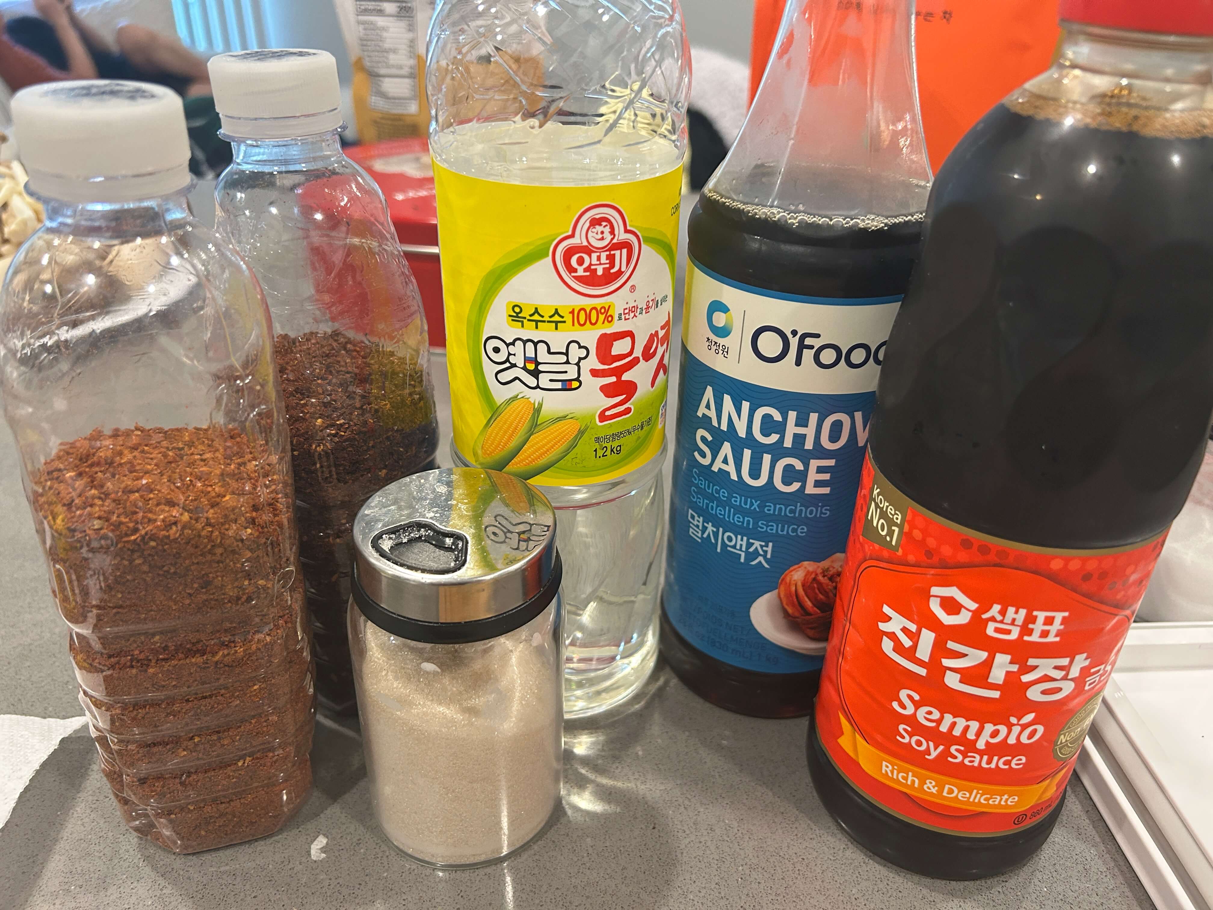 6. 간 마늘, 대파, 고춧가루, 간장, 멸치액젓, 물엿, 설탕을 양념 재료로 준비해 줍니다.
