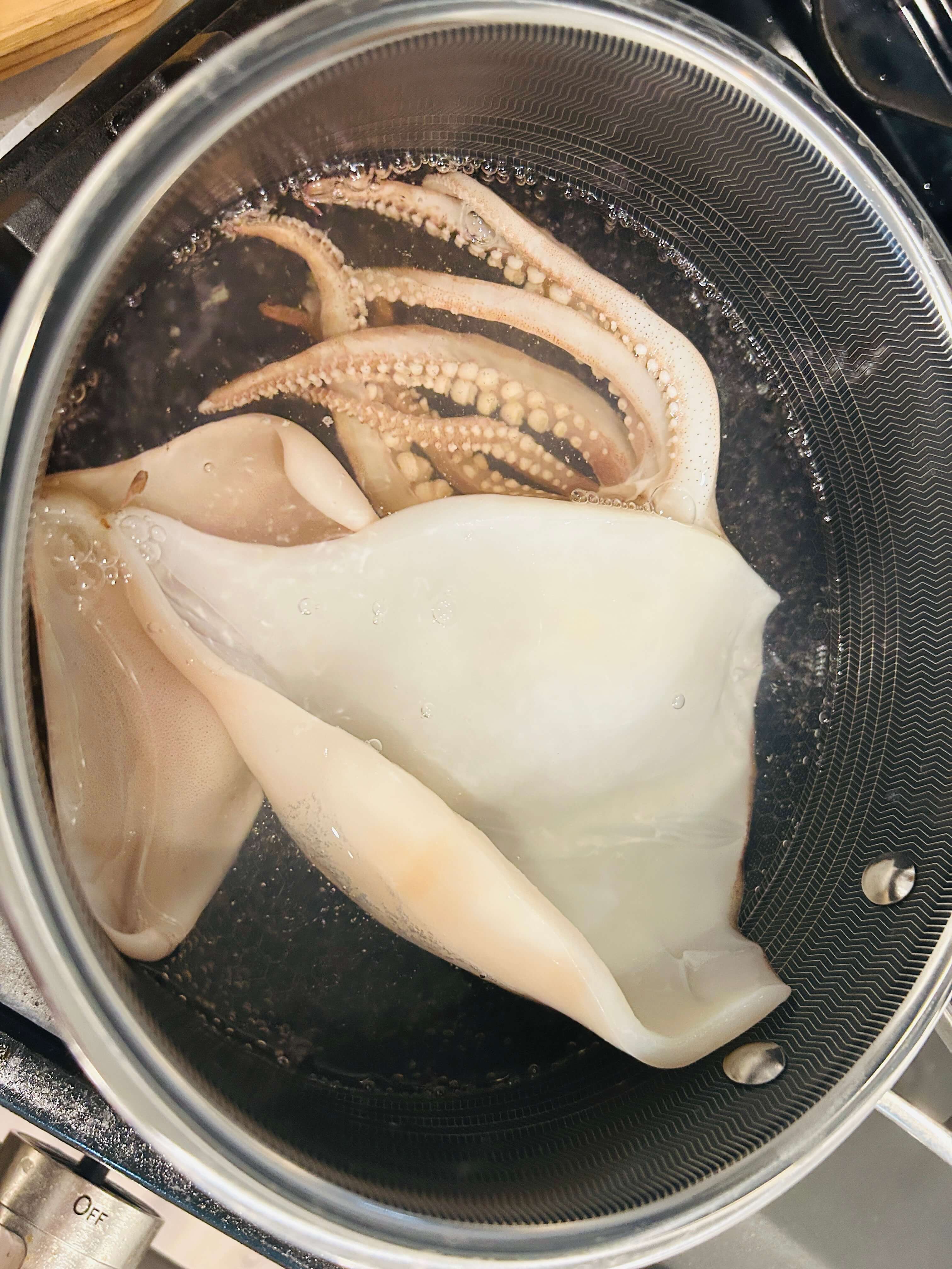2. 끓는 물에 오징어를 데쳐줍니다. (5분 이내로)