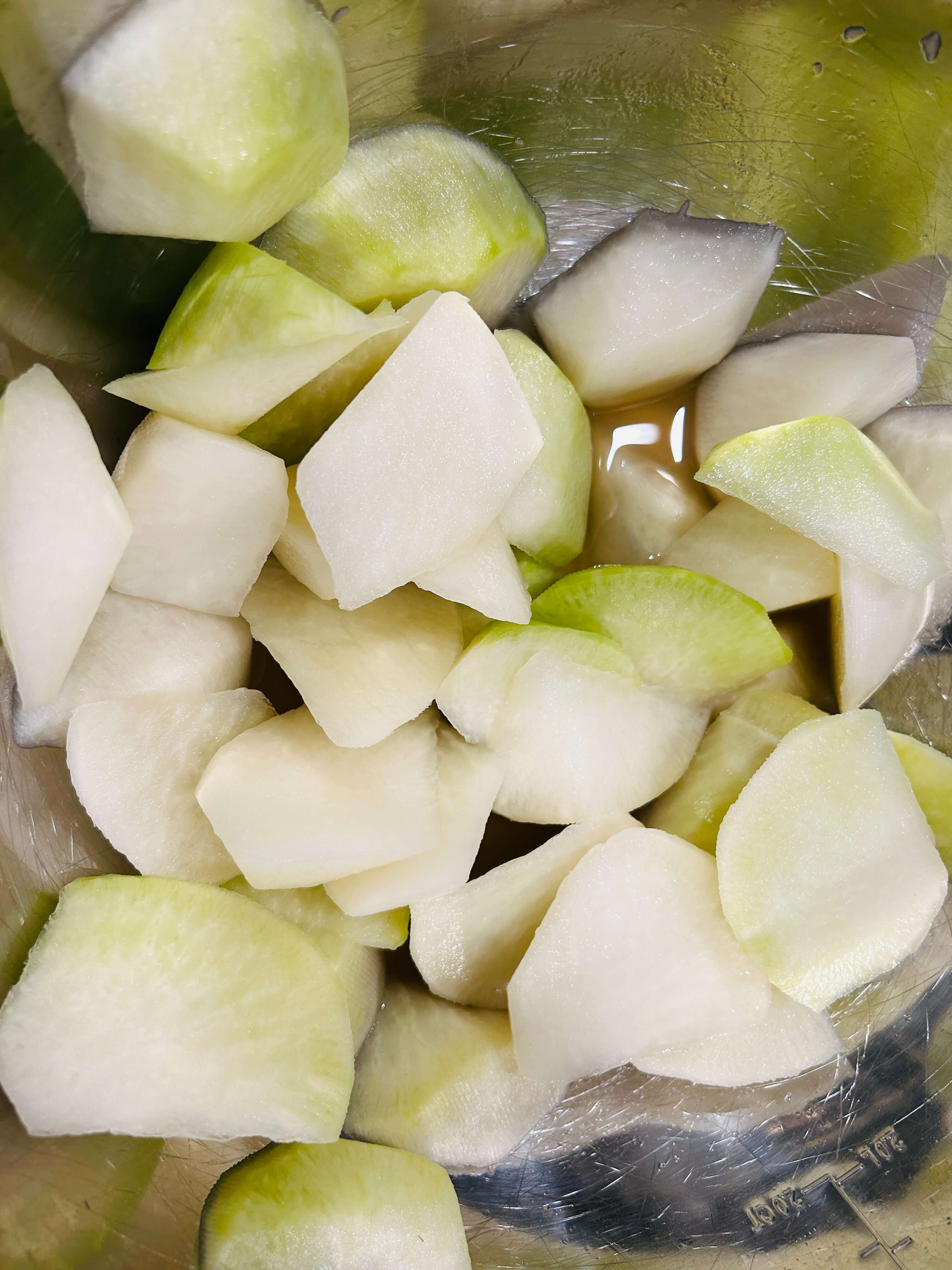 1. 무는 깨끗이 씻어 껍질을 제거한 뒤 투박하게 썰어서 준비해 줍니다.