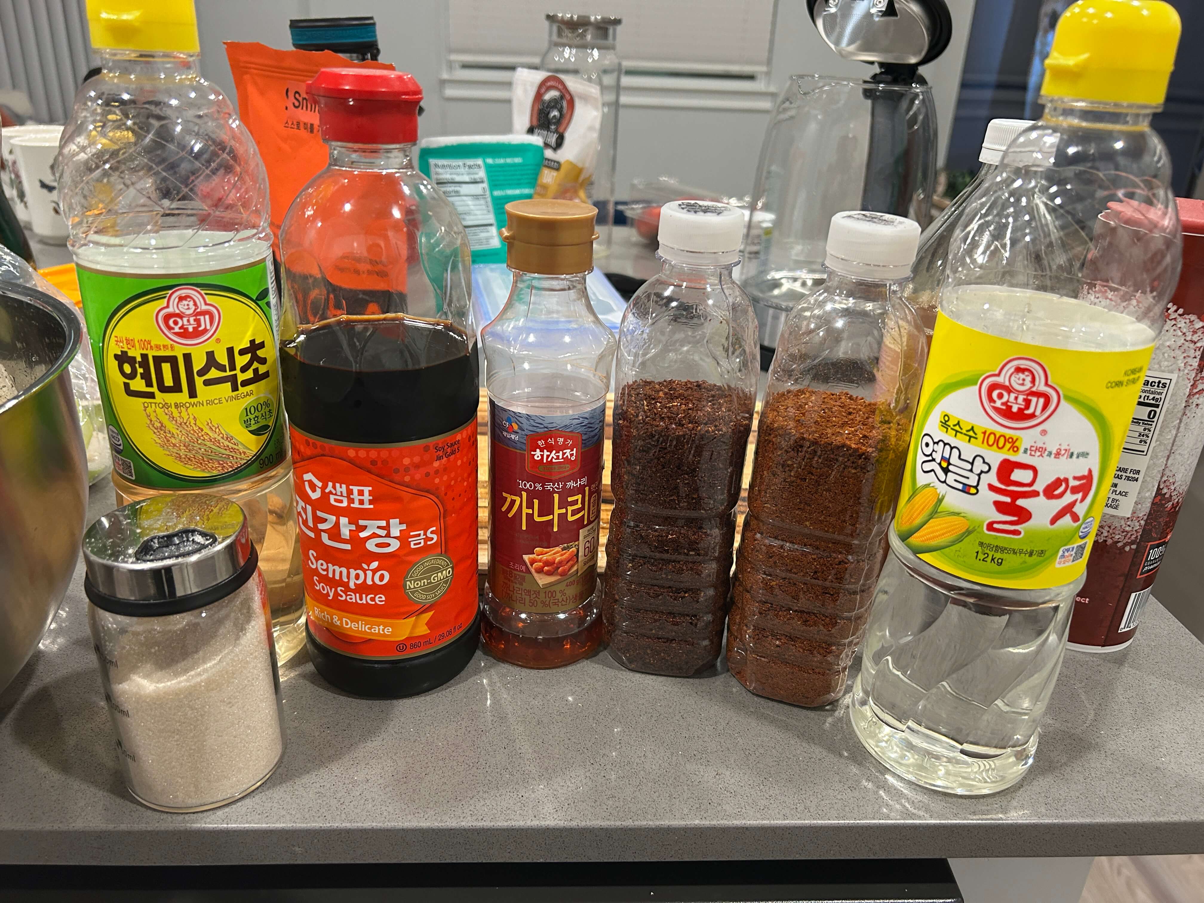 6. 간 마늘, 대파, 고춧가루, 간장, 멸치액젓, 물엿, 설탕을 양념 재료로 준비해 줍니다.