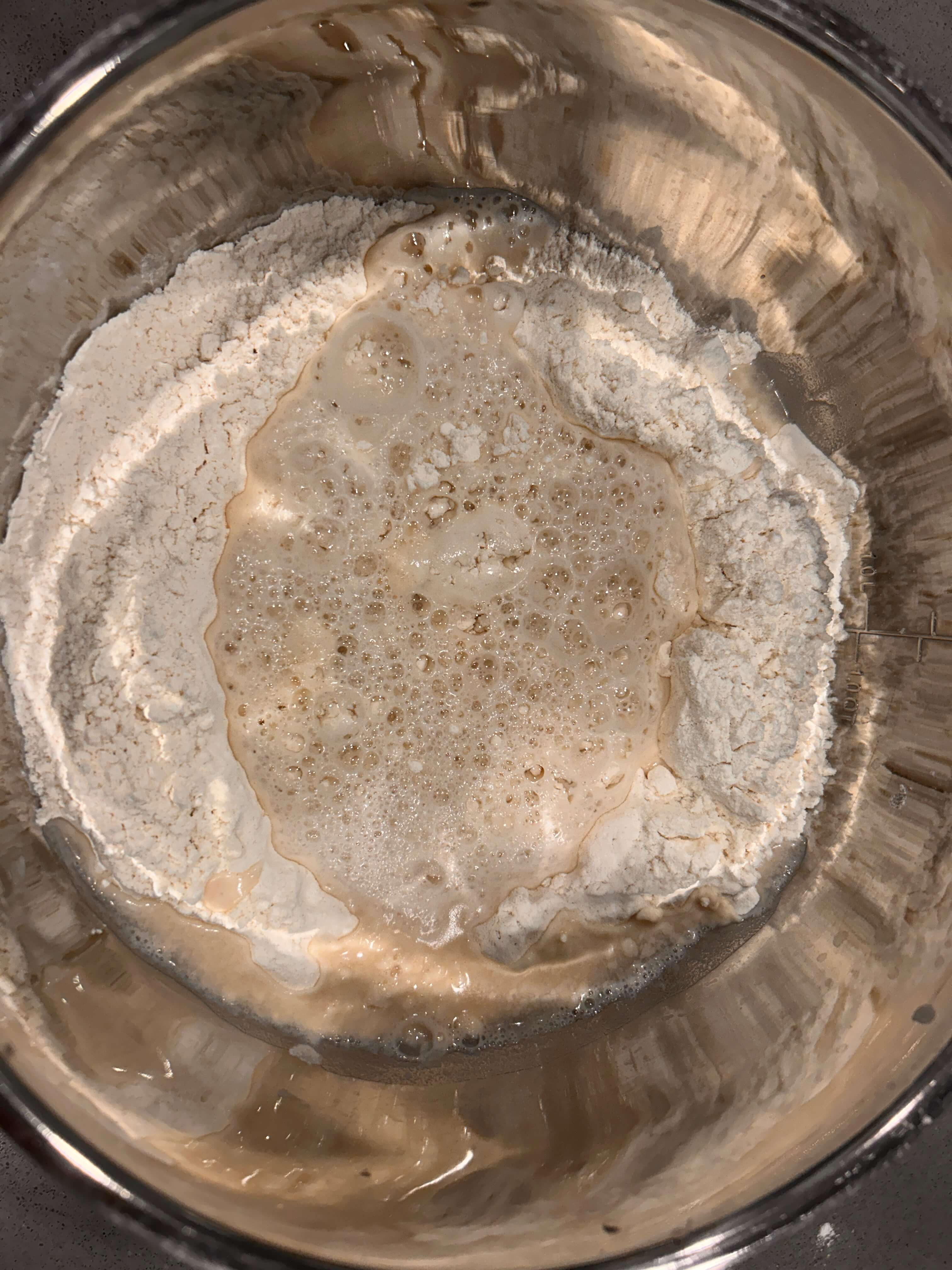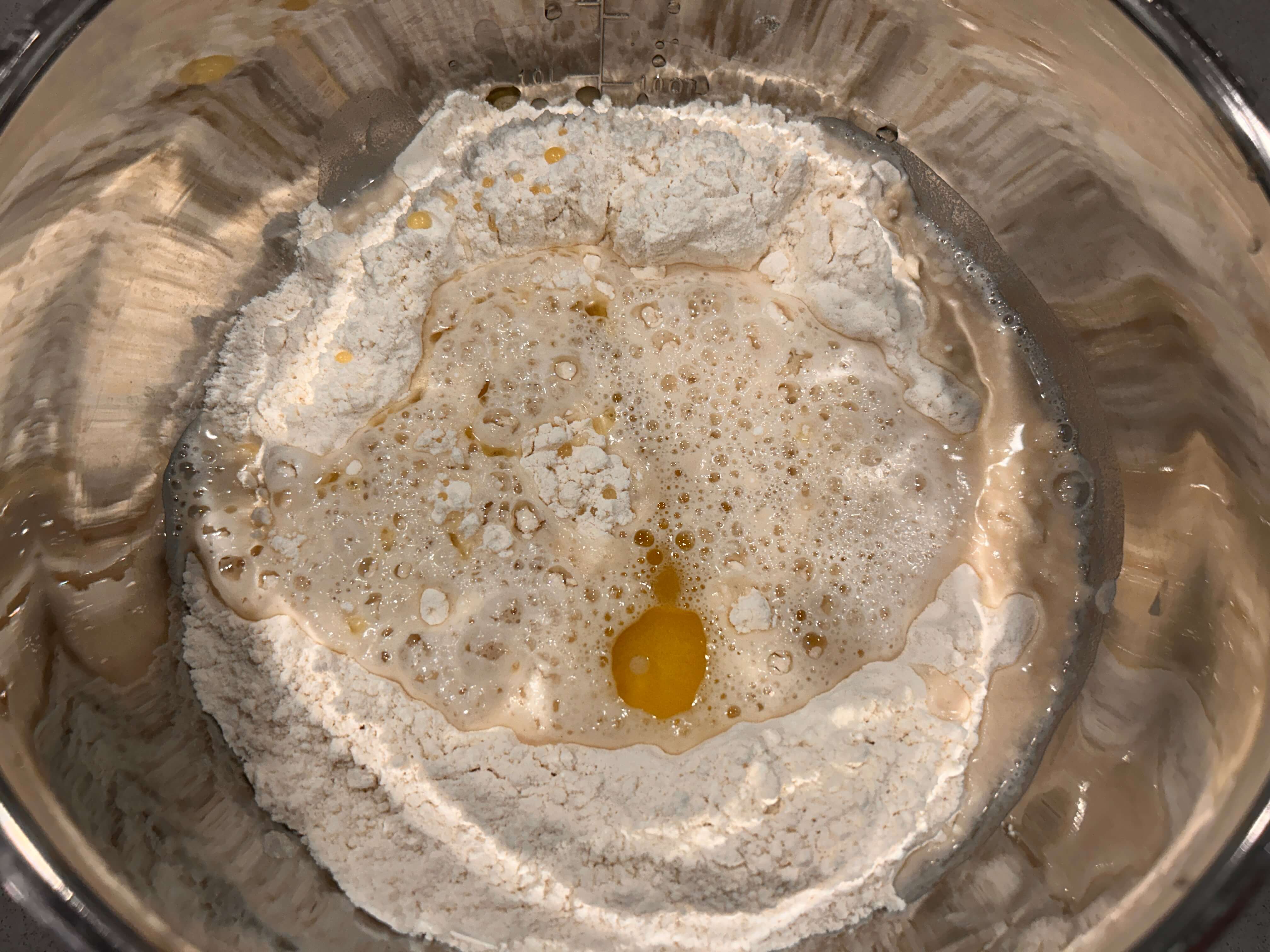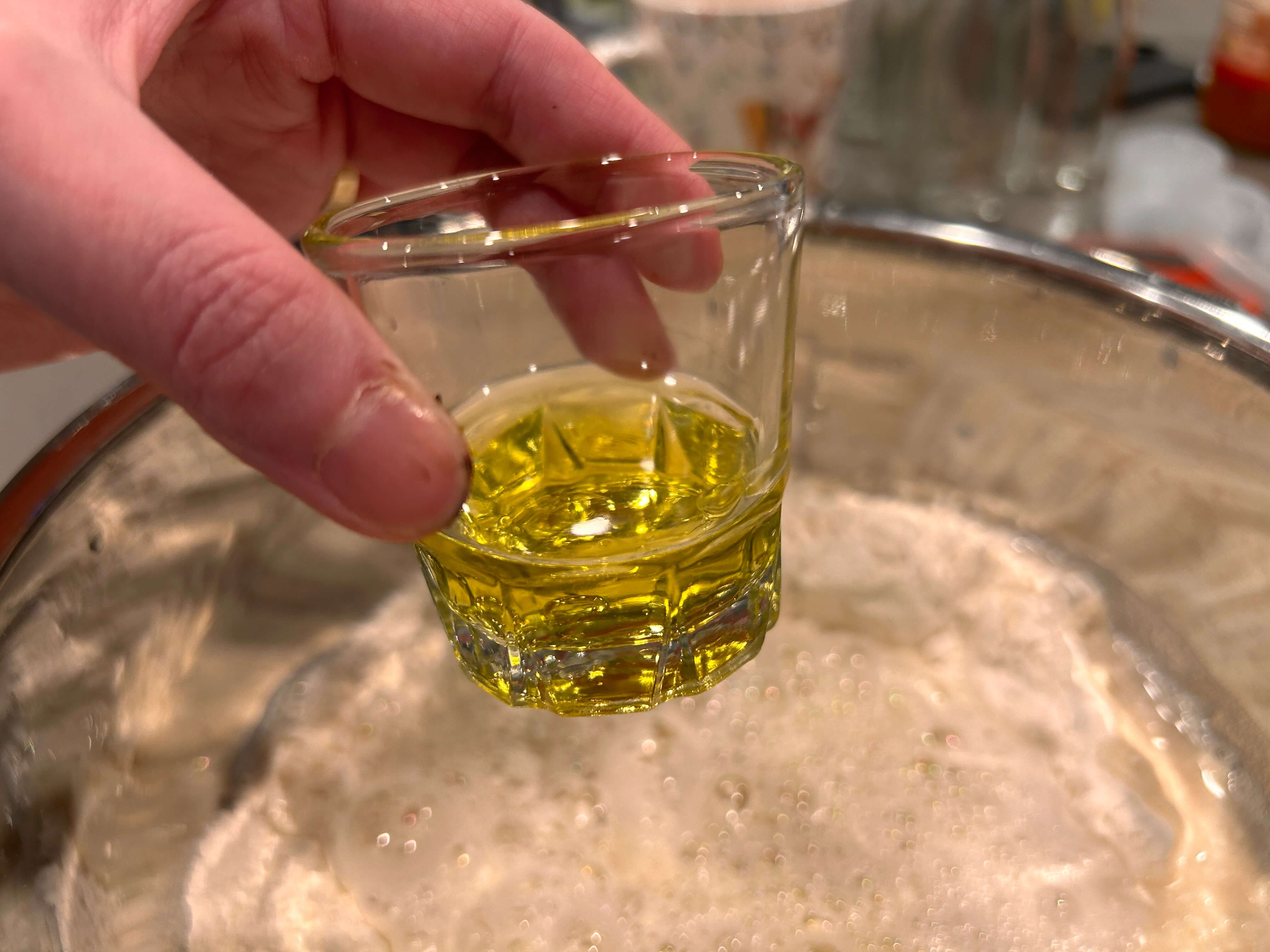 4. 준비된 1번의 이스트를 넣어주고 올리브오일 소주잔으로 1/3 정도를 넣어줍니다.