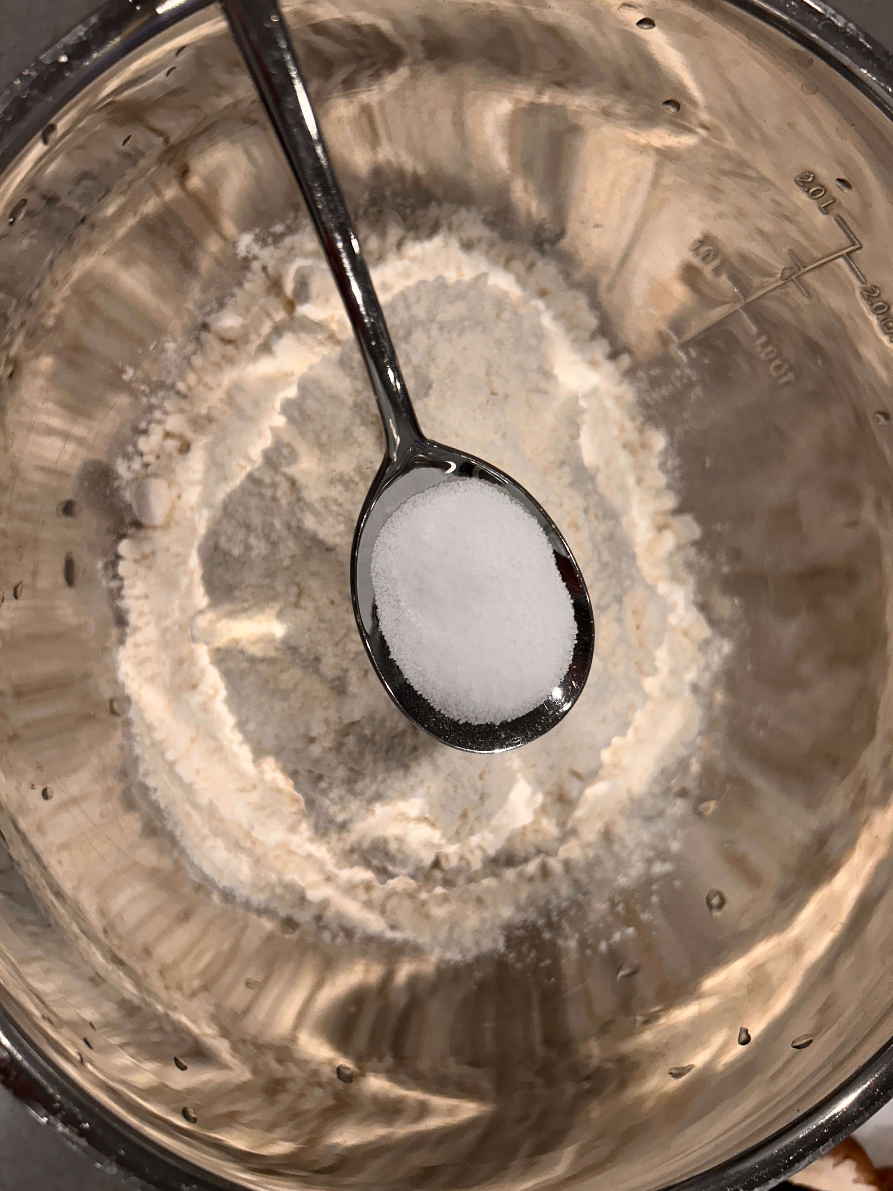 3. 강력분 2.5컵에 소금 한숟갈을 넣어줍니다.