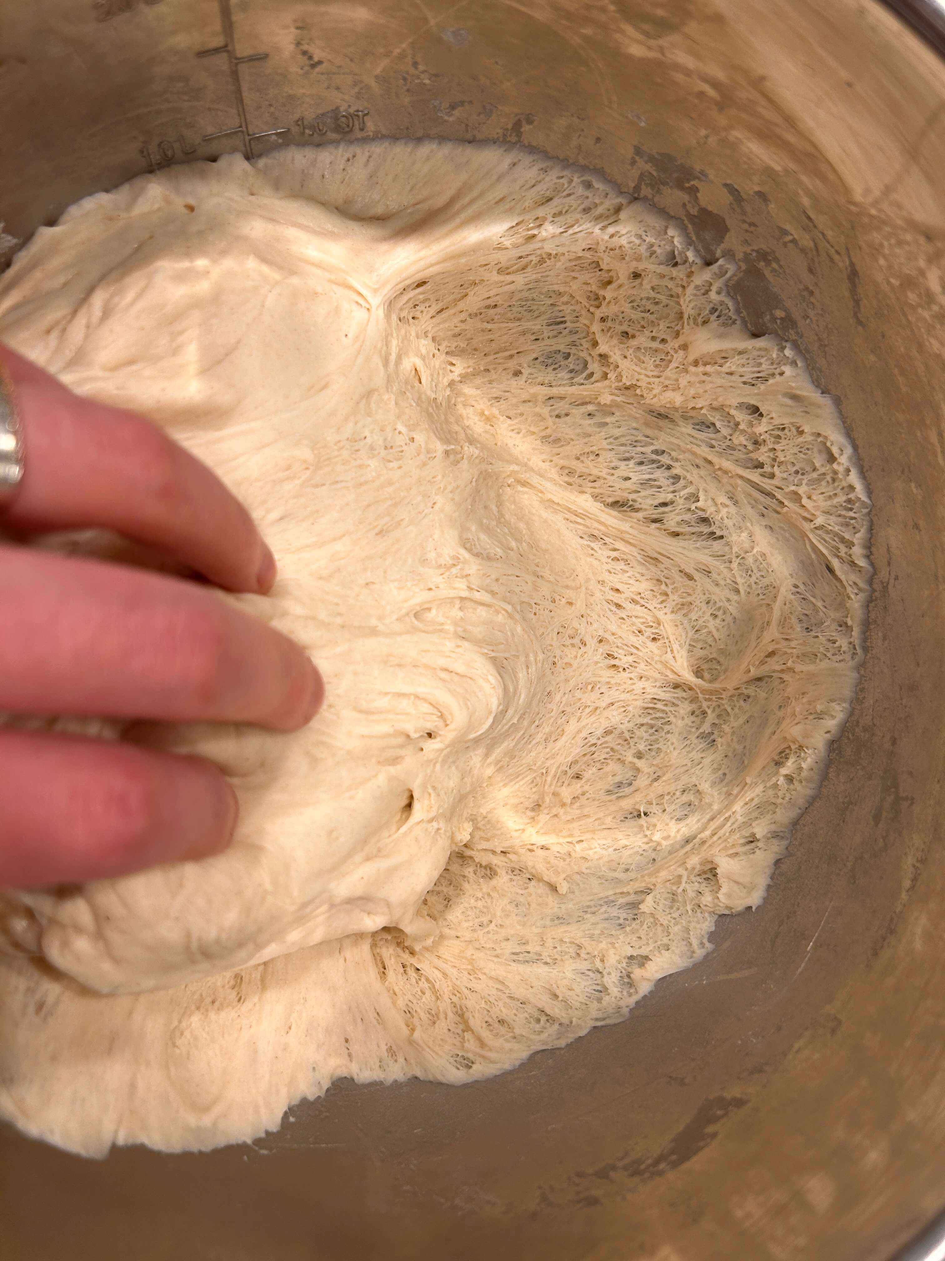 6. 발효시킨 반죽을 볼에서 떼어 손으로 조금 더 치대 줍니다.