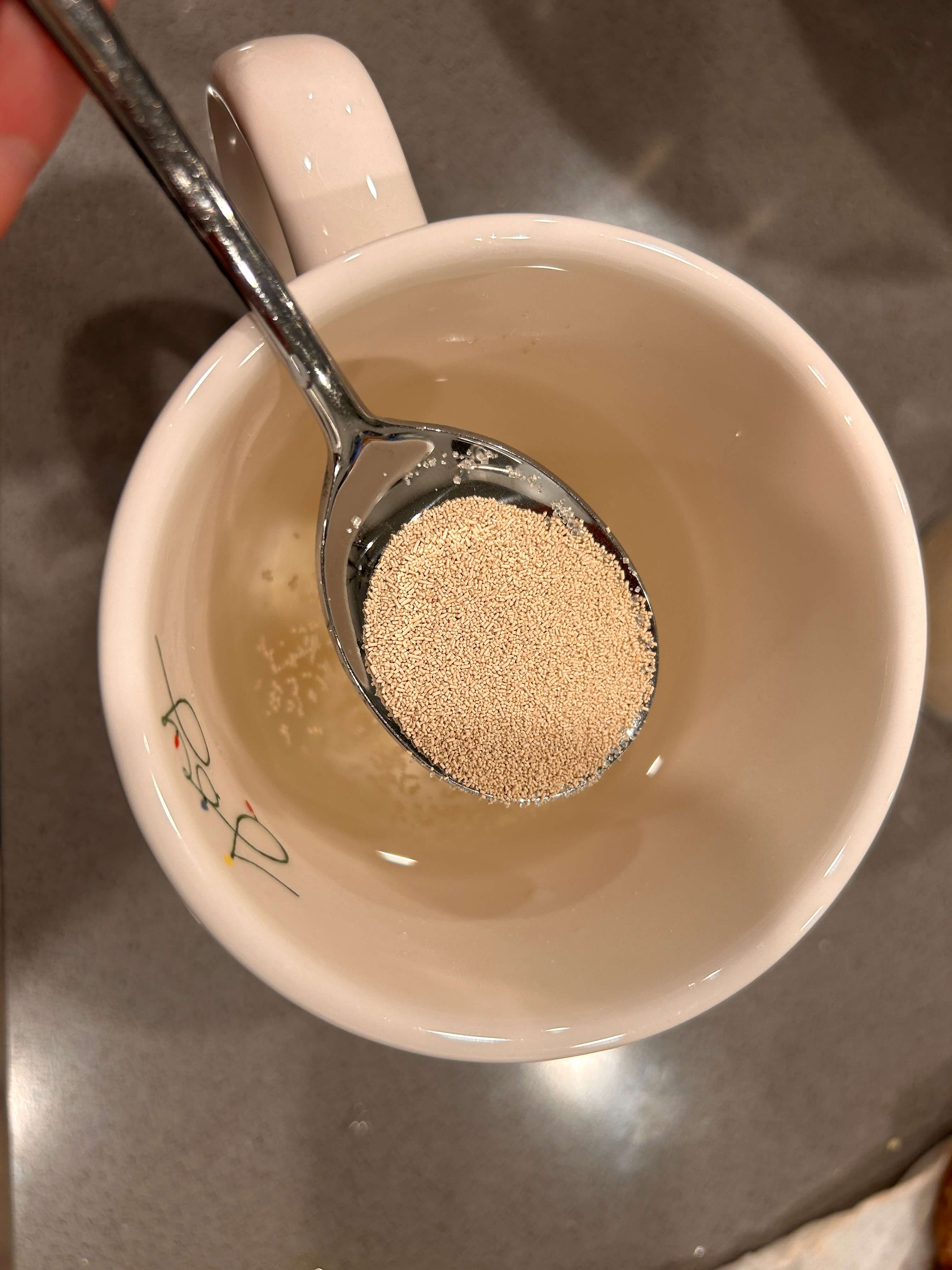 2. 따뜻한 물에 설탕 1 숟갈, 드라이이스트 1 숟갈을 넣고 잘 섞어 10분 정도 실온에 둡니다.