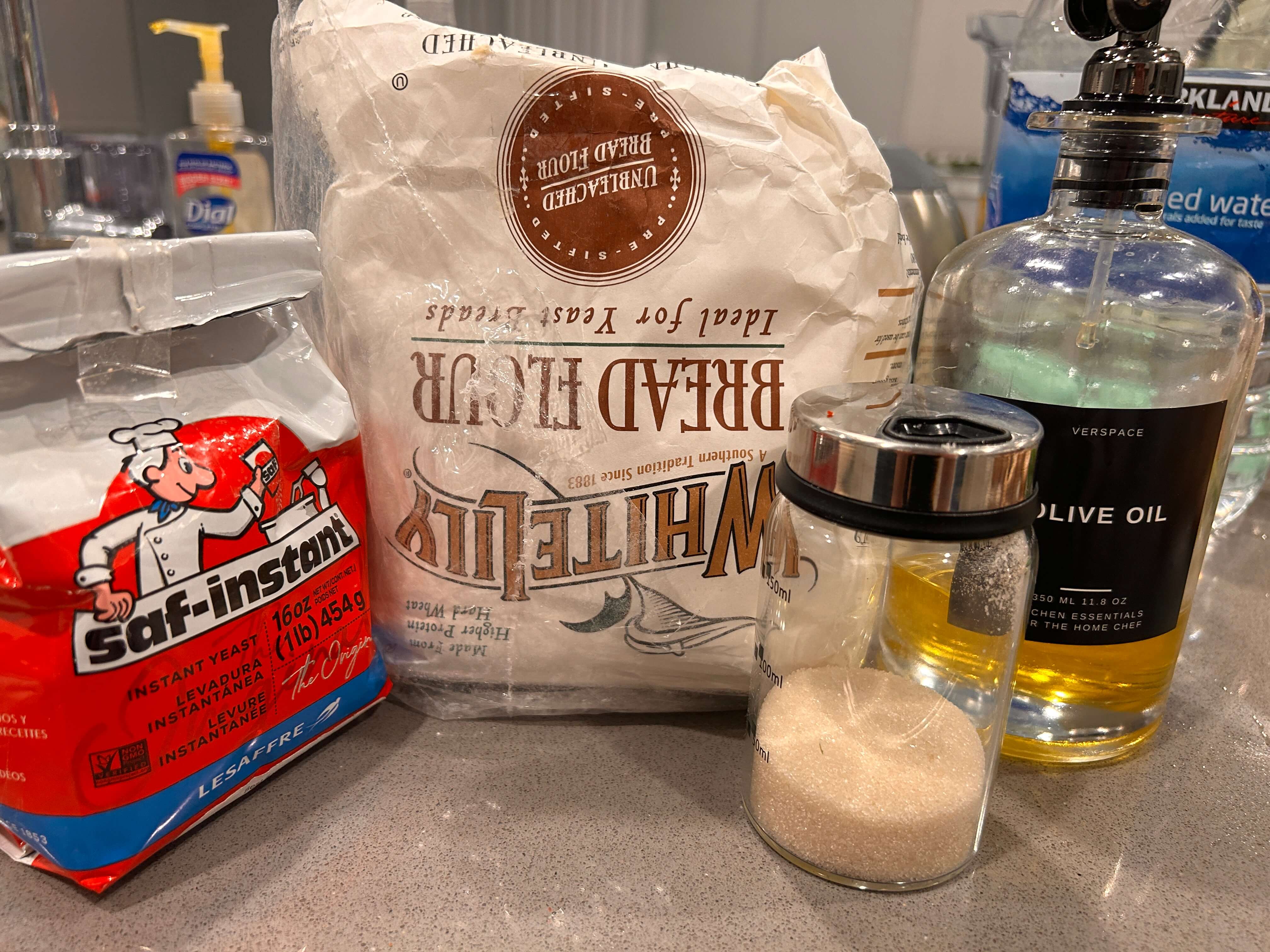 1. 도우반죽에 필요한 재료는 강력분, 소금, 설탕, 올리브유, 인스턴트이스트입니다.