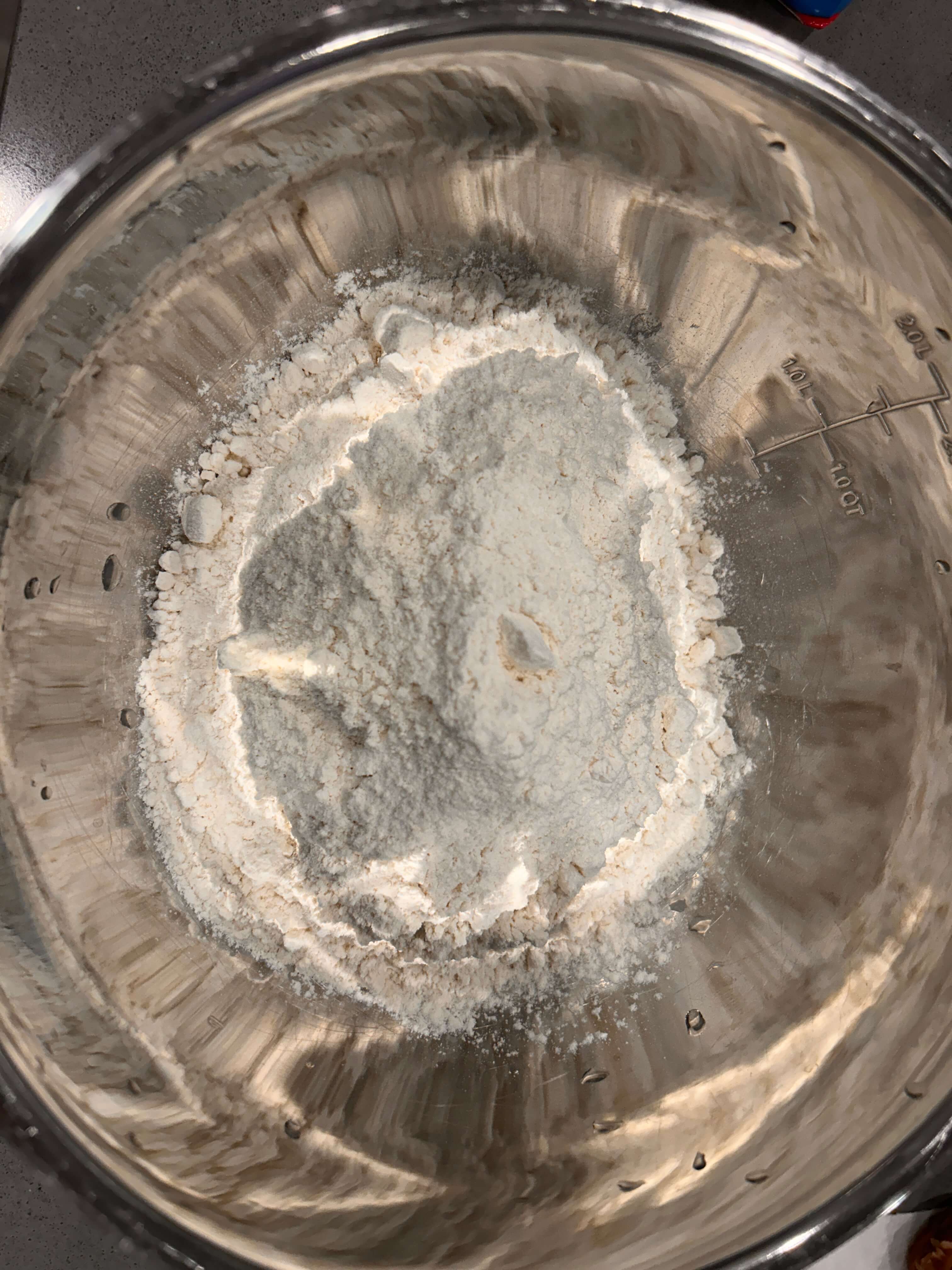 3. 강력분 2.5컵에 소금 한 숟갈을 넣어줍니다.