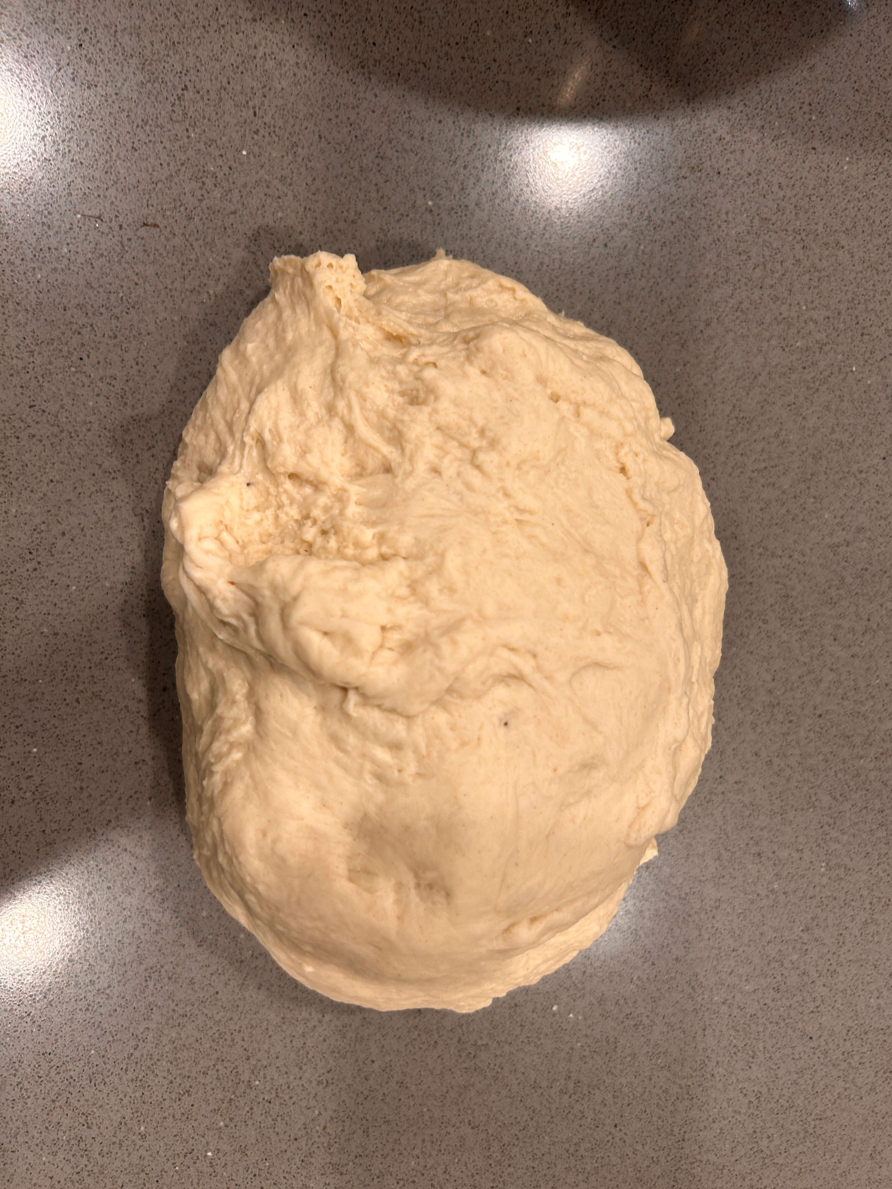 6. 발효시킨 반죽을 볼에서 떼어 손으로 조금 더 치대 줍니다.
