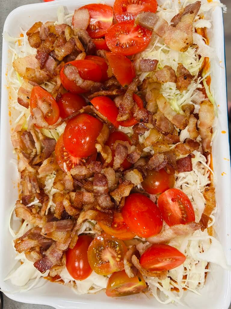 7. 바싹 익혀준 베이컨을 올려줍니다.