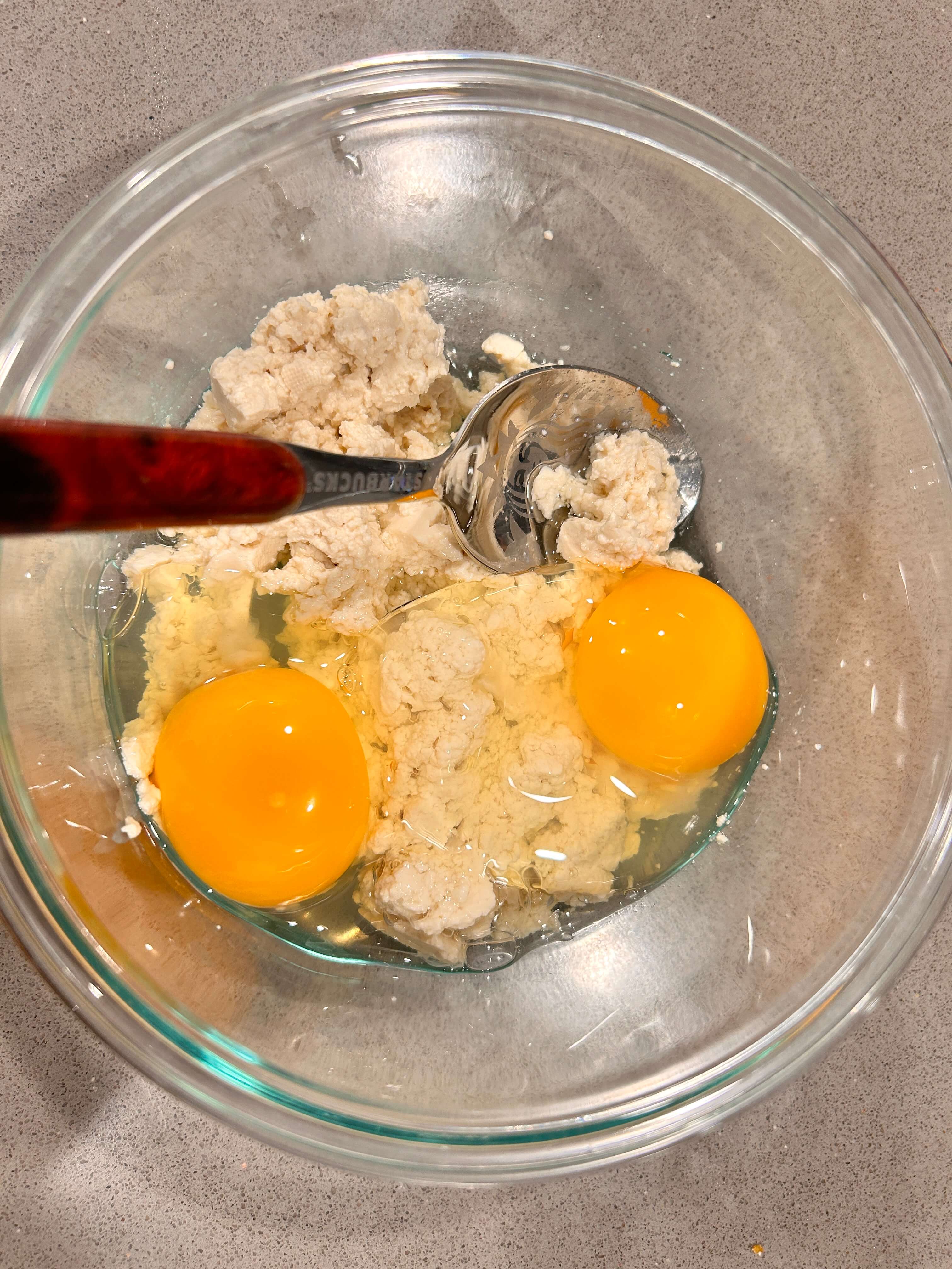 2. 계란 2개를 넣고 두부랑 잘 섞어줍니다.