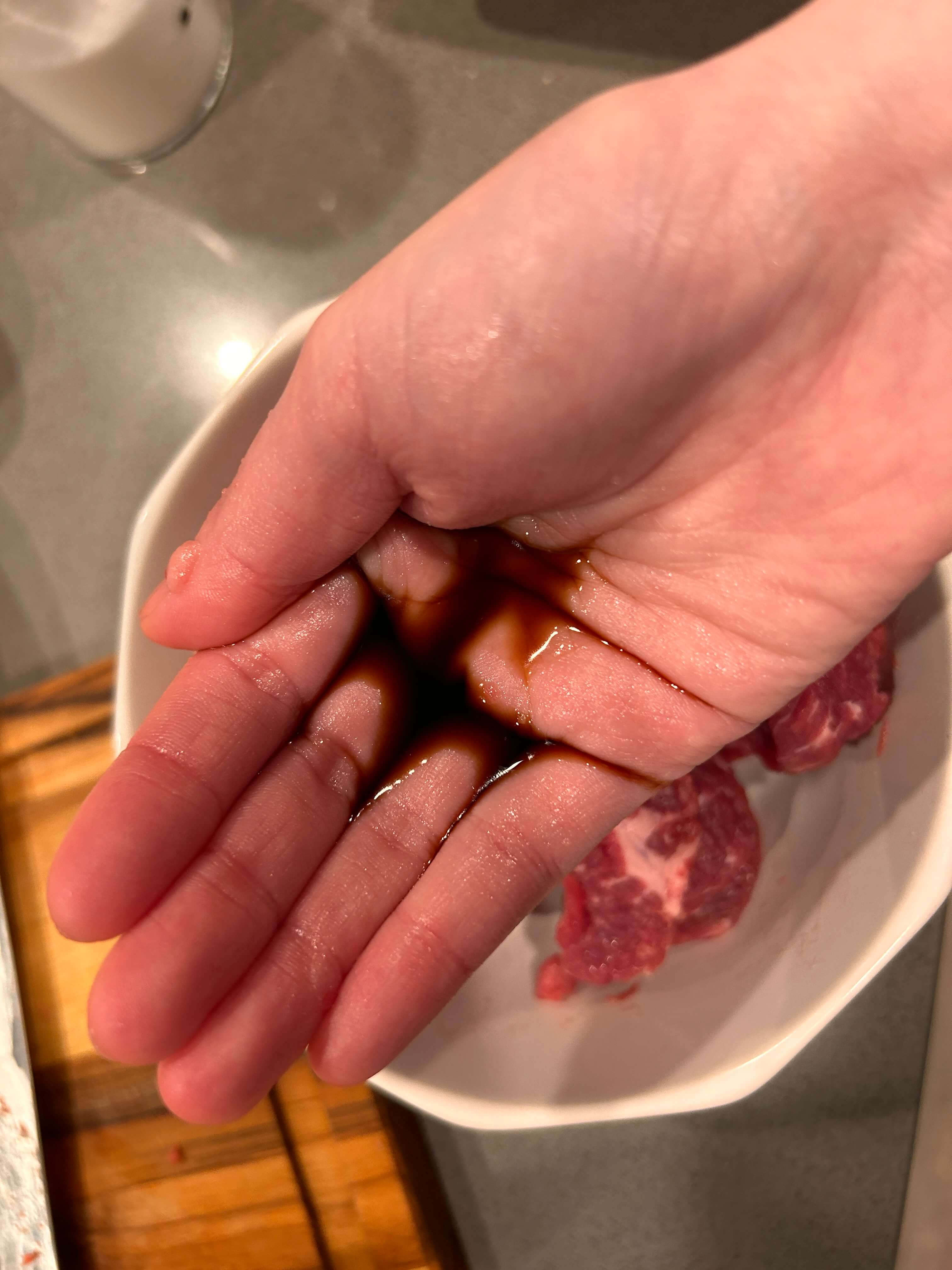3. 또 다른 양념으로 참기름 3 후추 간장 2 설탕 4 미원 0.5을 넣어 고기와 잘 버무려 줍니다.