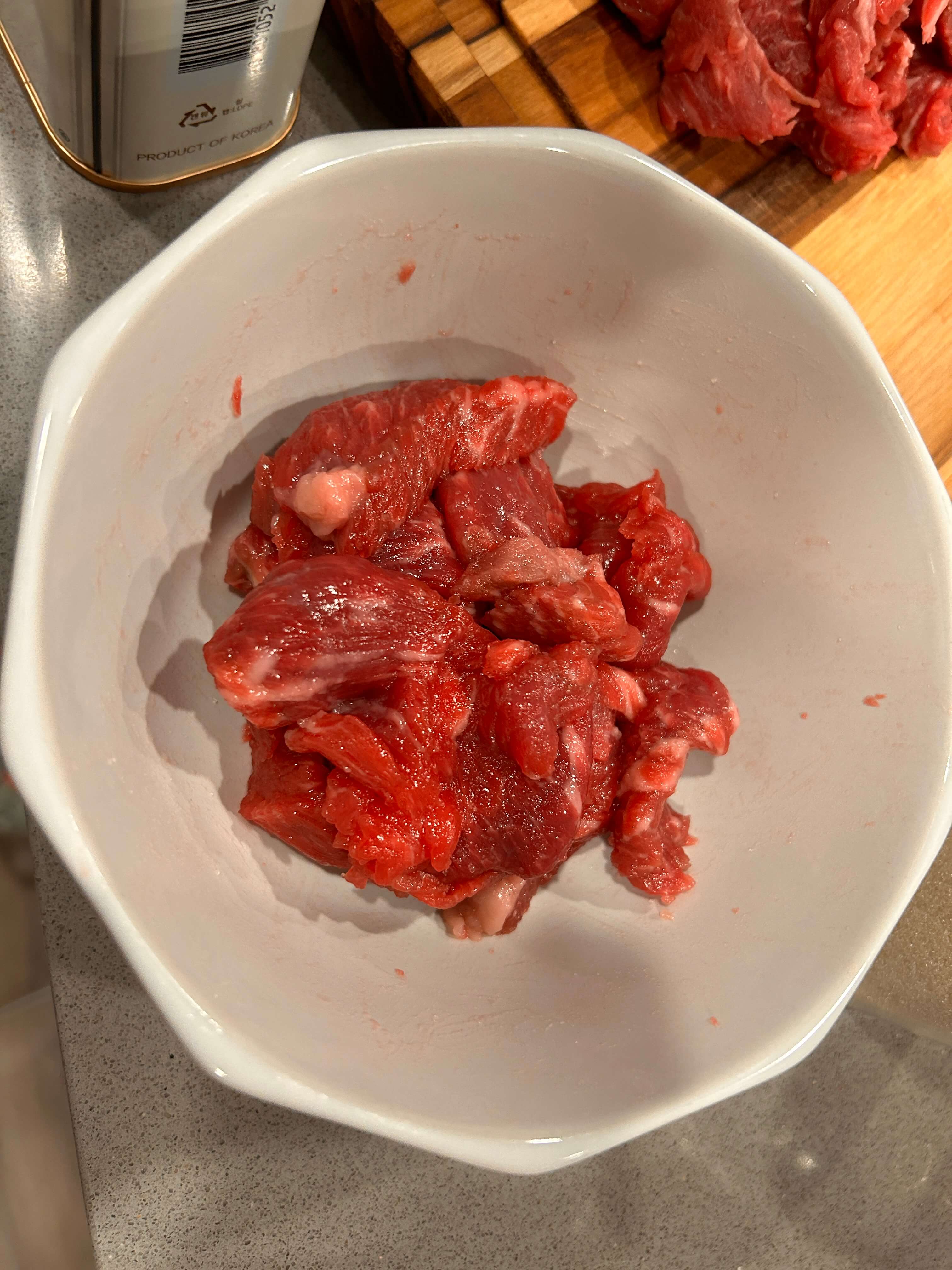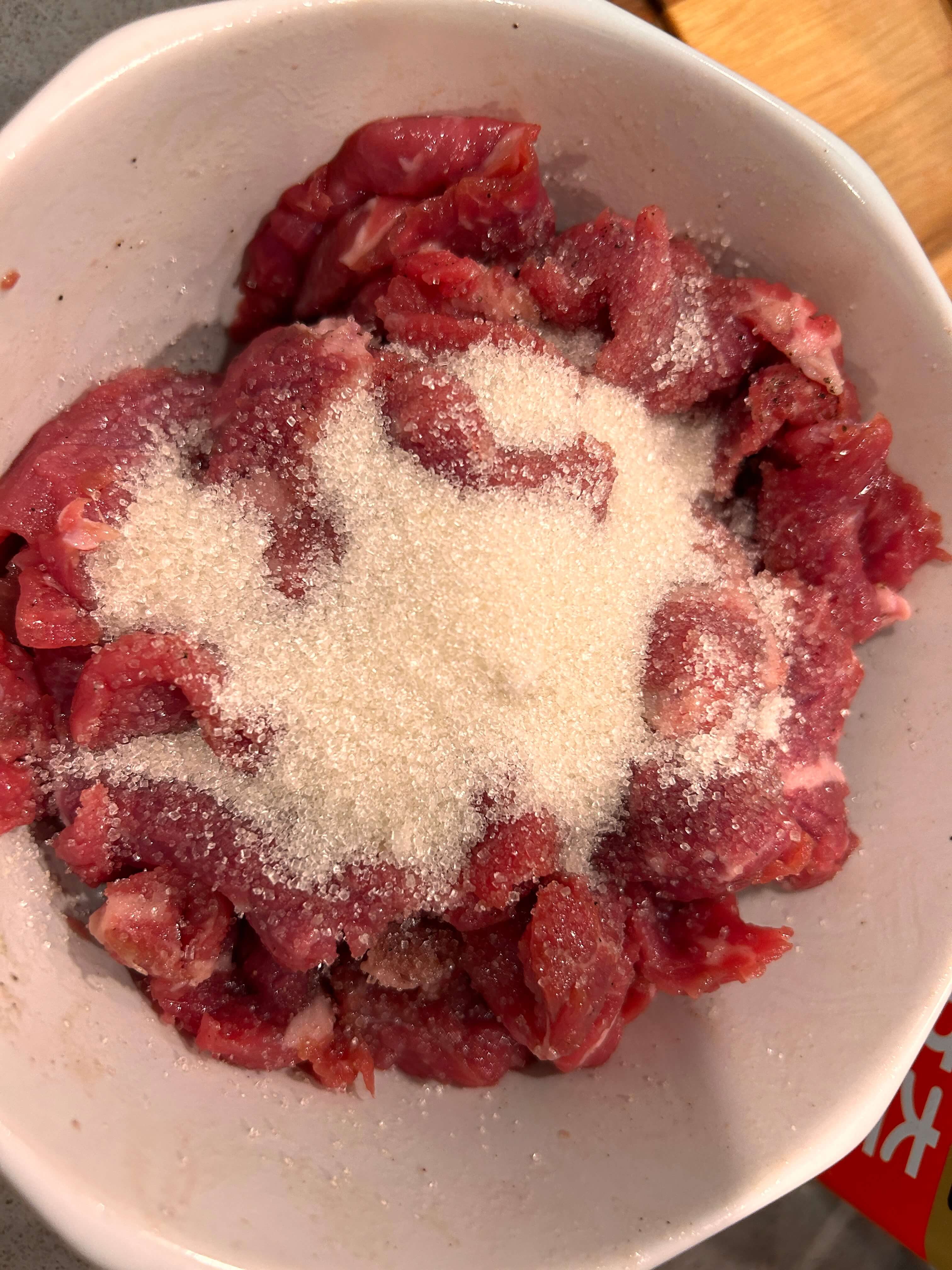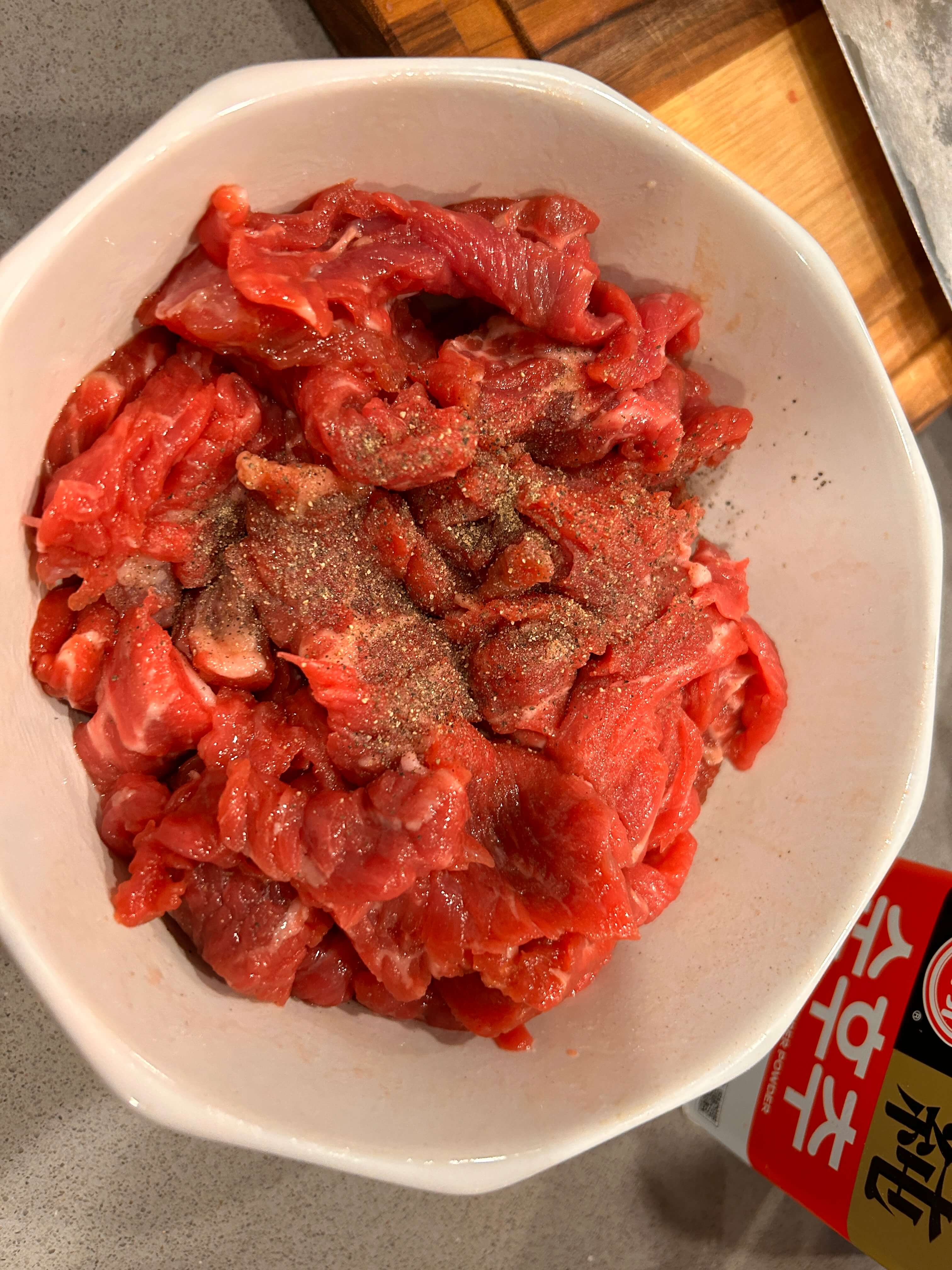 2. 일부 고기를 그릇에 담아 소금과 설탕, 참기름 살짝으로 양념해 줍니다.