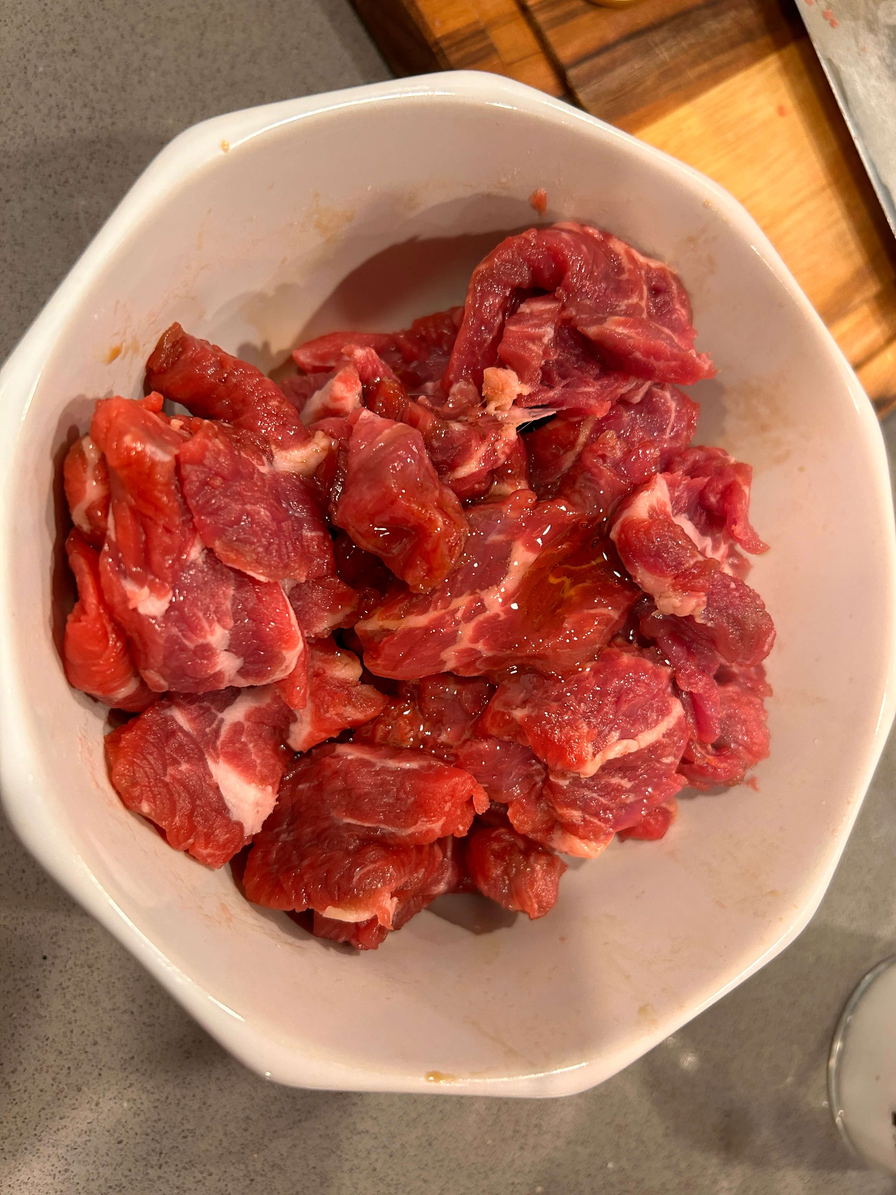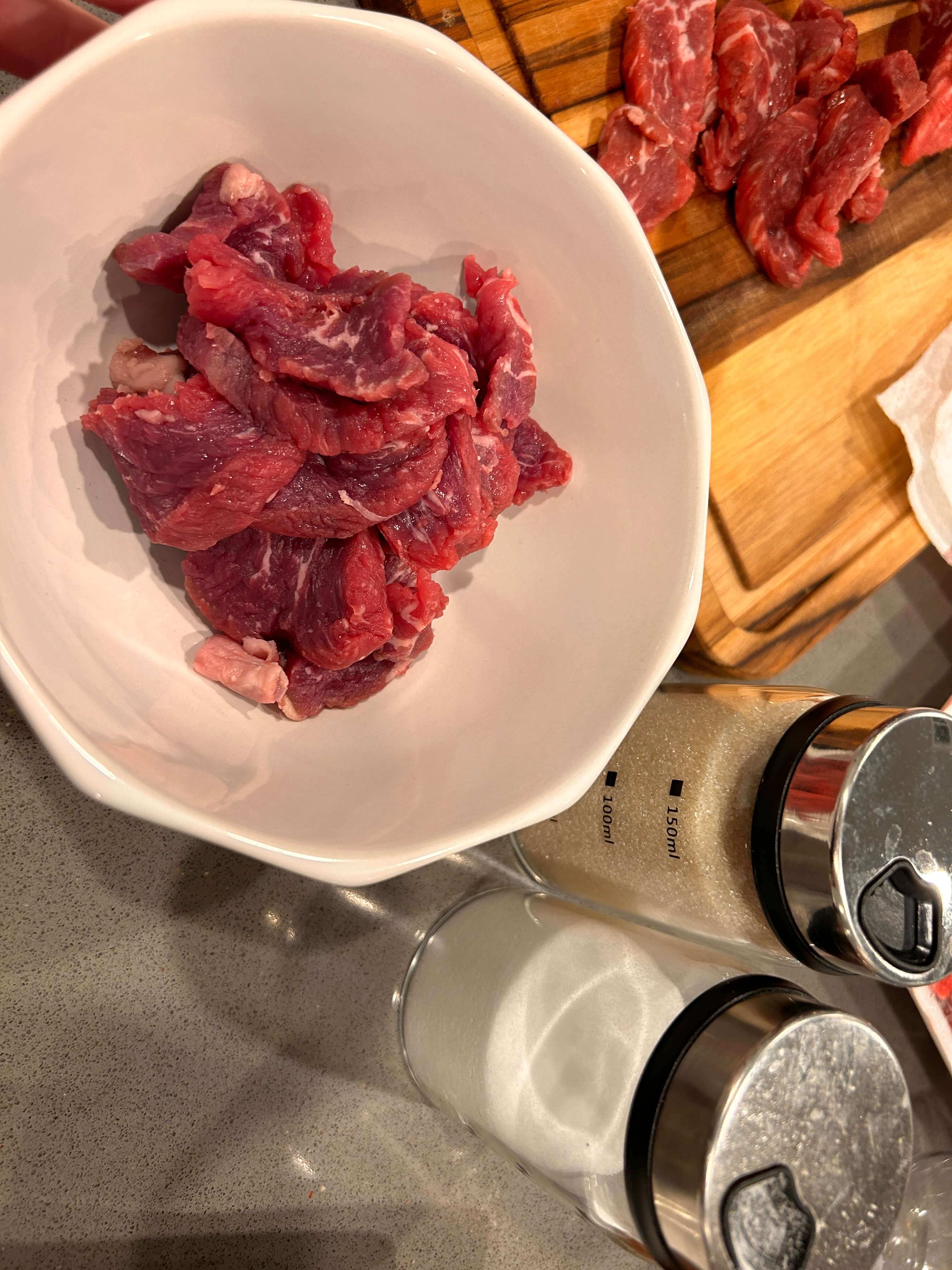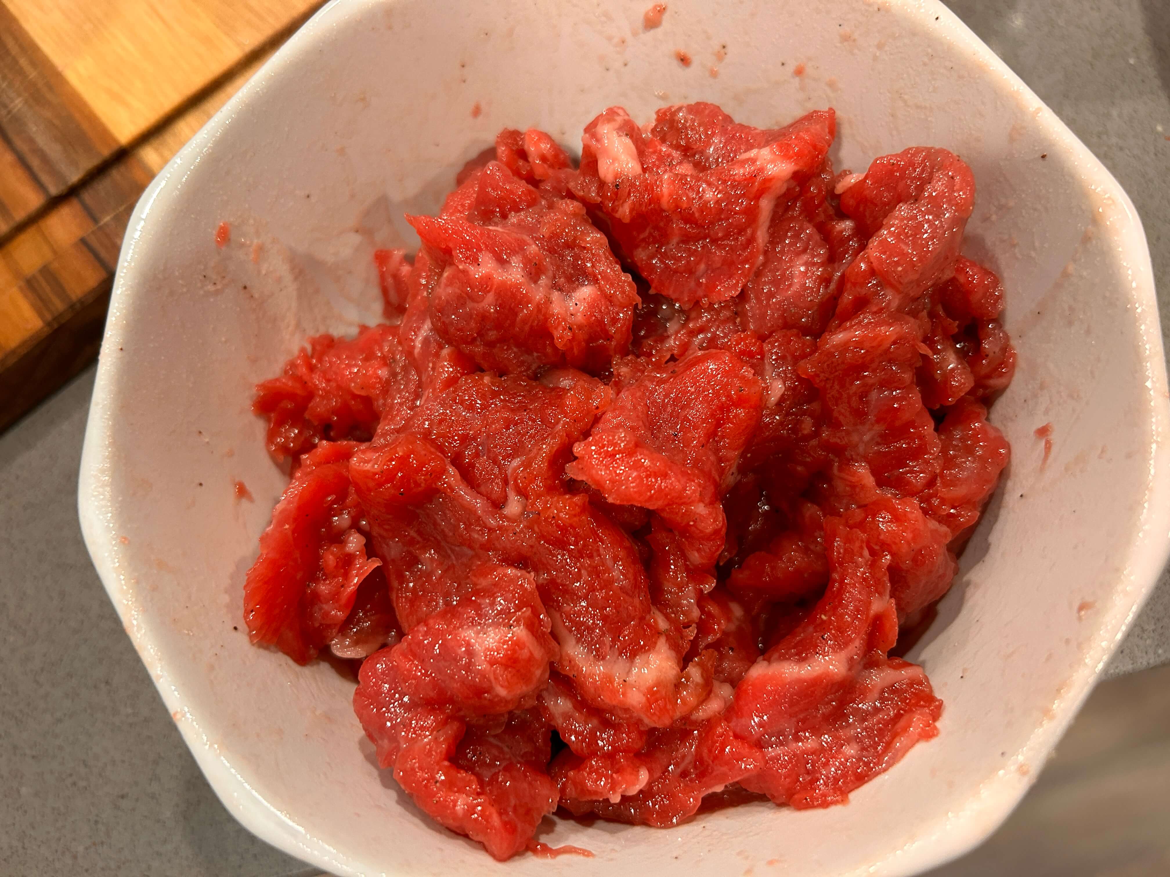 2. 일부 고기를 그릇에 담아 소금과 설탕, 참기름 살짝으로 양념해 줍니다.