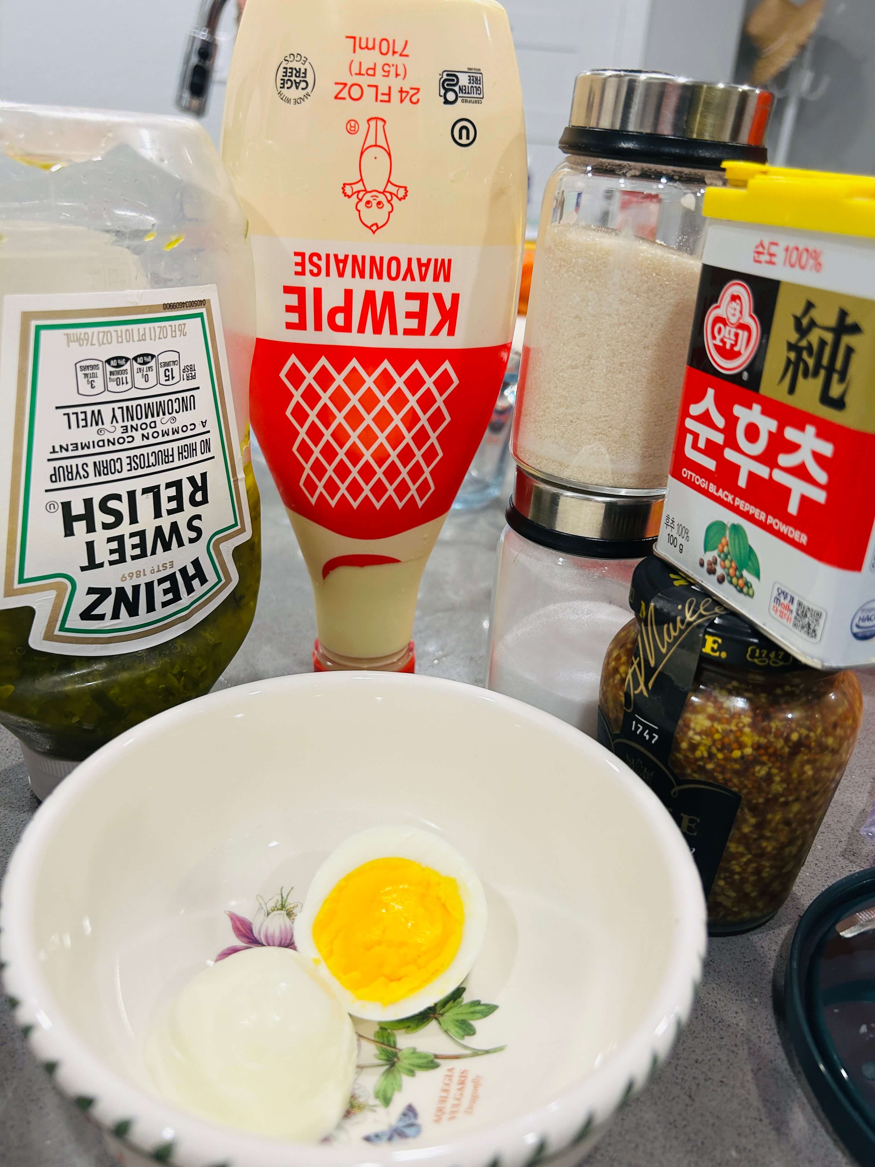 13. 새우버거 소스재료로 삶은 계란, 마요네즈, 피클, 설탕, 소금, 후추, 홀그레인머스터드를 준비해 줍니다.
