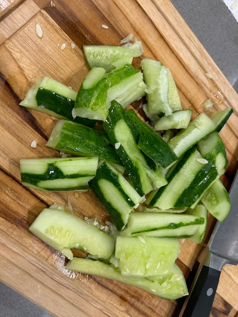 2. 칼등으로 오이를 탕탕 내리쳐 쪼개줍니다.