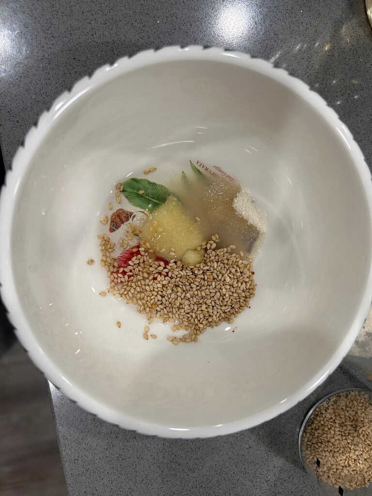 4. 마늘 1숟갈, 식초 2 숟갈, 설탕 2 숟갈, 깨 1 숟갈을 넣어 소스를 준비해 줍니다.