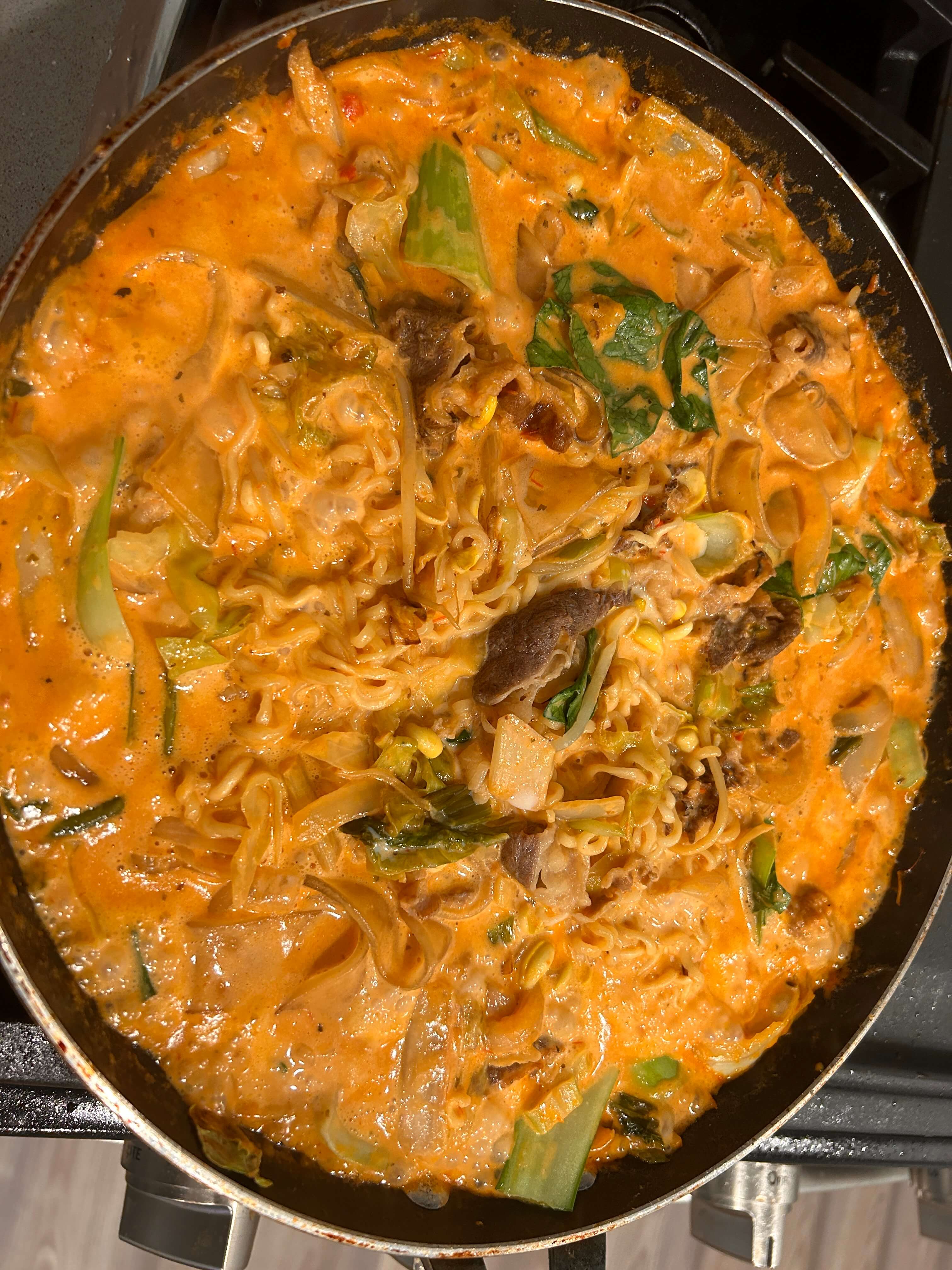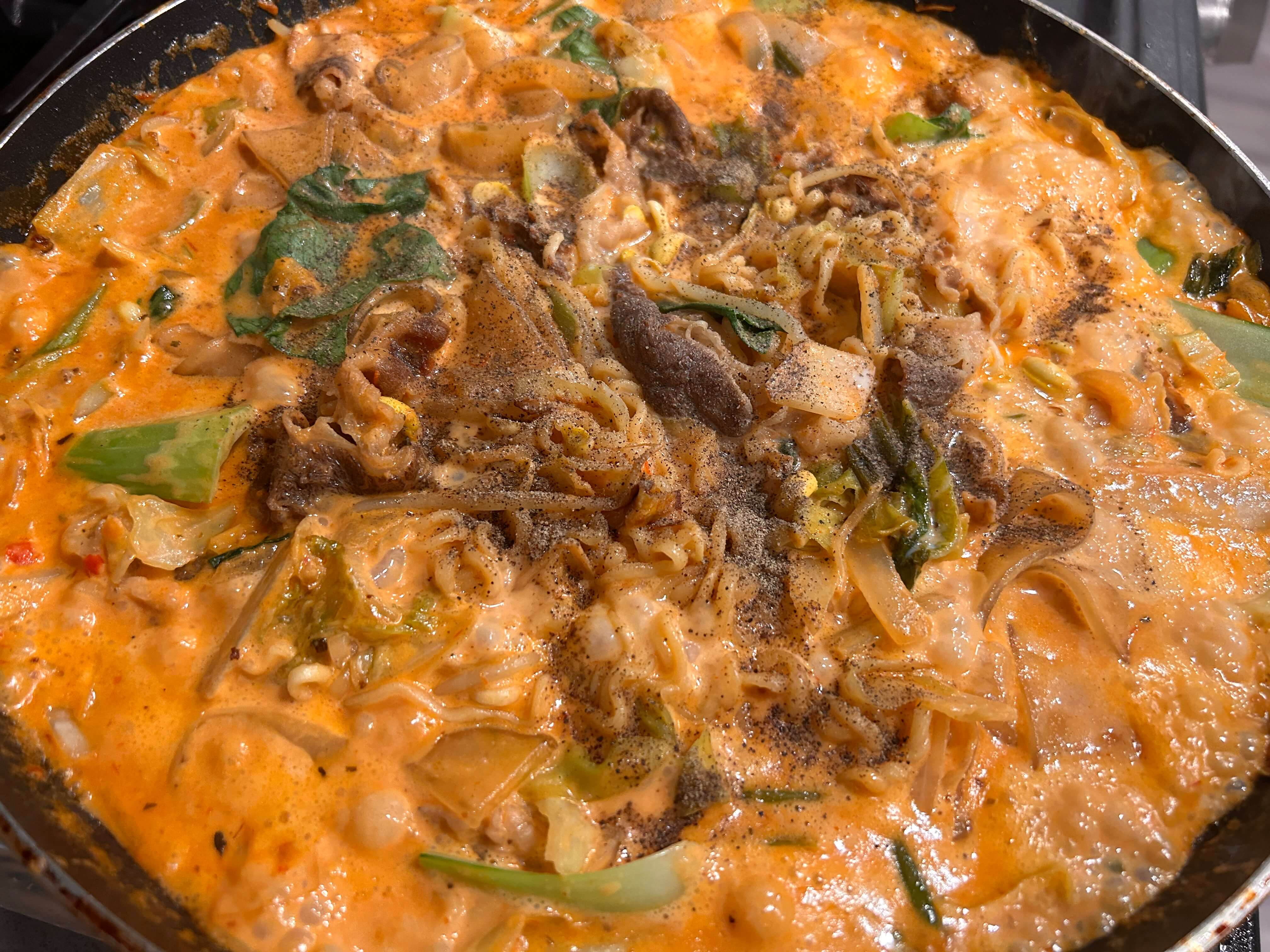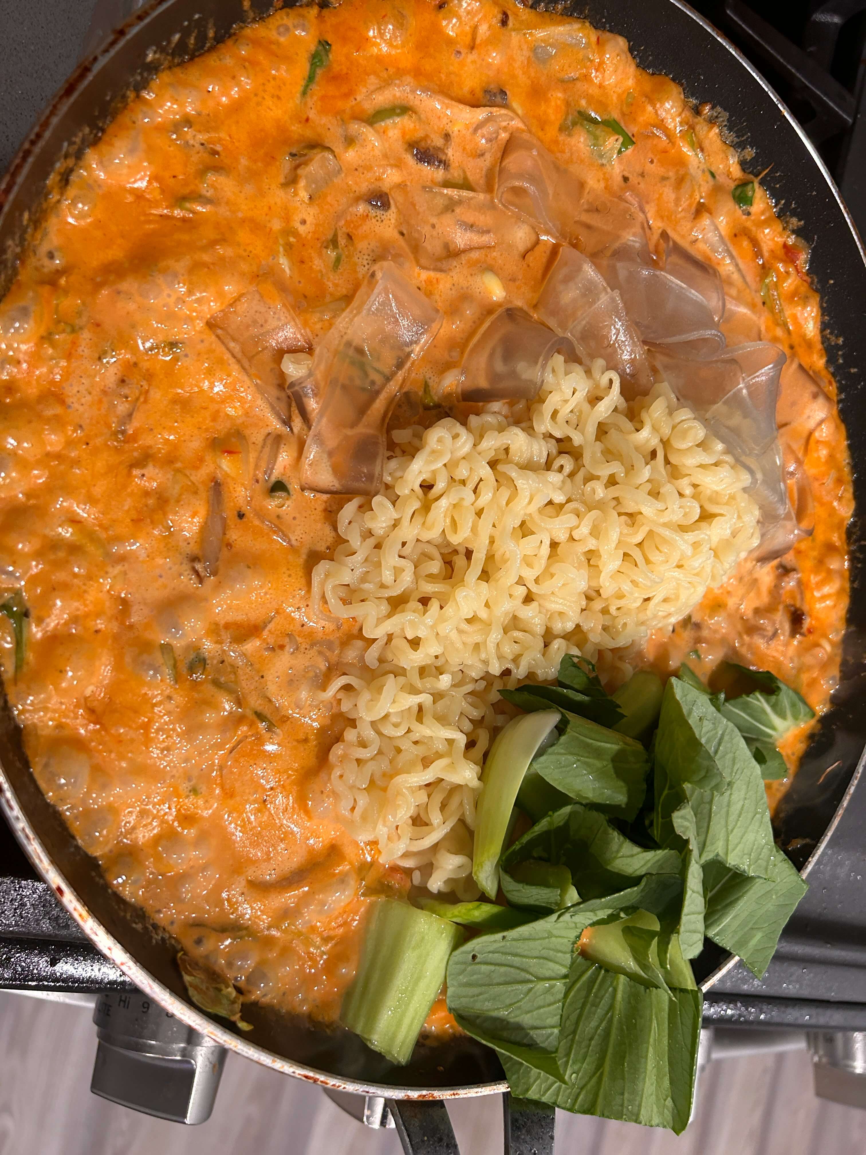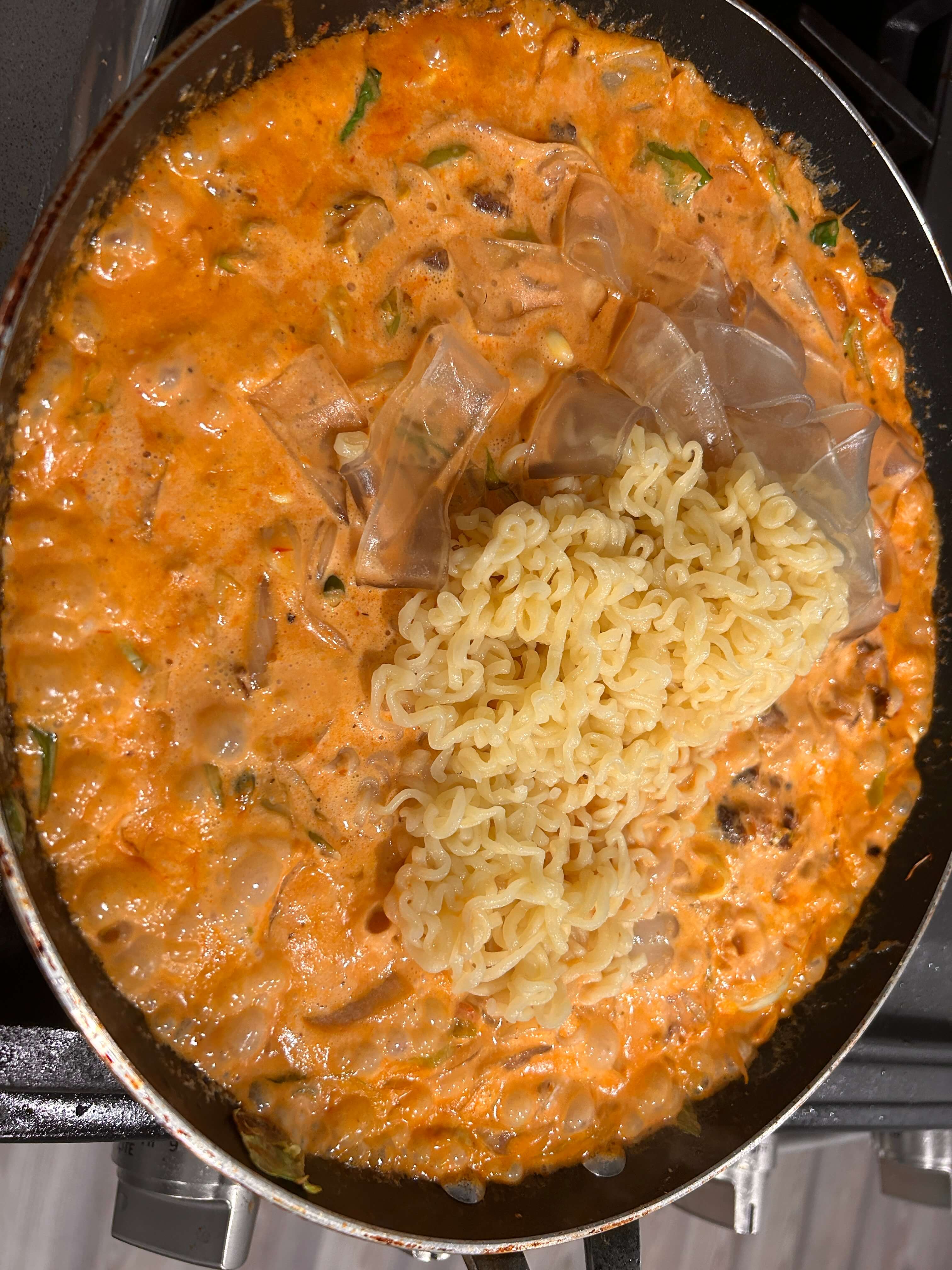 9. 라면사리와 넙적 당면을 넣어 잘 익혀줍니다.