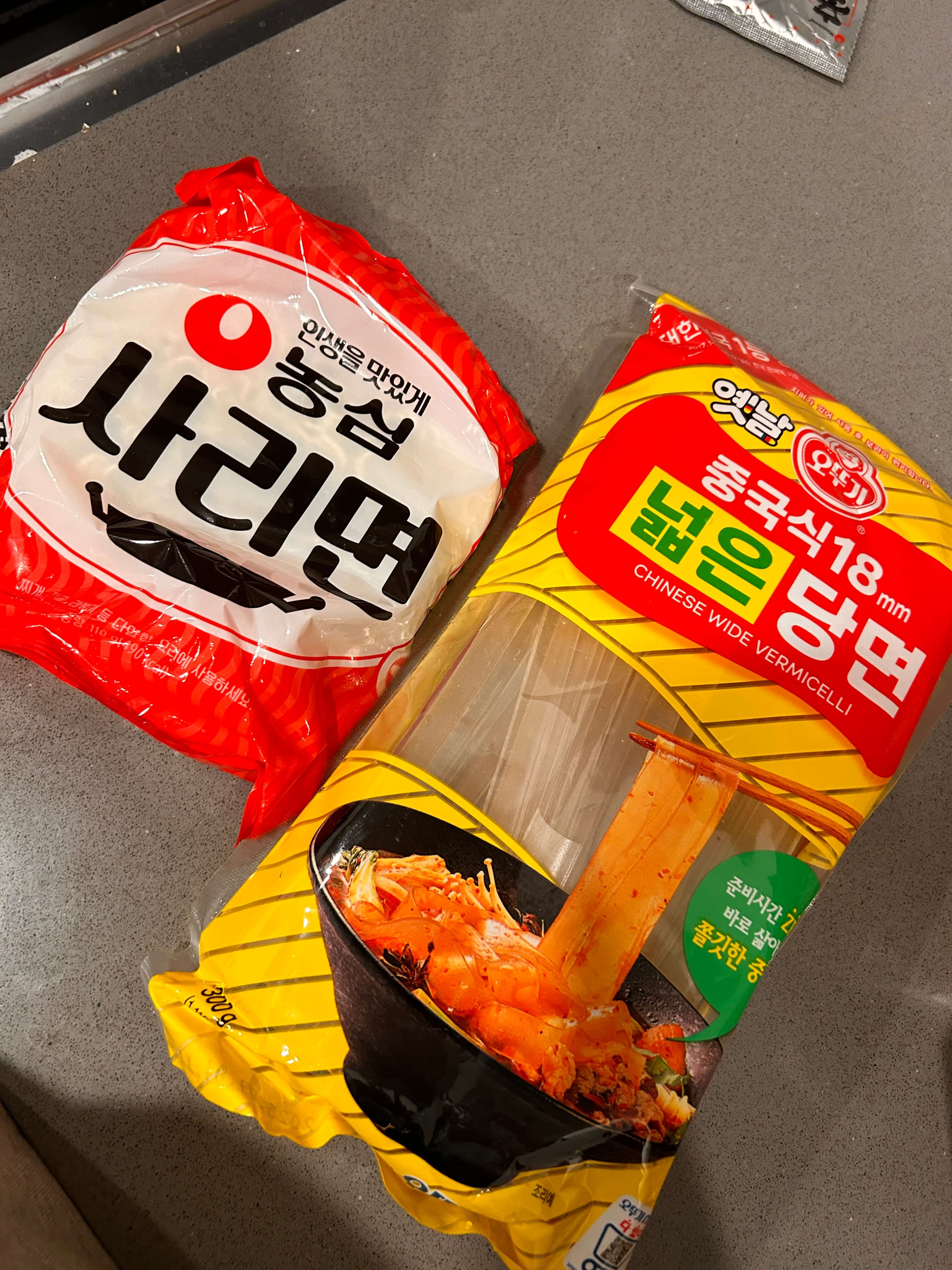 2. 라면사리와 넙적 당면도 살짝 데쳐서 준비해 줍니다.
