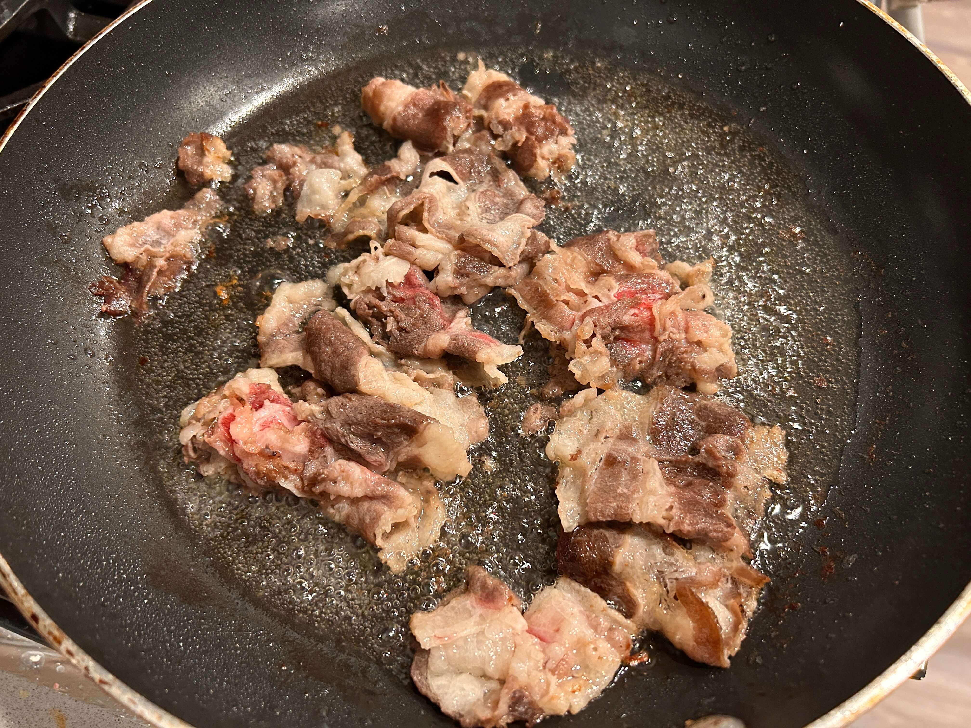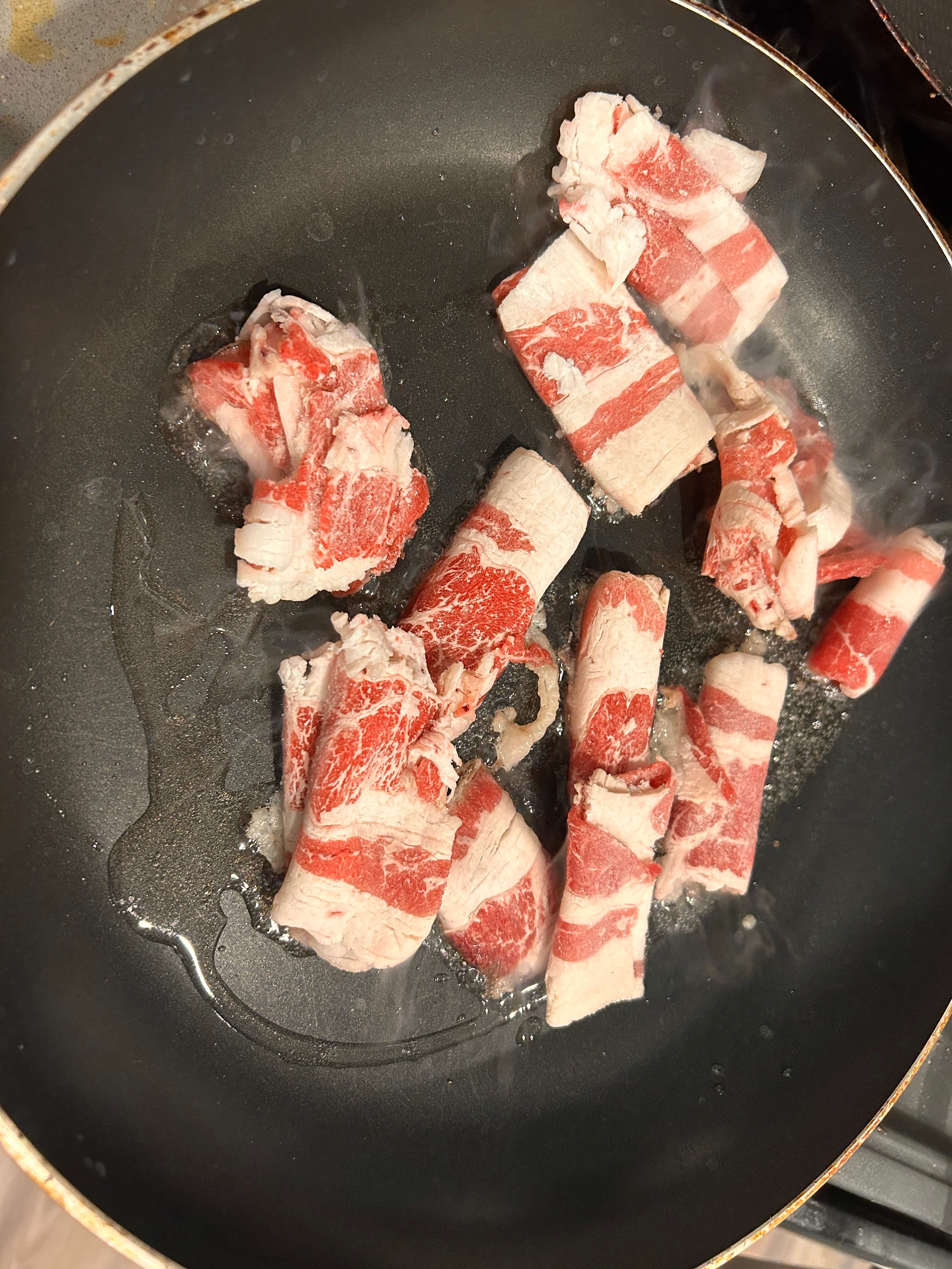 3. 큰 팬에 기름을 살짝 두르고 우삼겹을 볶아줍니다.