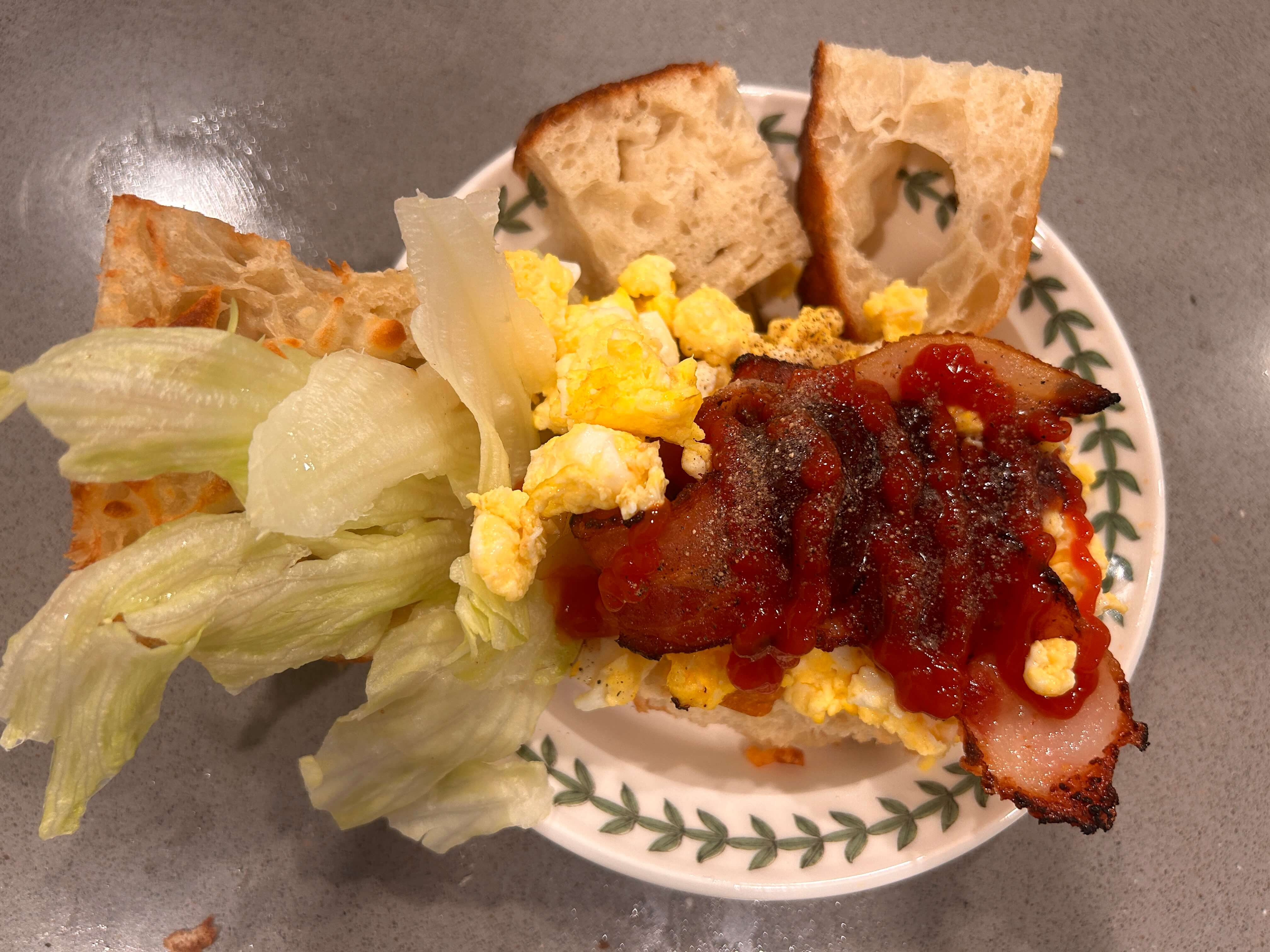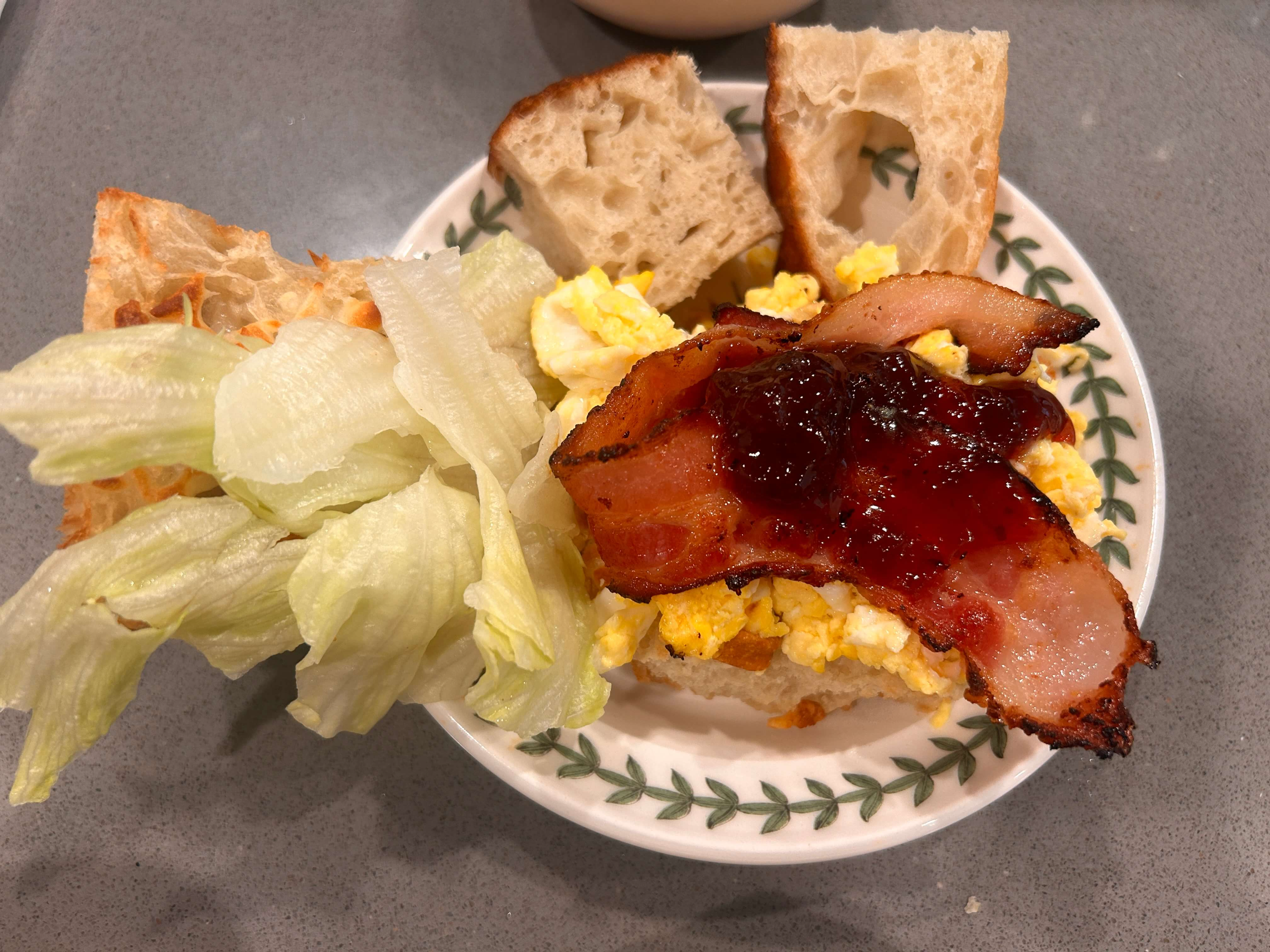 6. 그 위에 스크램블, 베이컨, 양상추를 올려 줍니다.