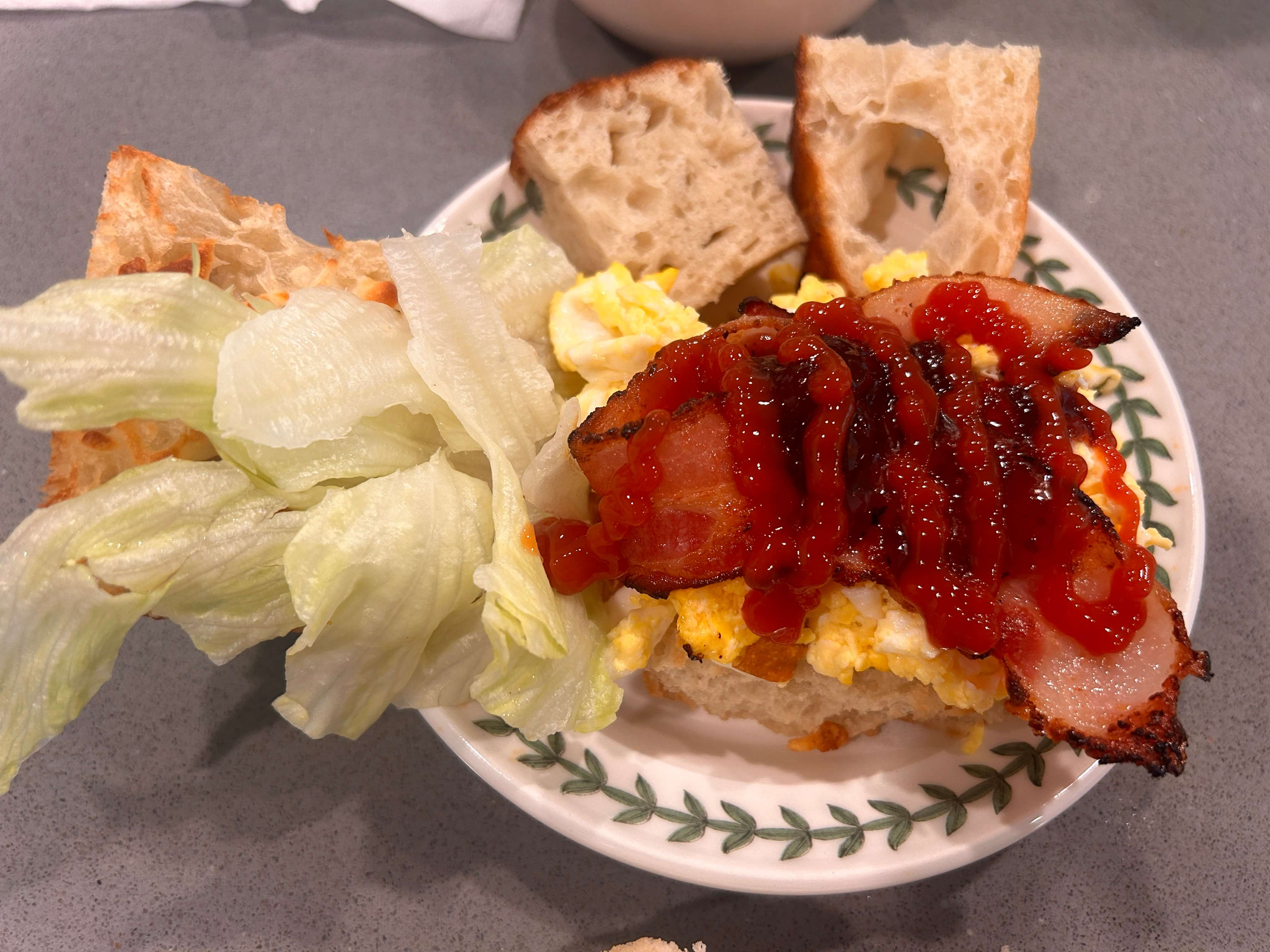6. 그 위에 스크램블, 베이컨, 양상추를 올려 줍니다.