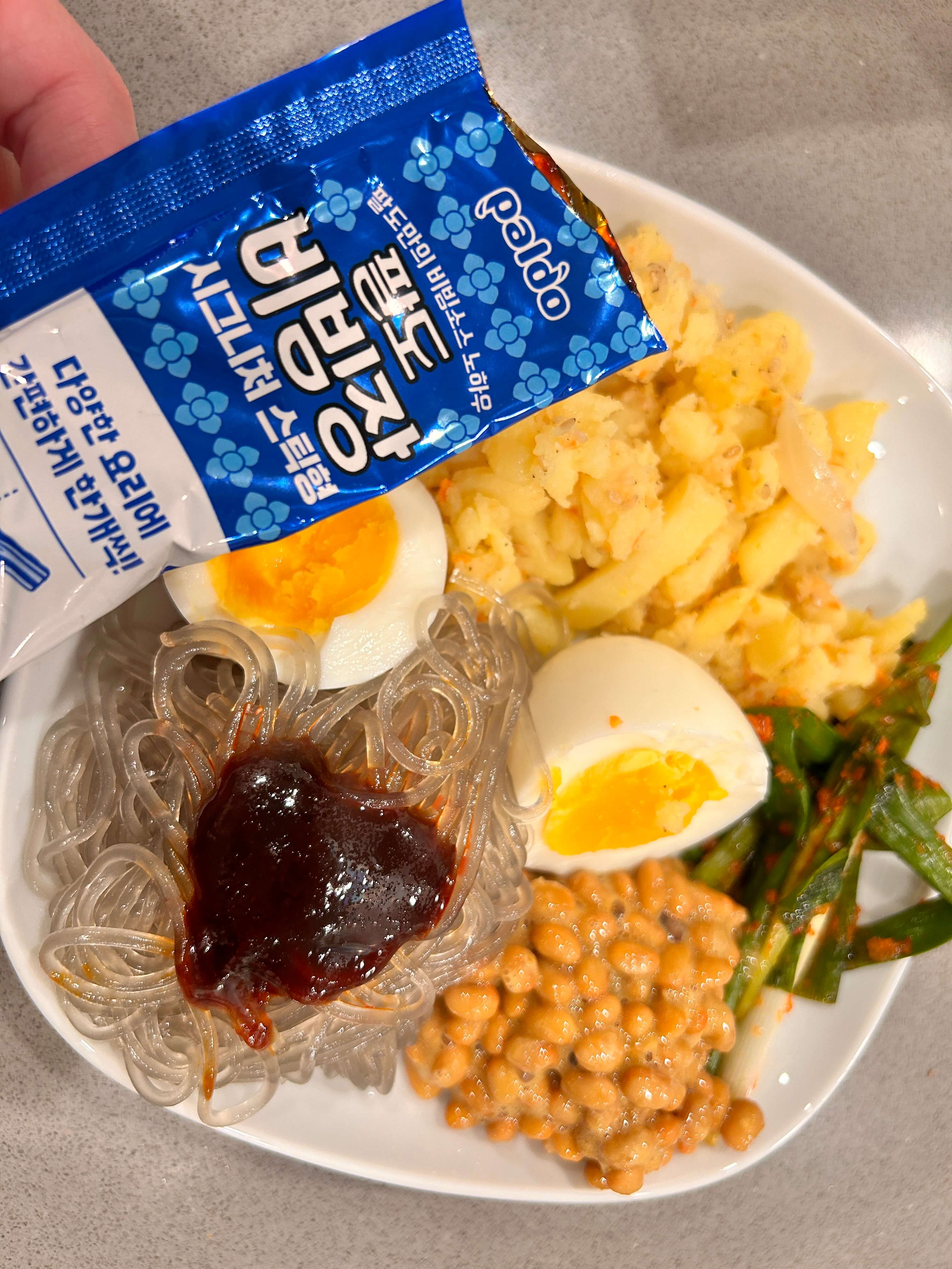나또 먹을 때, 이렇게 팔도비빔 당면과 파김치, 계란 등등을 먹었습니다.