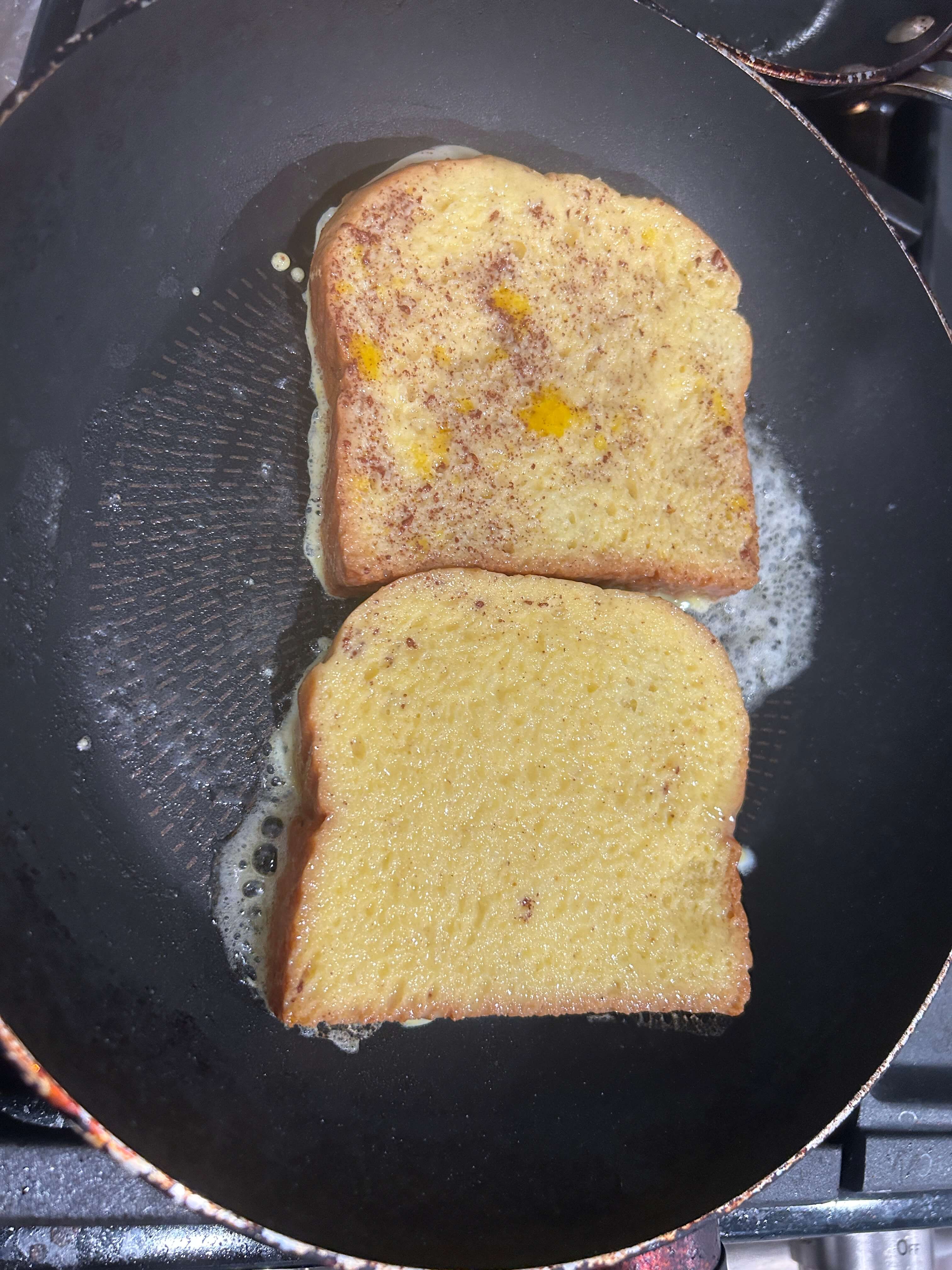 4. 팬에 버터를 두르고 식빵을 앞뒤로 잘 구워줍니다.