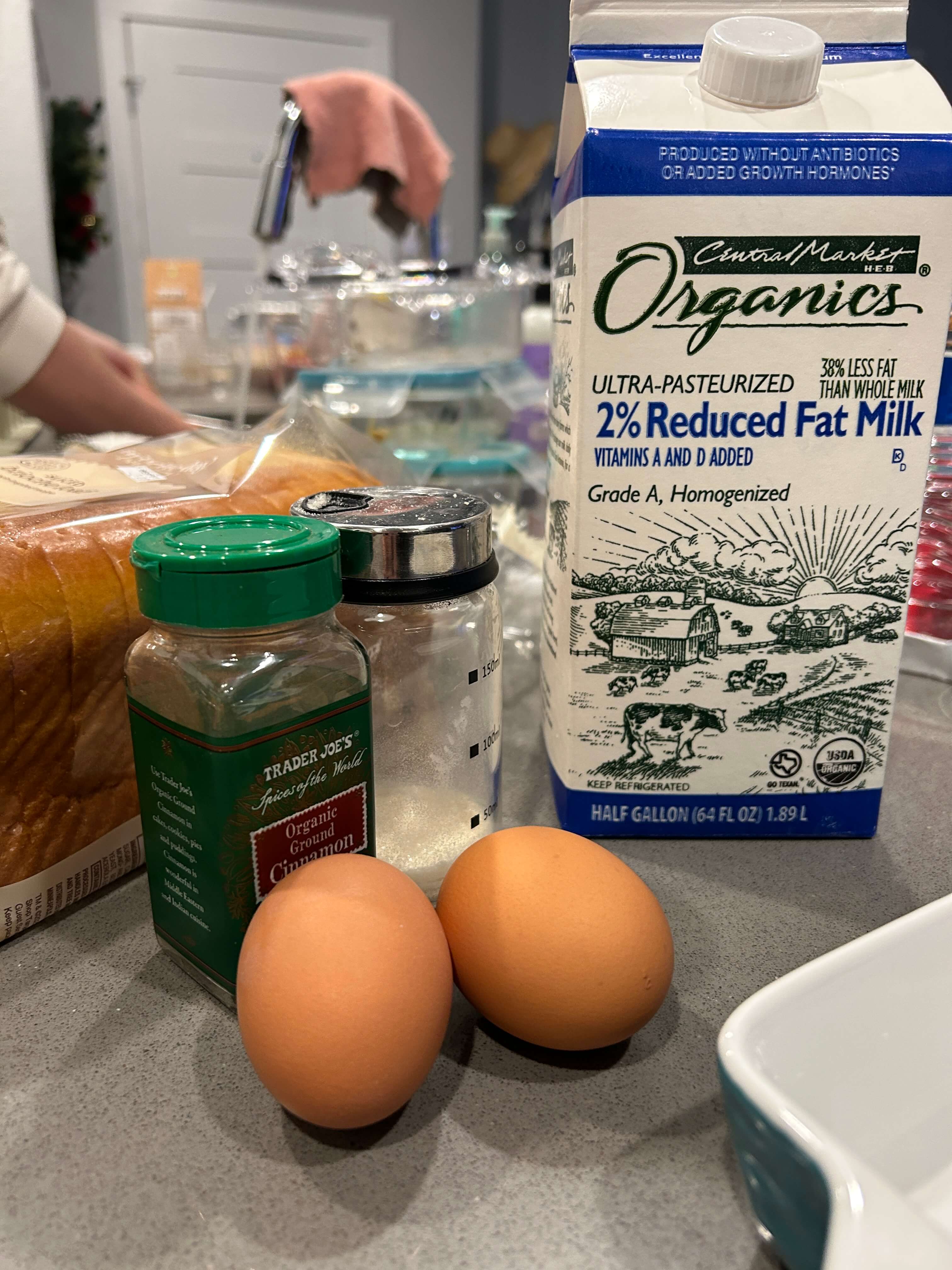 1. 프렌치토스트 재료인, 식빵, 게란, 우유, 시나몬가루, 설탕을 준비해 줍니다.