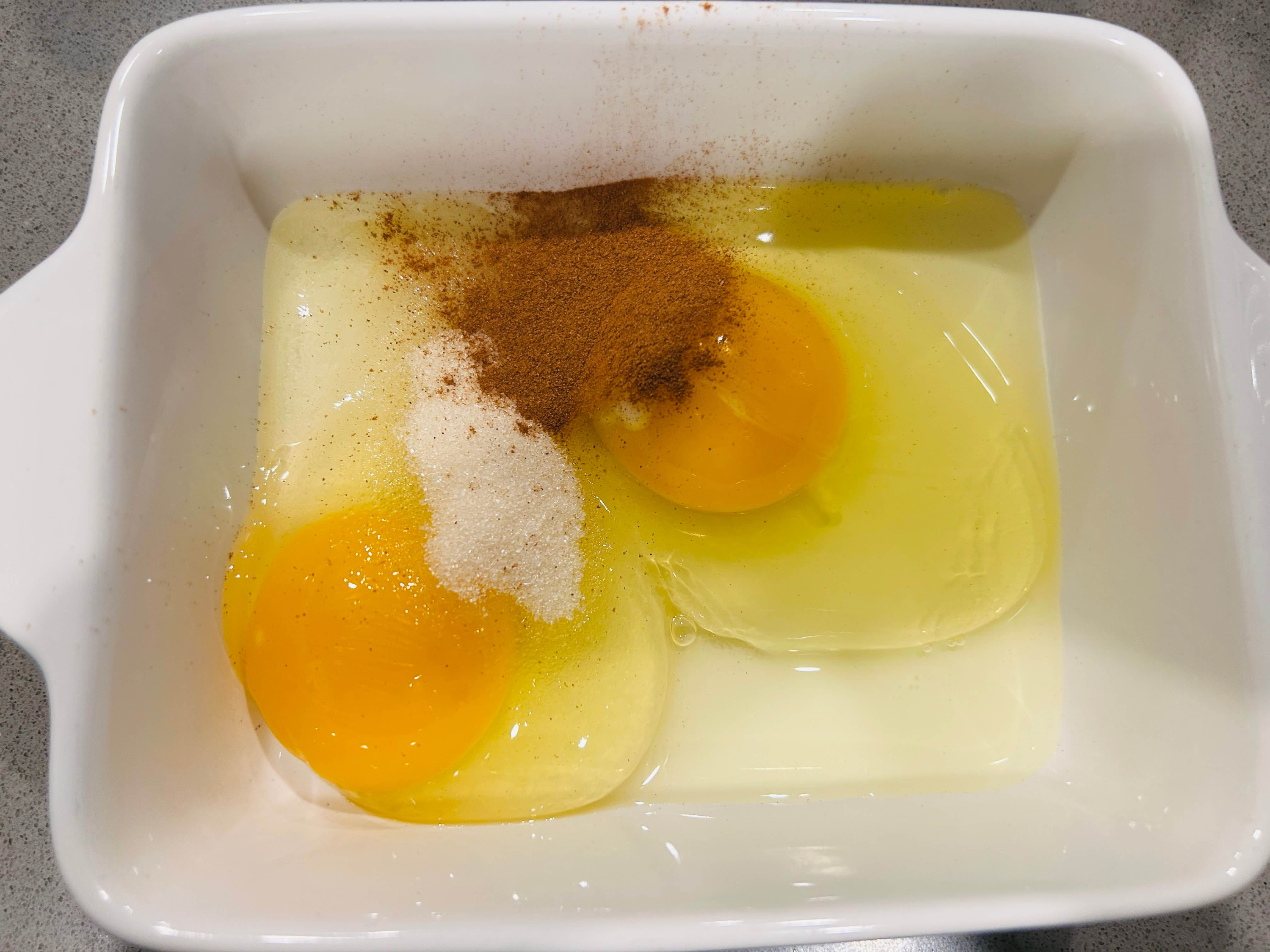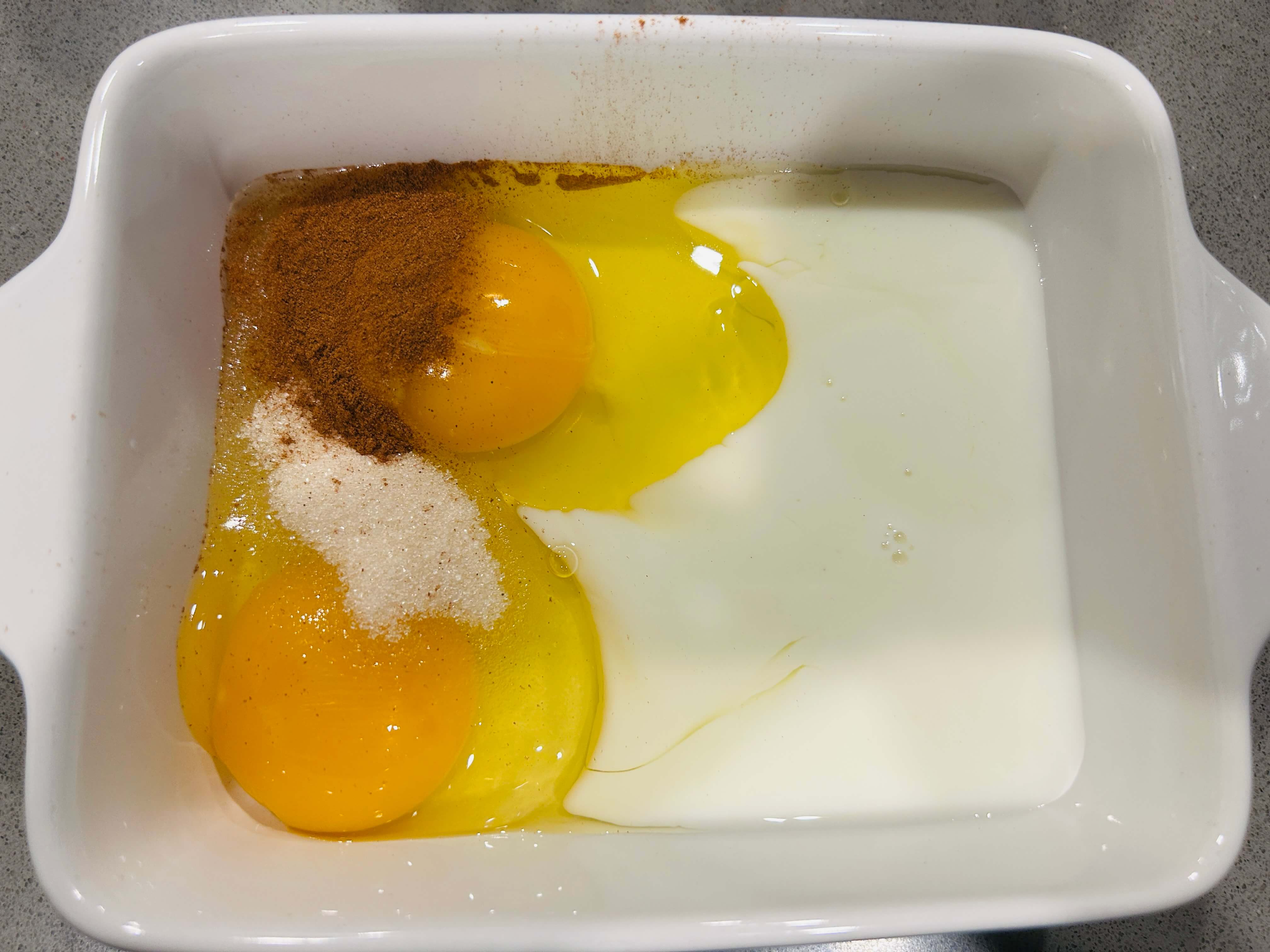 2. 그릇에 계란 두 개, 설탕, 시나몬가루, 우유를 넣고 잘 섞어줍니다.