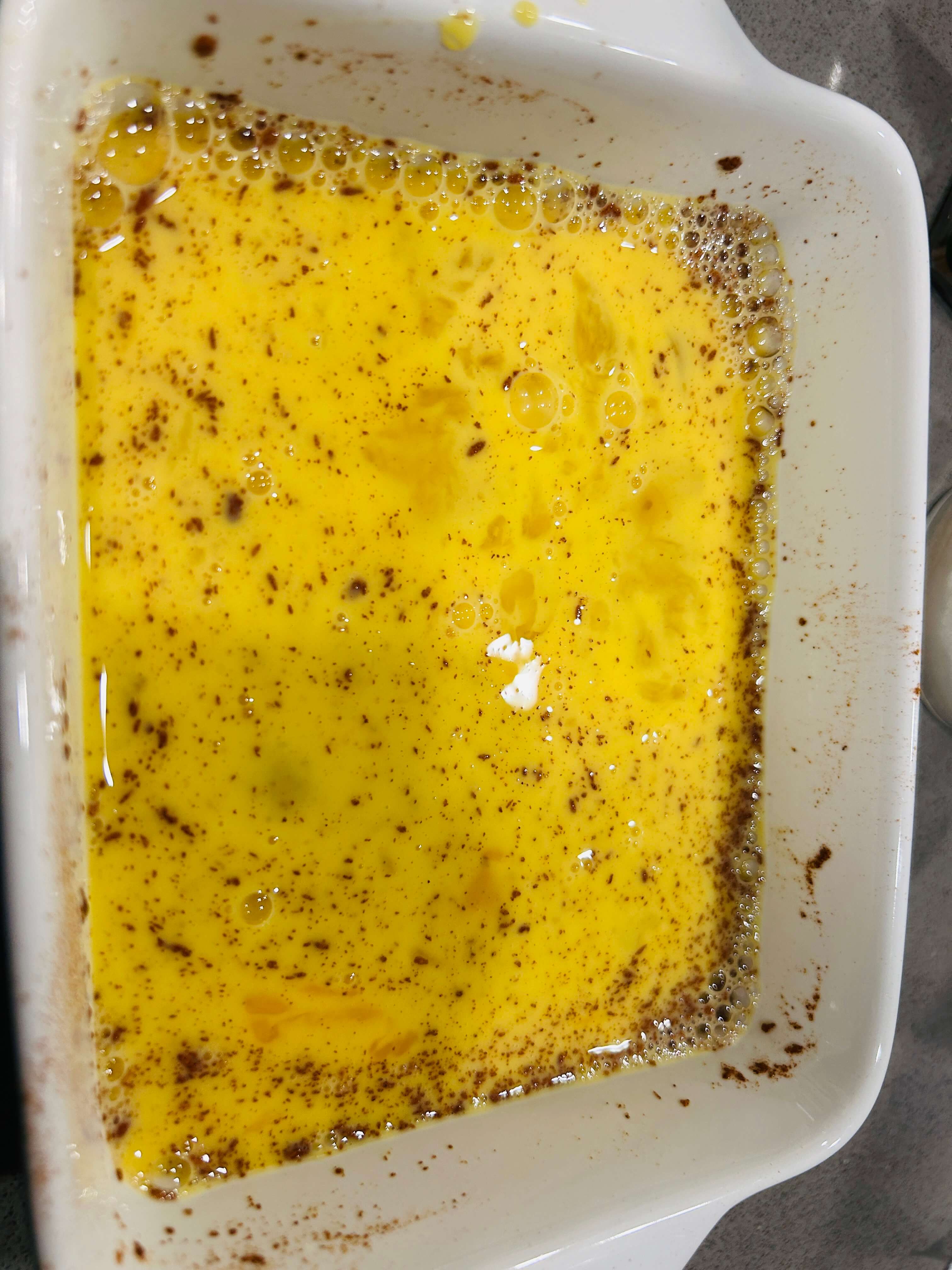 2. 그릇에 계란 두개, 설탕, 시나몬가루, 우유를 넣고 잘 섞어줍니다.