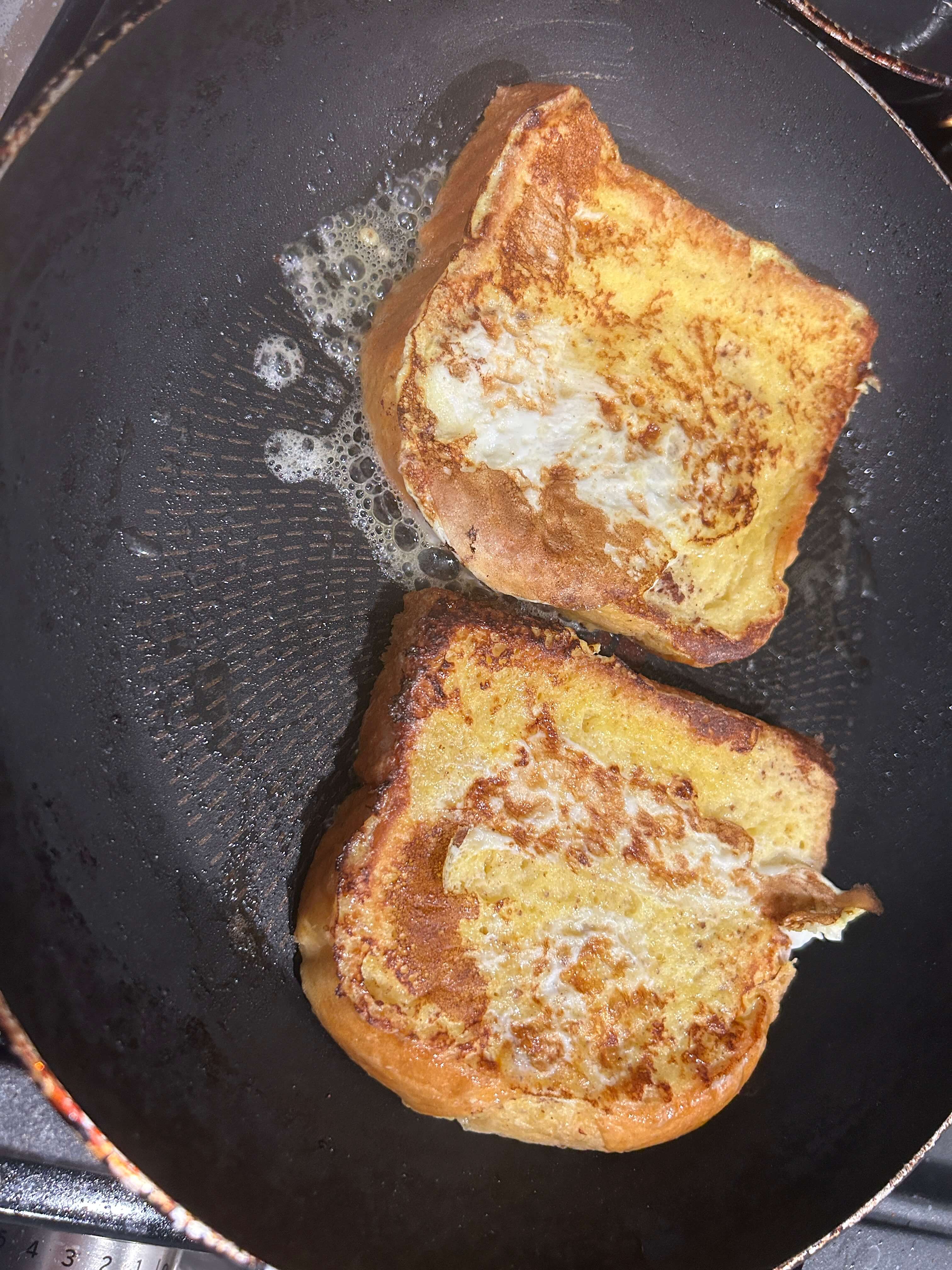 4. 팬에 버터를 두르고 식빵을 앞뒤로 잘 구워줍니다.