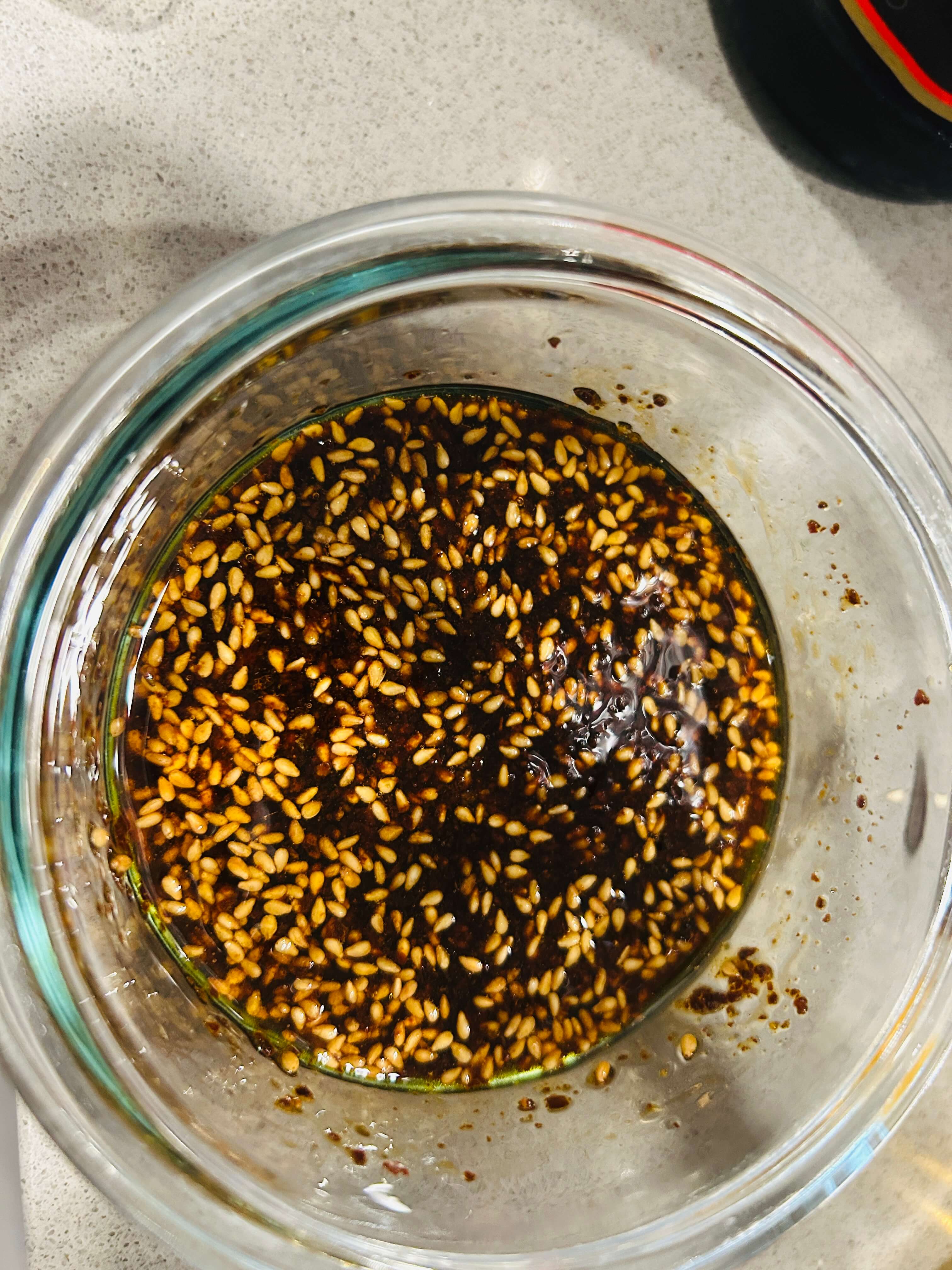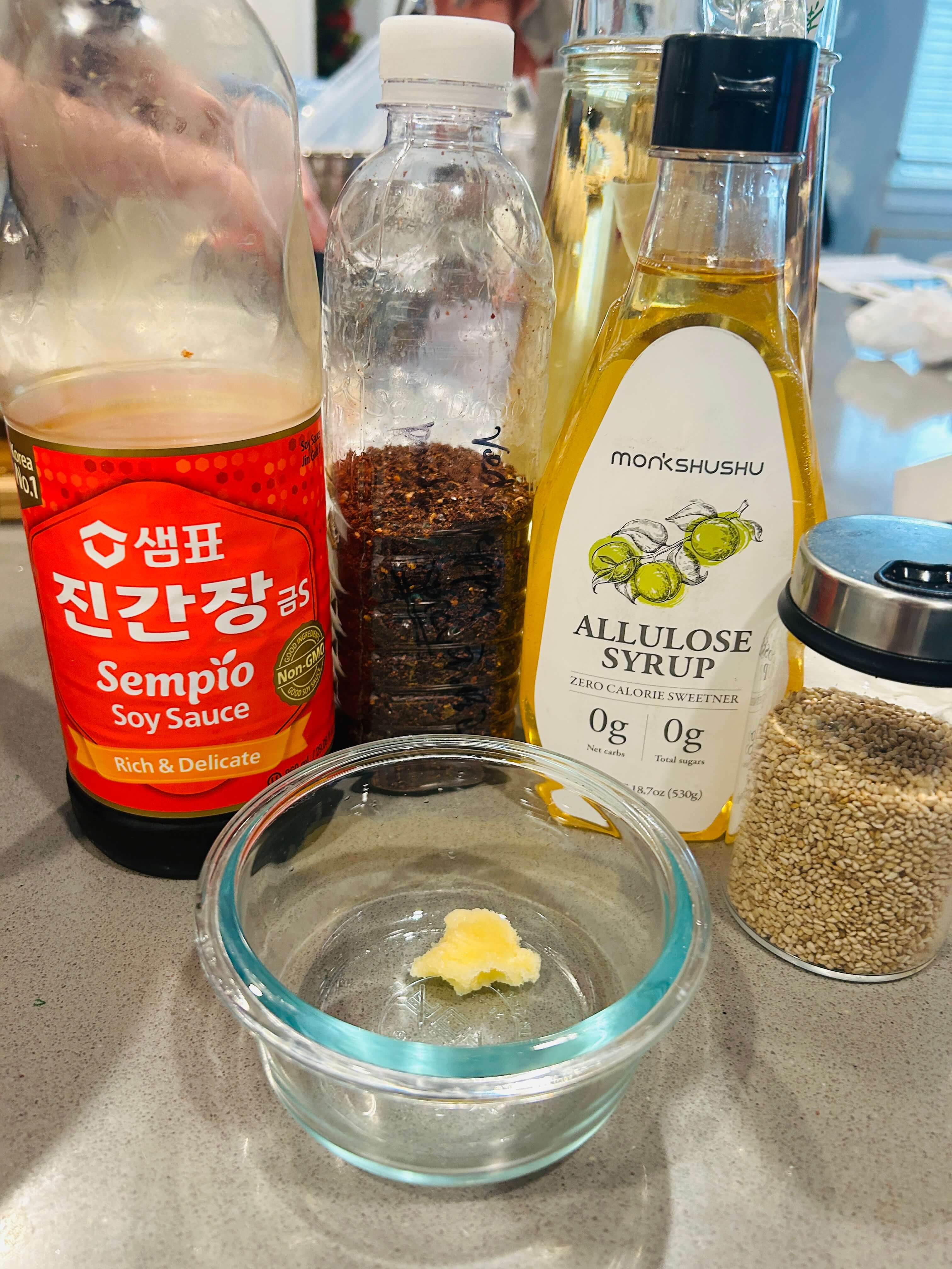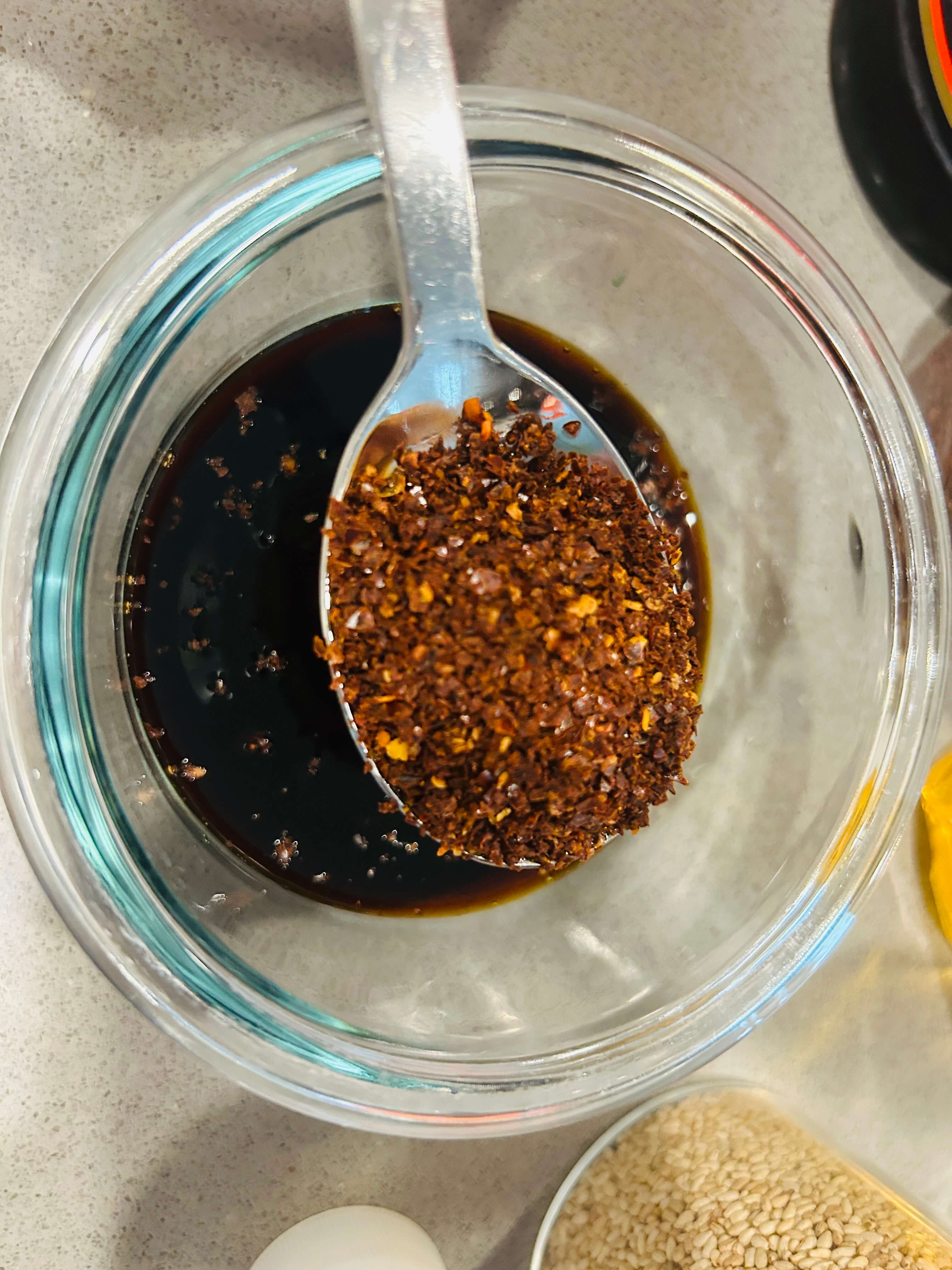16. 솥밥 양념장으로 다진 마늘 0.5, 간장 2, 알룰로스(설탕) 1, 고춧가루 2, 깨 1, 참기름 1 숟갈을 넣고 잘 섞어줍니다.