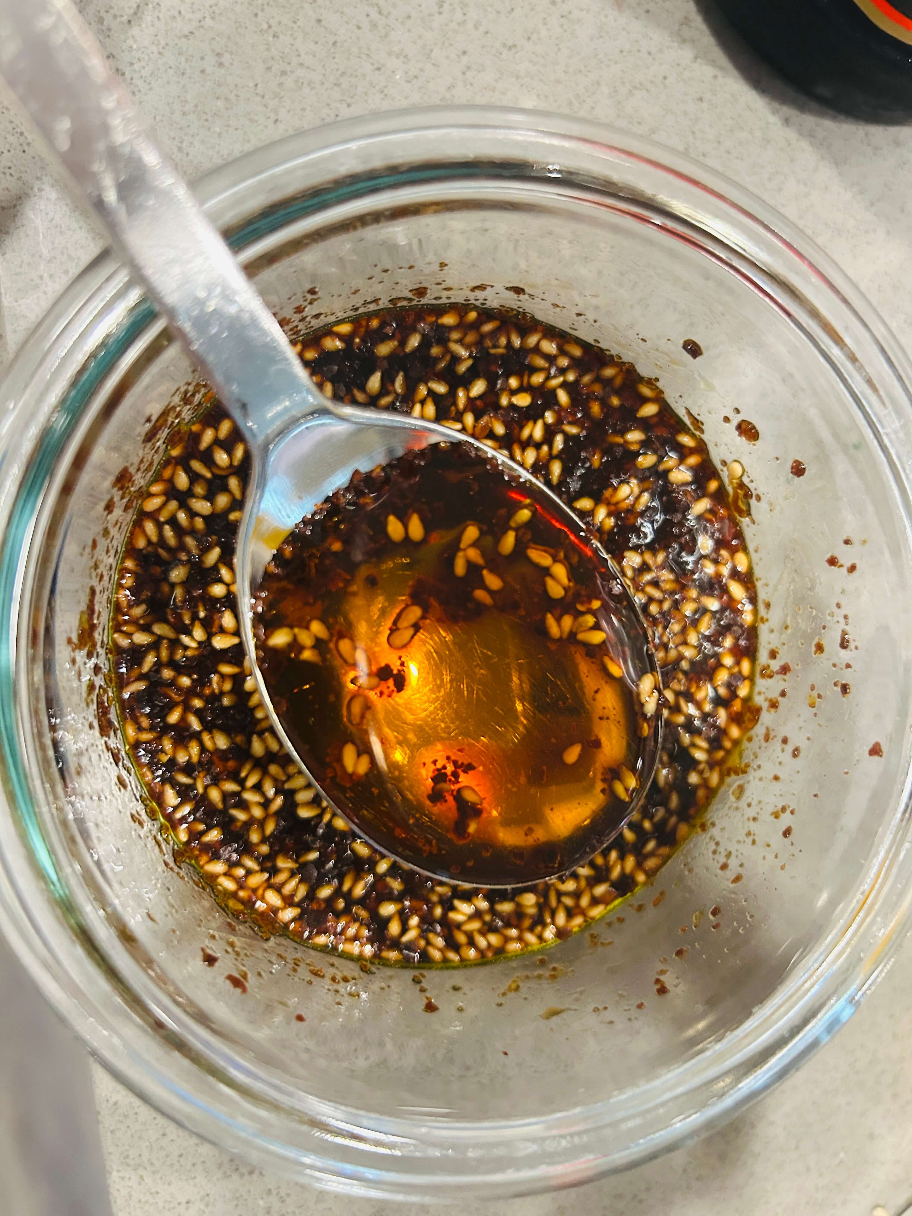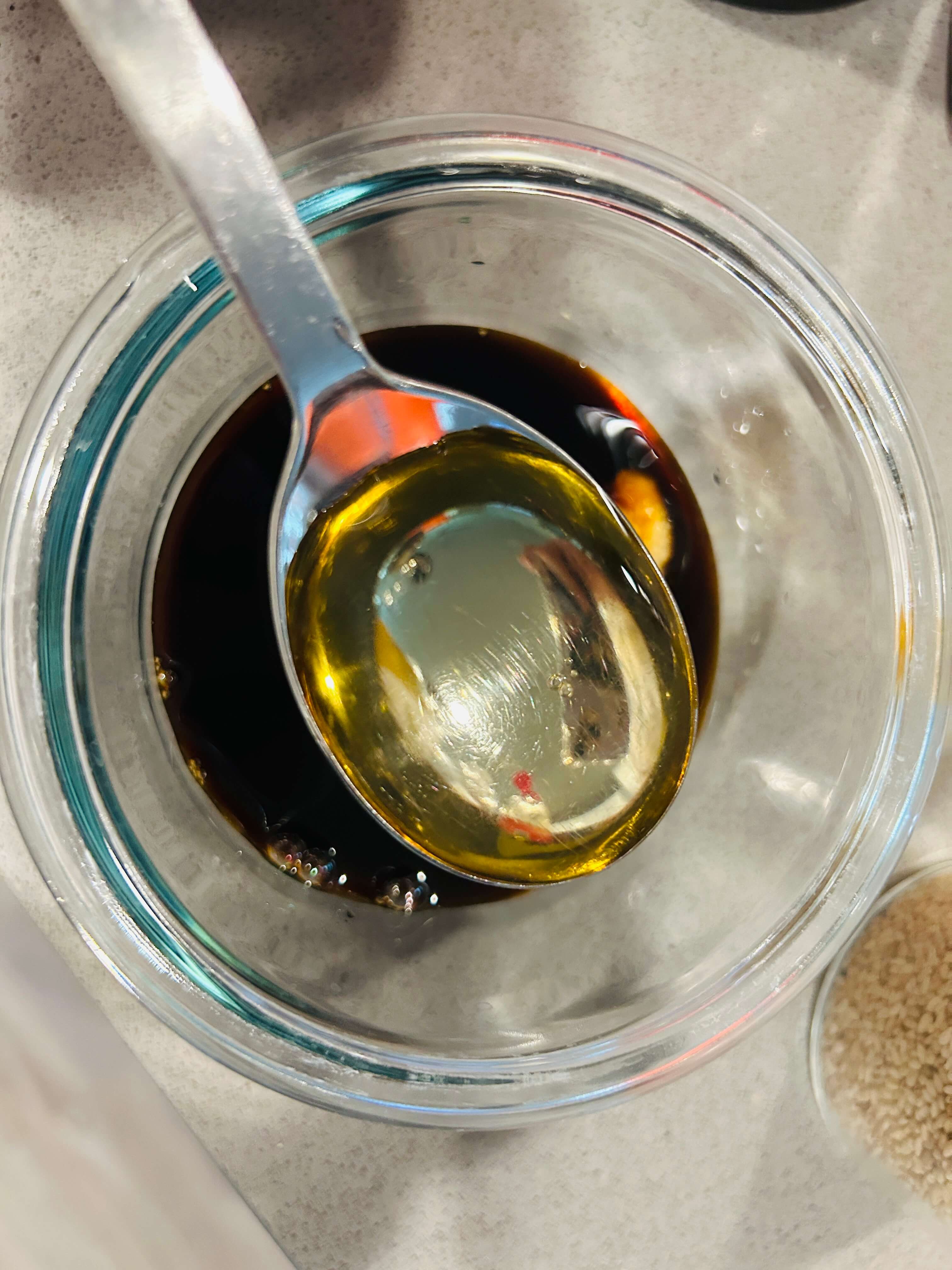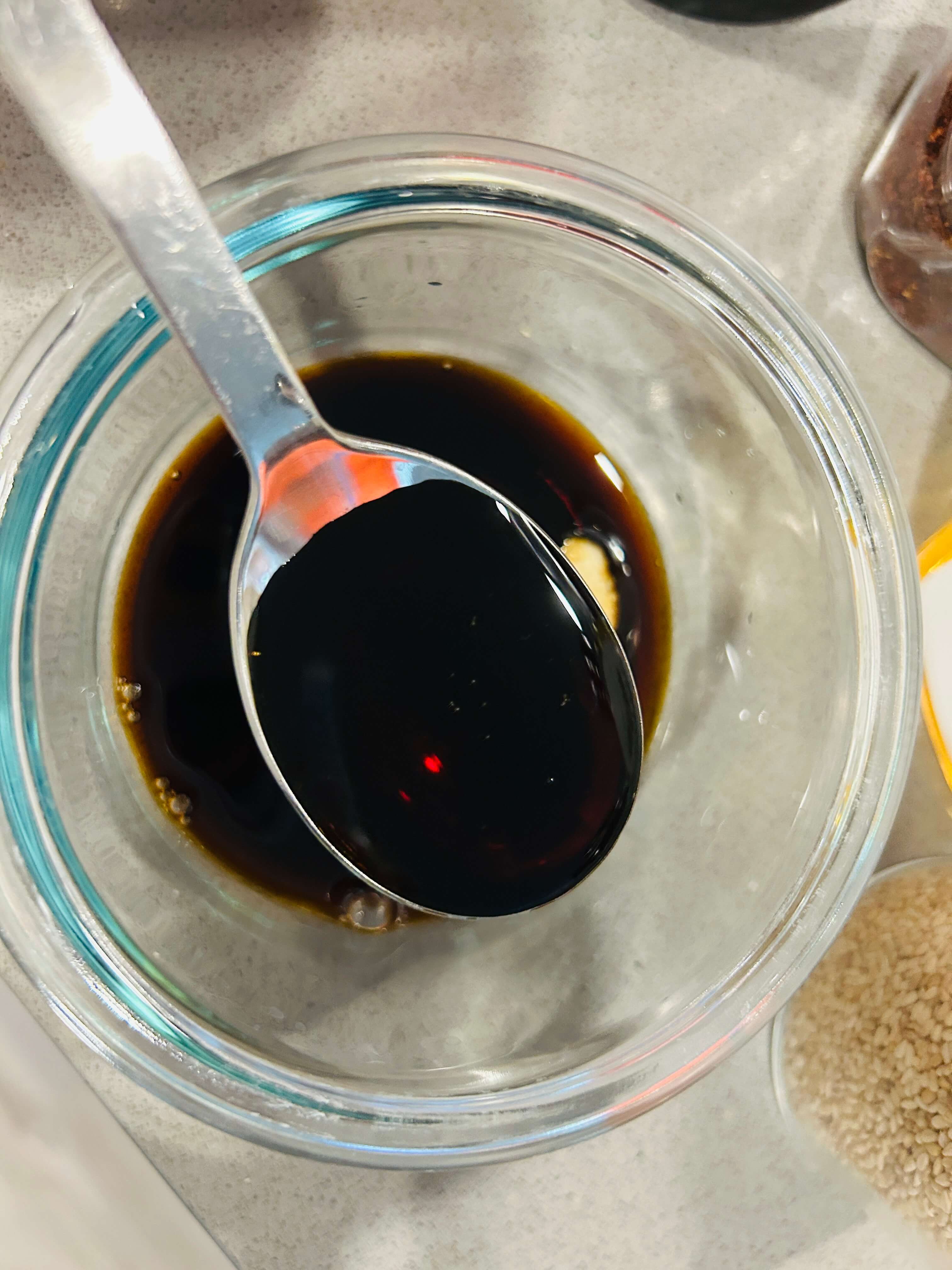 16. 솥밥 양념장으로 다진 마늘 0.5, 간장 2, 알룰로스(설탕) 1, 고춧가루 2, 깨 1, 참기름 1 숟갈을 넣고 잘 섞어줍니다.