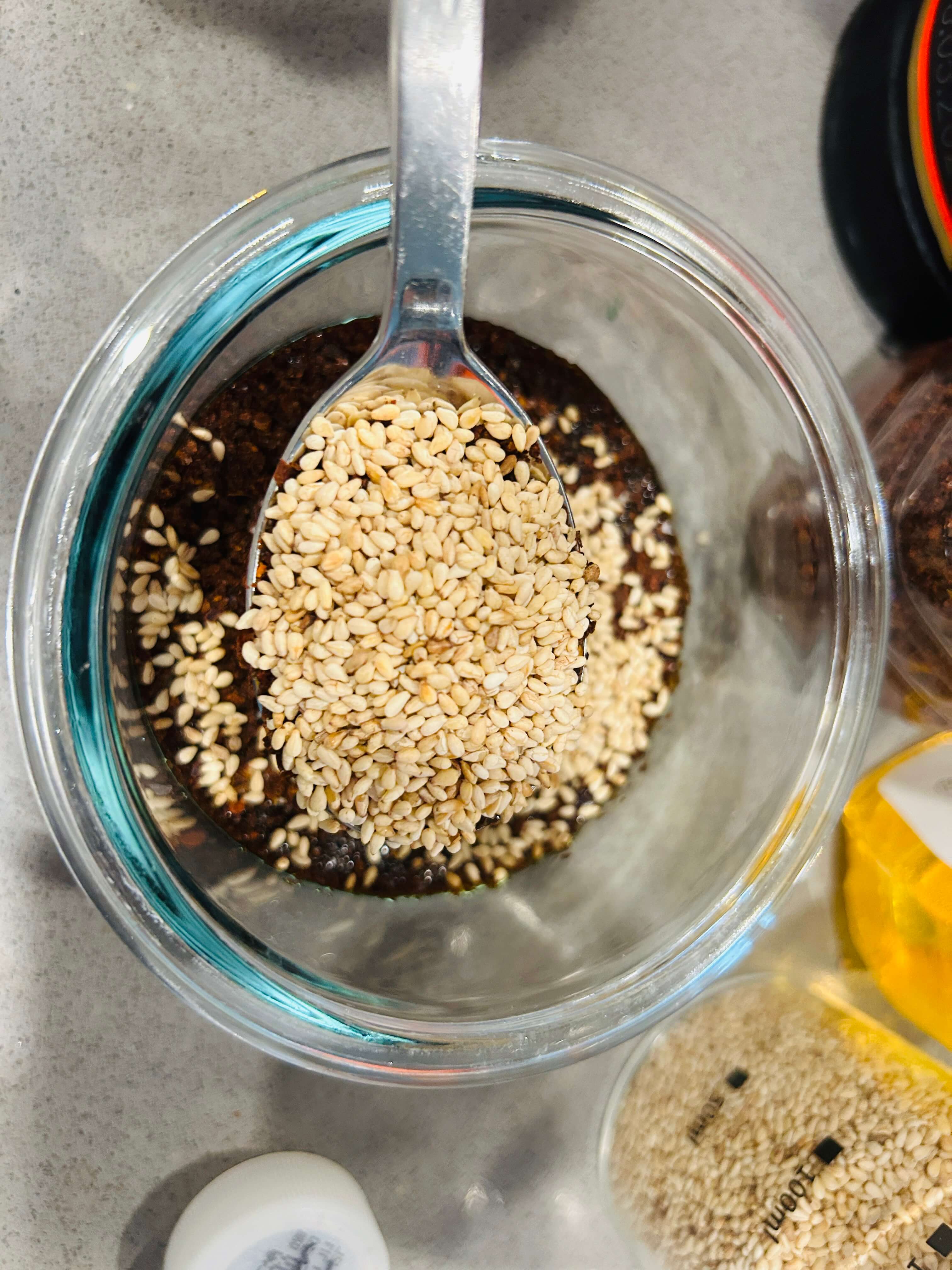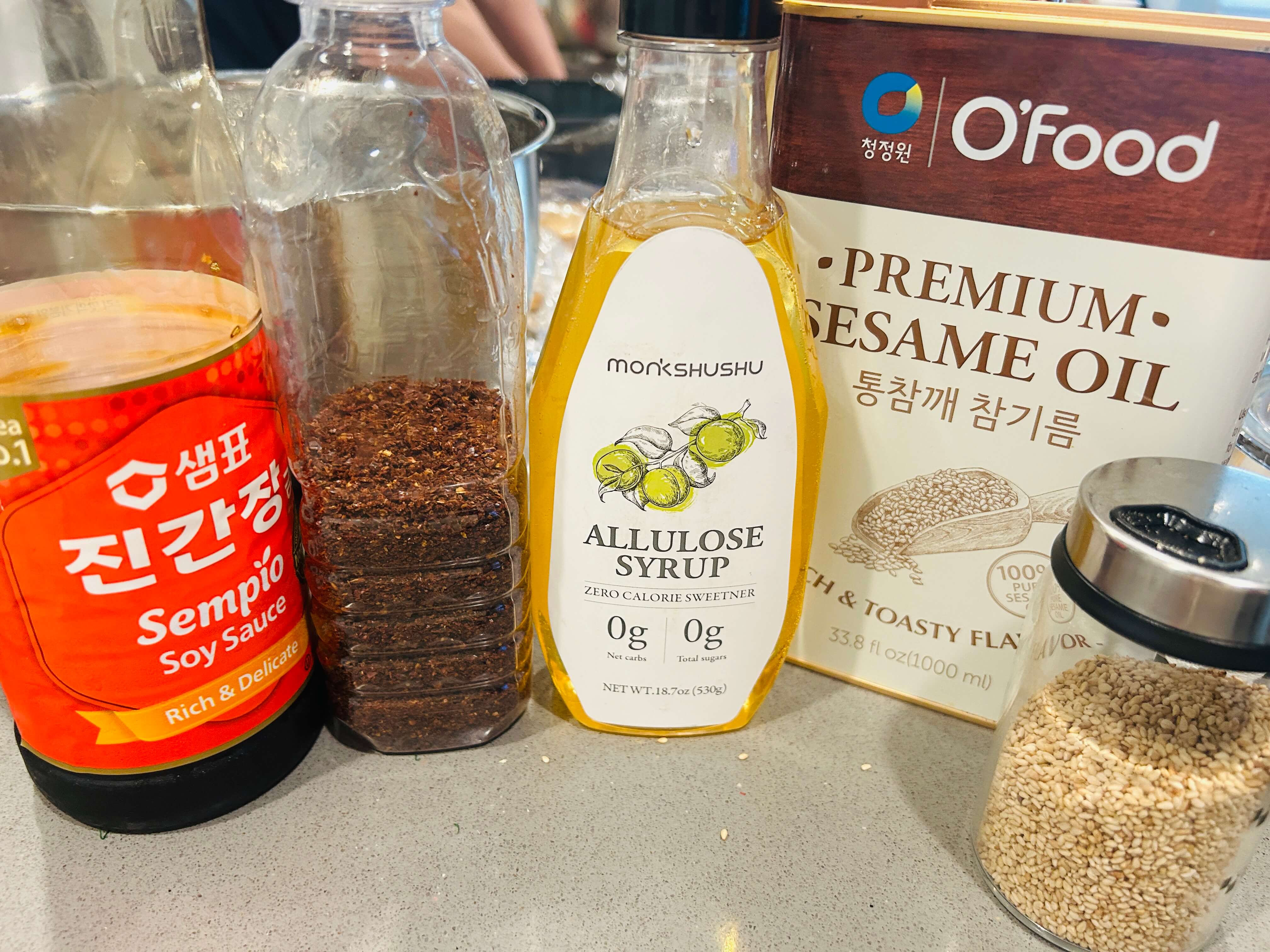 16. 솥밥 양념장으로 다진 마늘 0.5, 간장 2, 알룰로스(설탕) 1, 고춧가루 2, 깨 1, 참기름 1 숟갈을 넣고 잘 섞어줍니다.