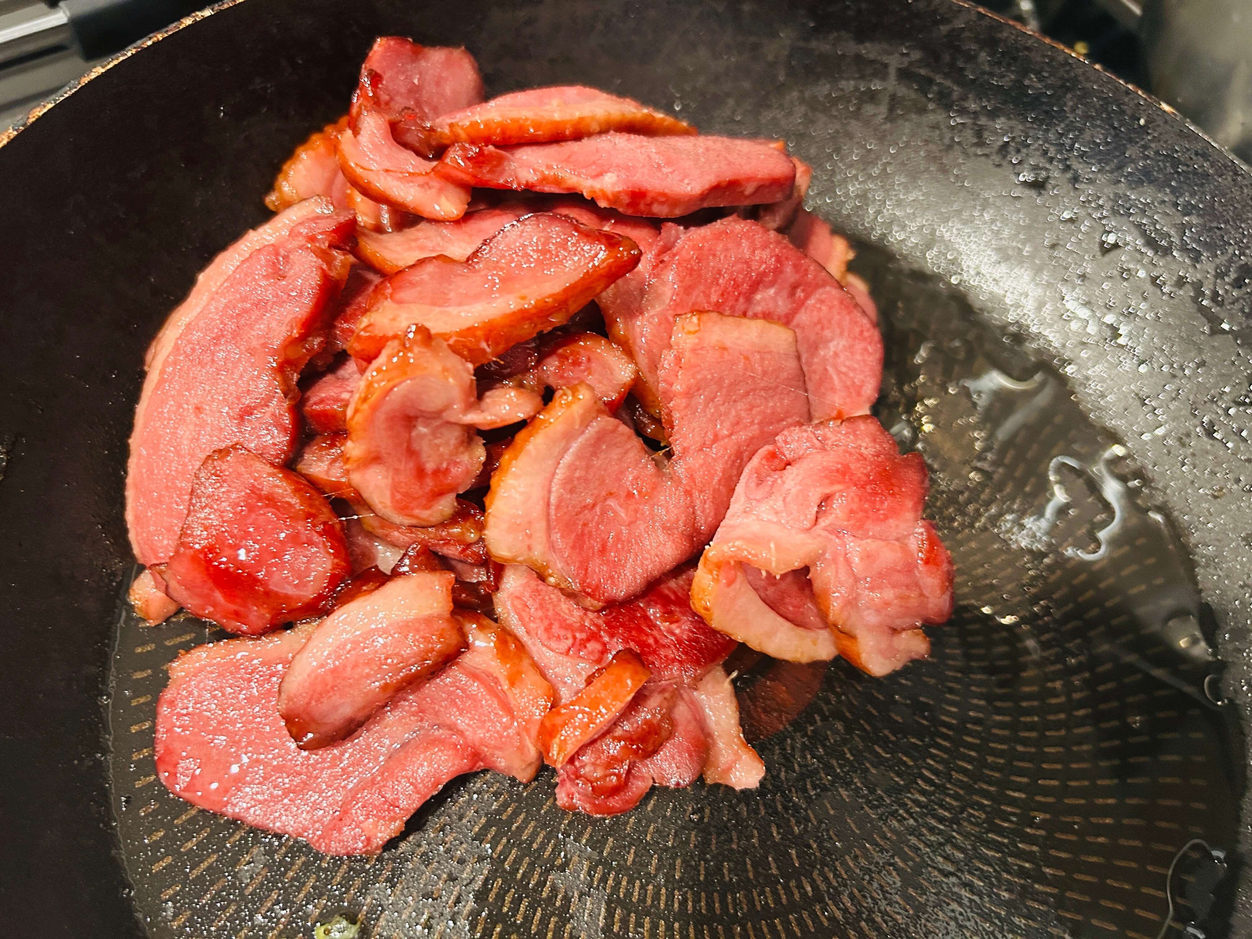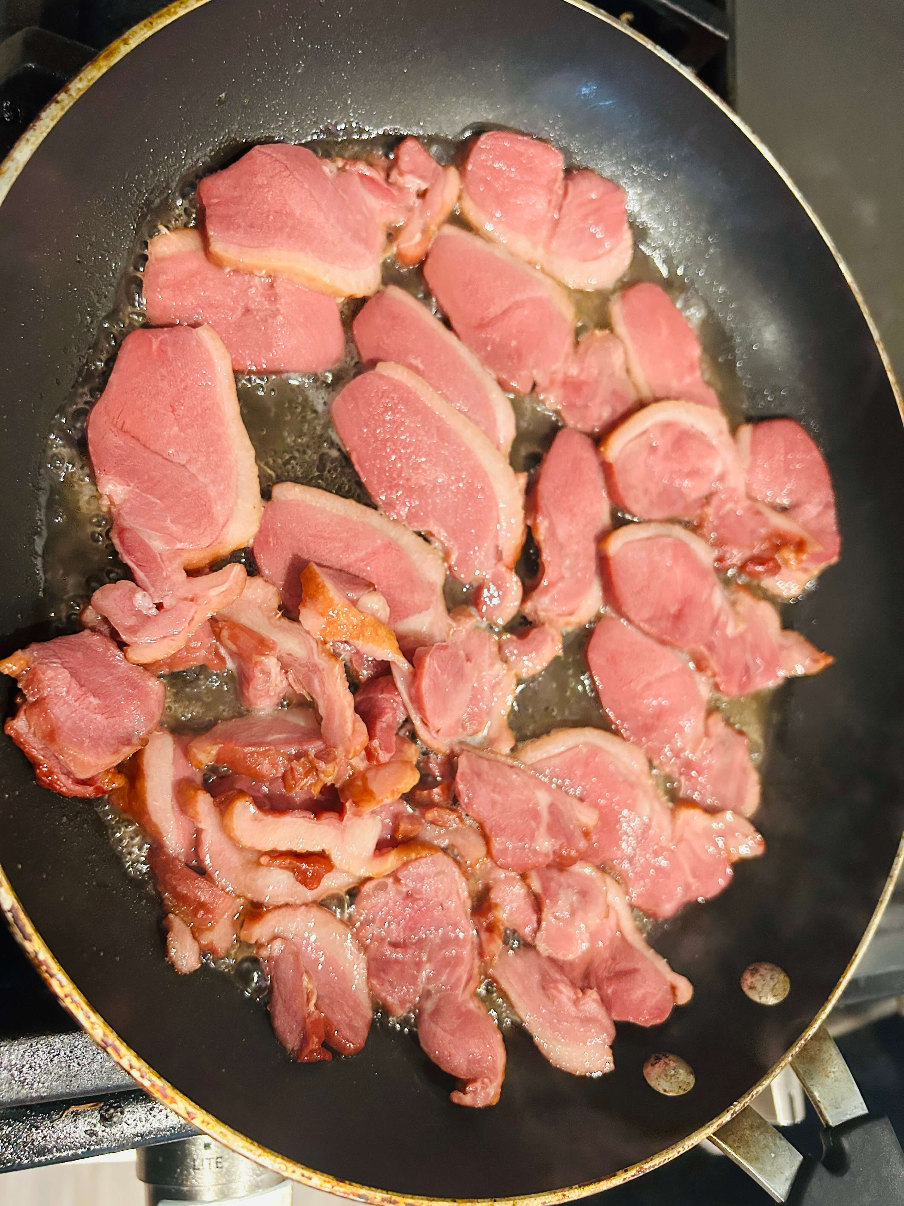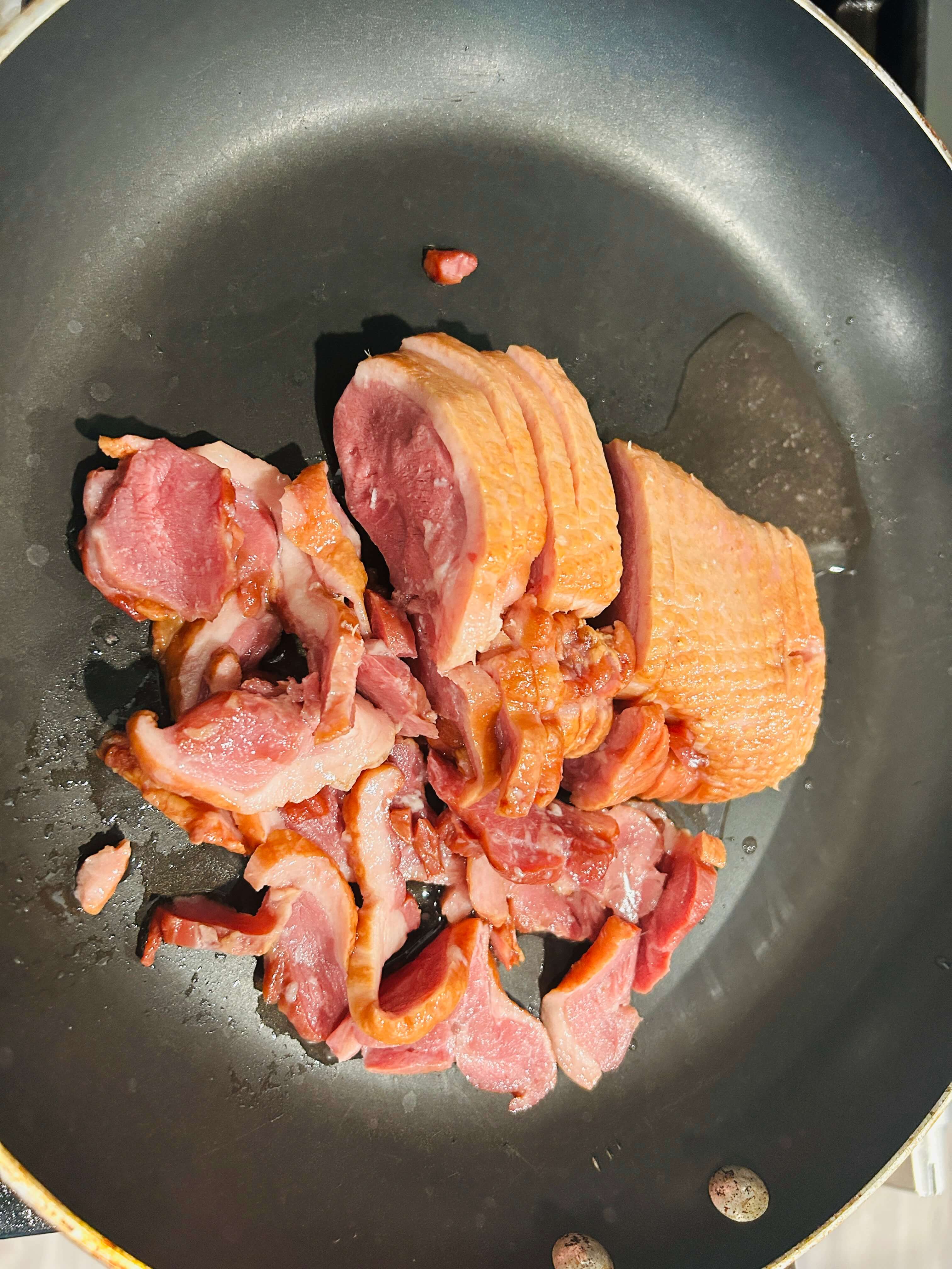 4. 훈제오리는 프라이팬에 한번 구워줍니다.