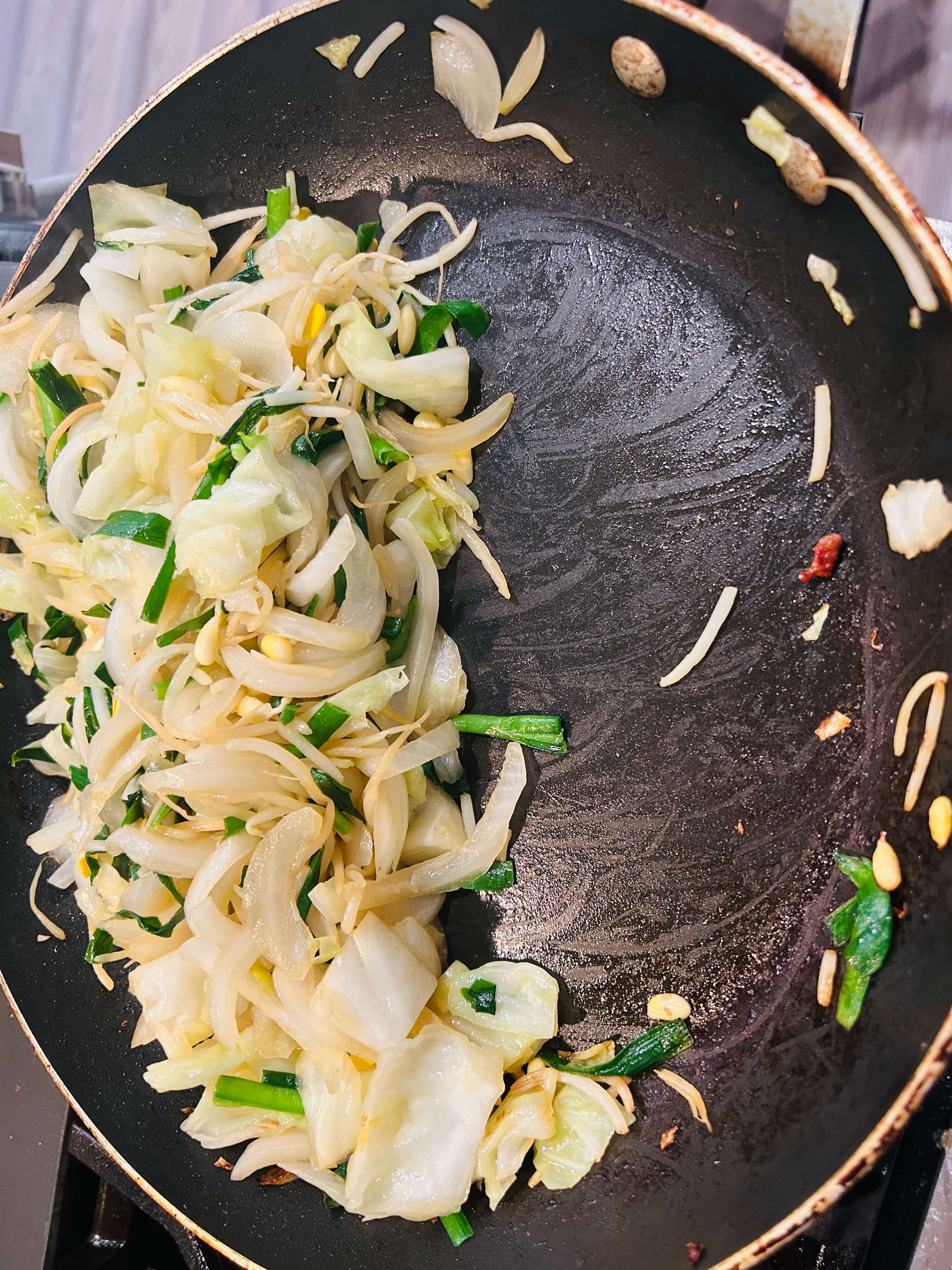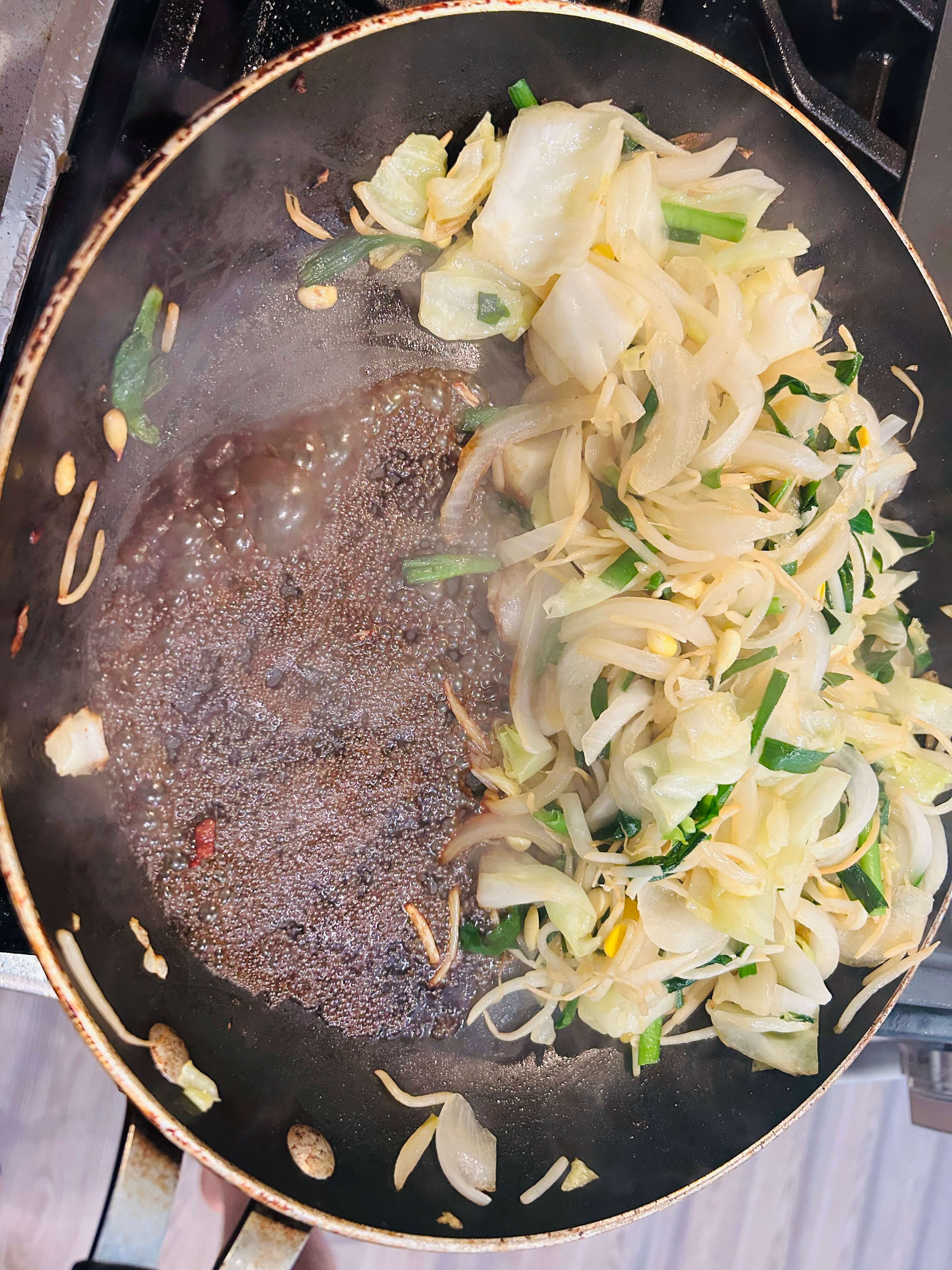 8. 채소들 숨이 죽으면 한쪽으로 밀어 공간을 만들어 줍니다.