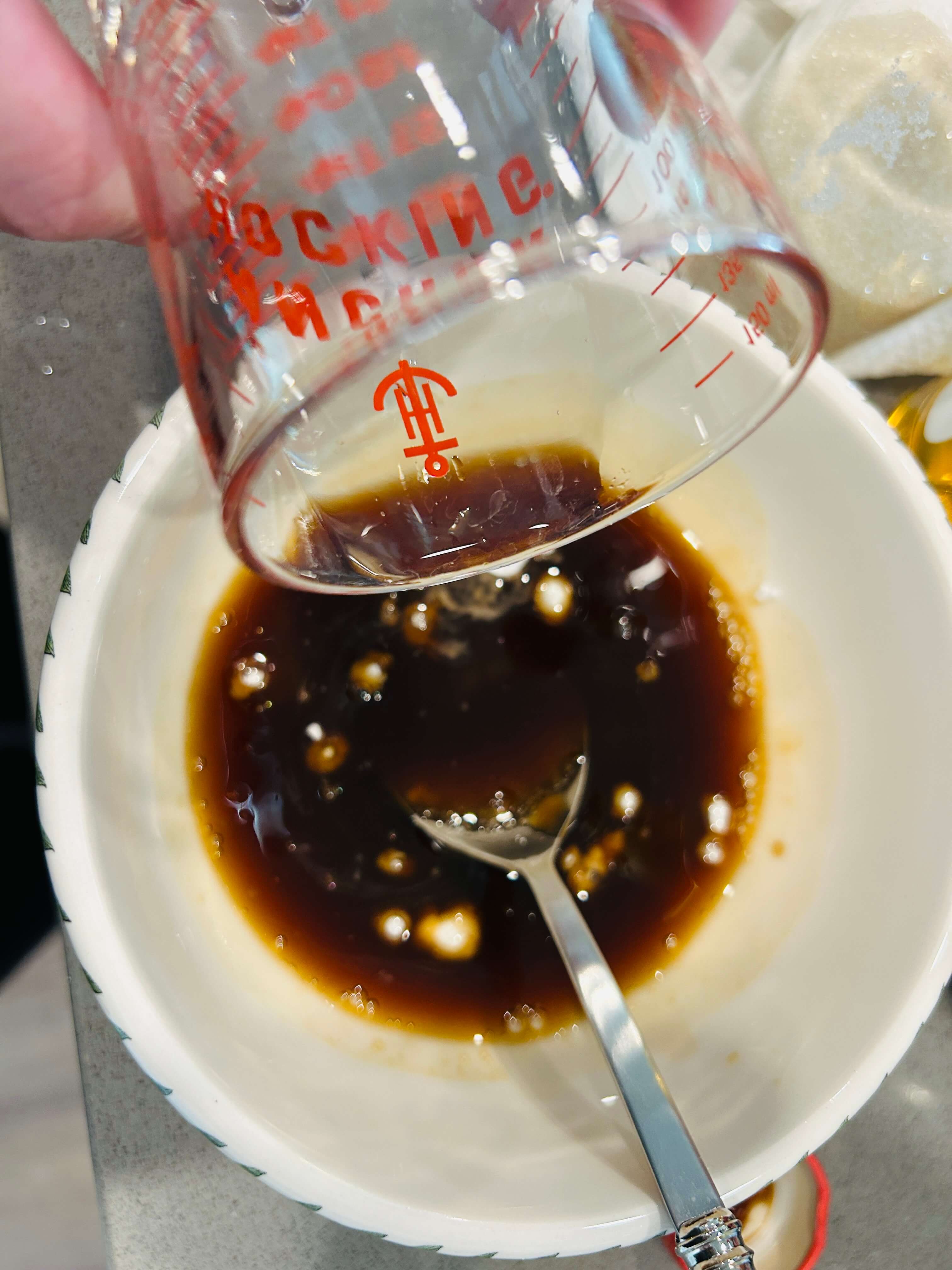 3. 간장 3 숟갈, 굴소스 2 숟갈, 알룰로스 1 숟갈, 설탕 1숟갈, 전분 1숟갈, 물 반컵을 넣고 잘 섞어줍니다.