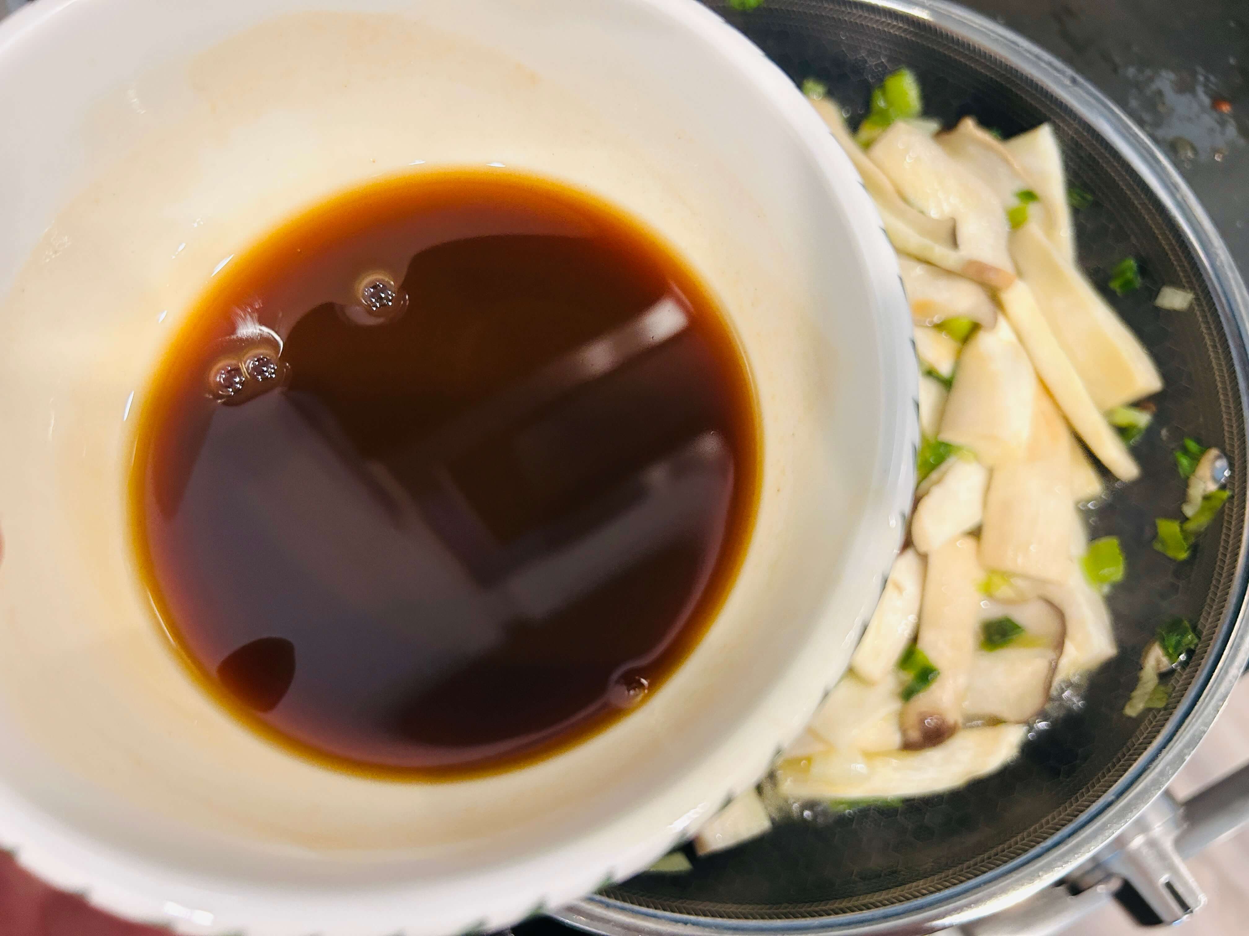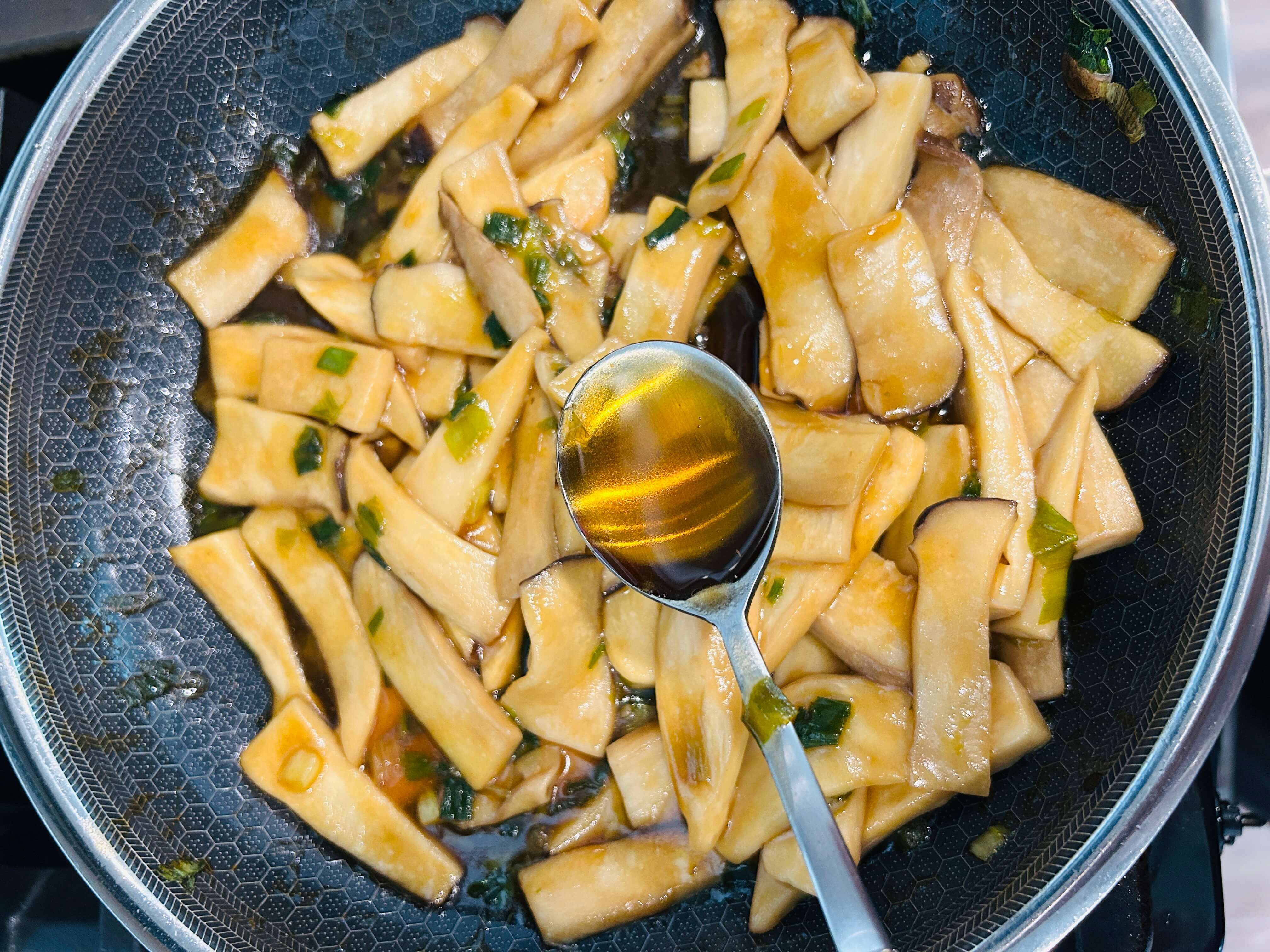 7. 양념이 버섯에 잘 버무려지고 졸여들면 참기름 한 숟갈을 넣고 마무리해 줍니다.