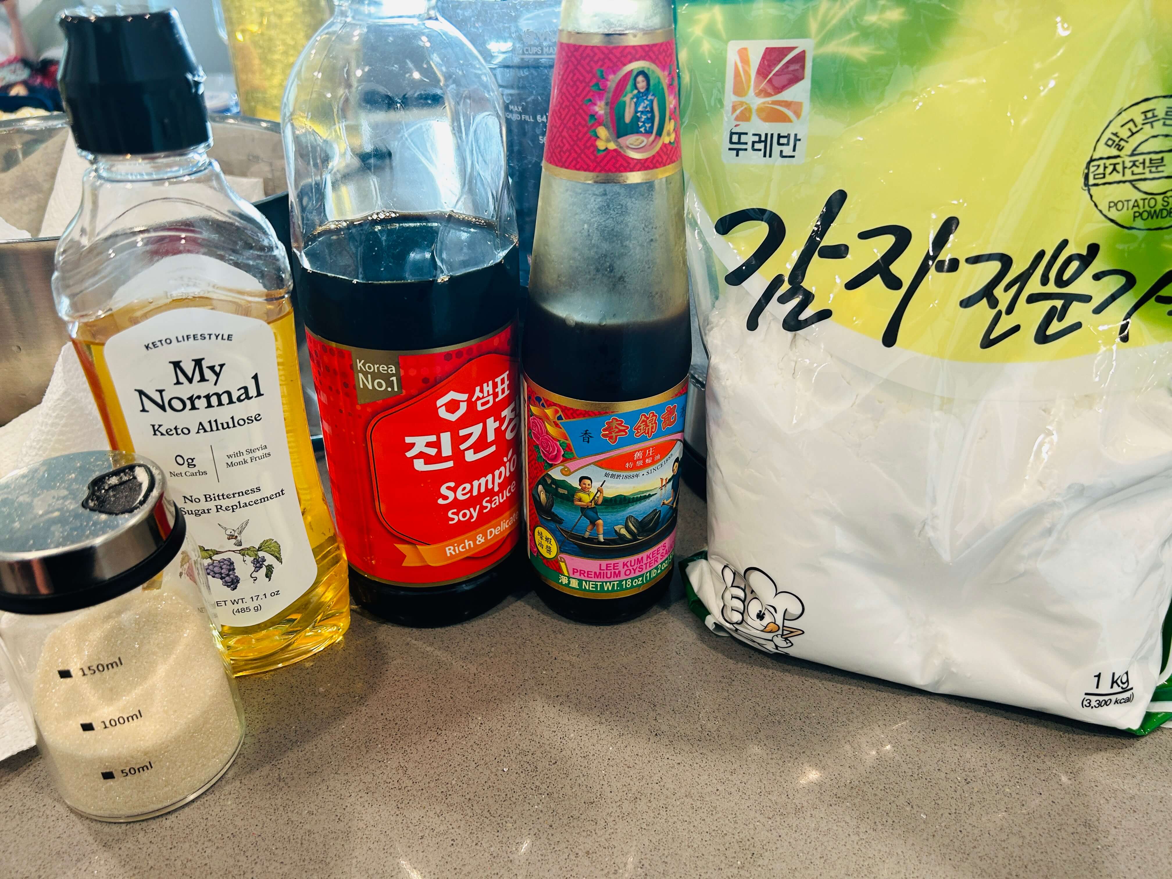 2. 양념재료로 간장, 굴소스, 설탕, 감자전분을 준비해 줍니다.