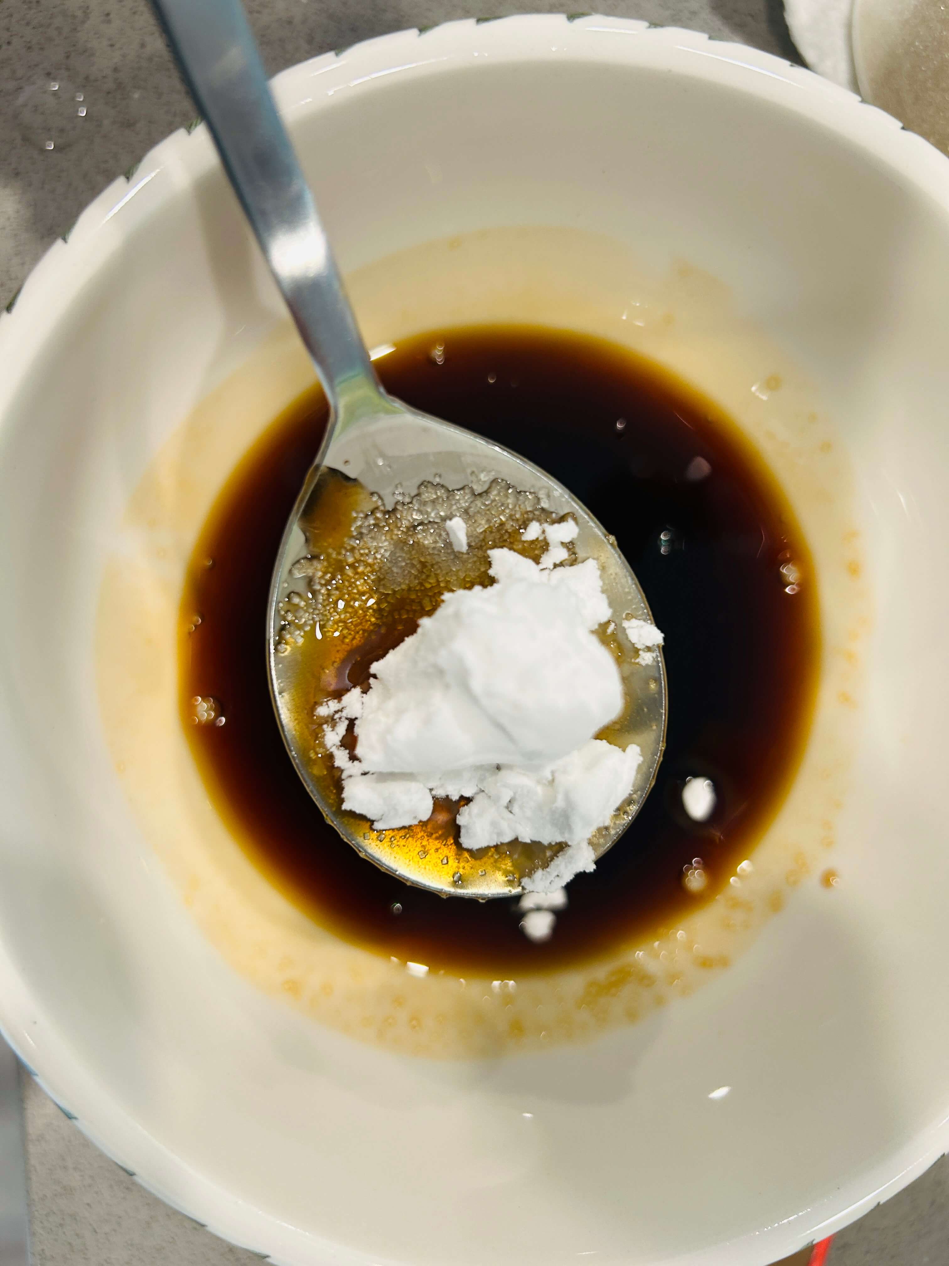 3. 간장 3 숟갈, 굴소스 2 숟갈, 알룰로오스 1 숟갈, 설탕 1숟갈, 전분 1숟갈, 물 반컵을 넣고 잘 섞어줍니다.