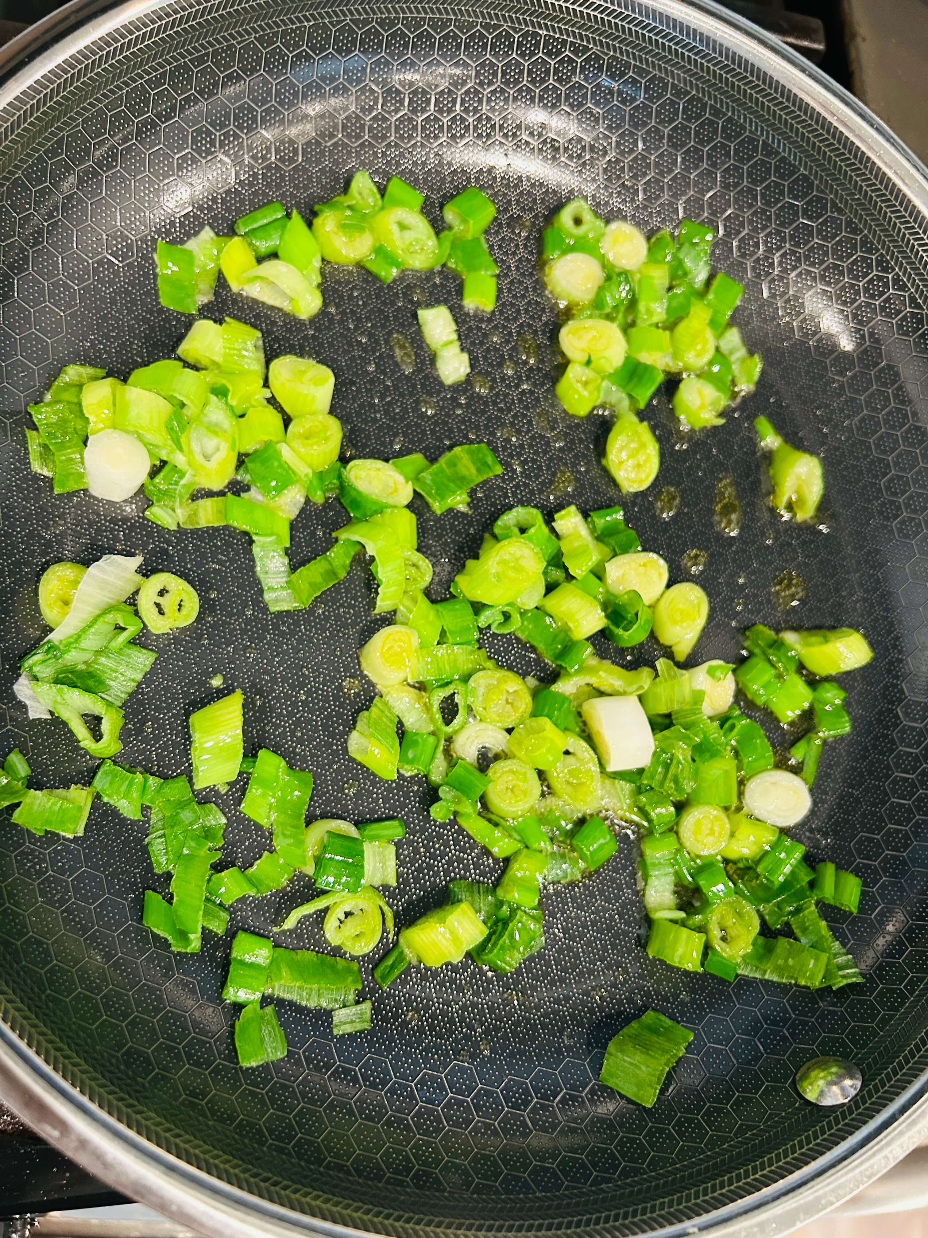 4. 팬에 기름을 두르고 파를 송송 썰어 볶아줍니다.