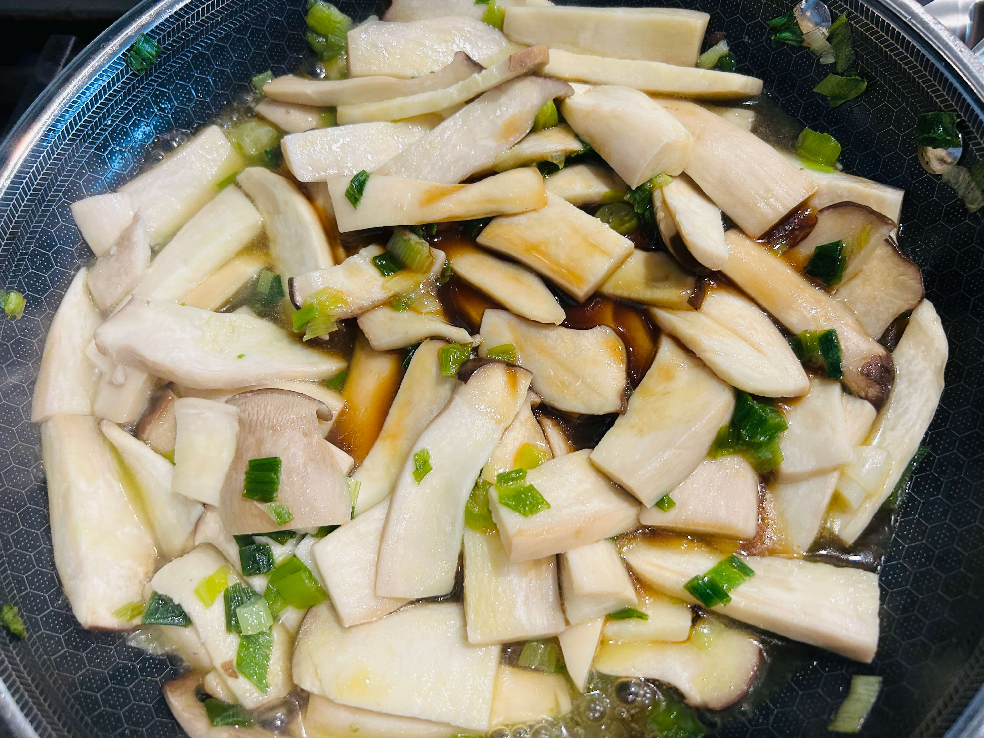 7. 양념이 버섯에 잘 버무려지고 졸여들면 참기름 한 숟갈을 넣고 마무리해 줍니다.