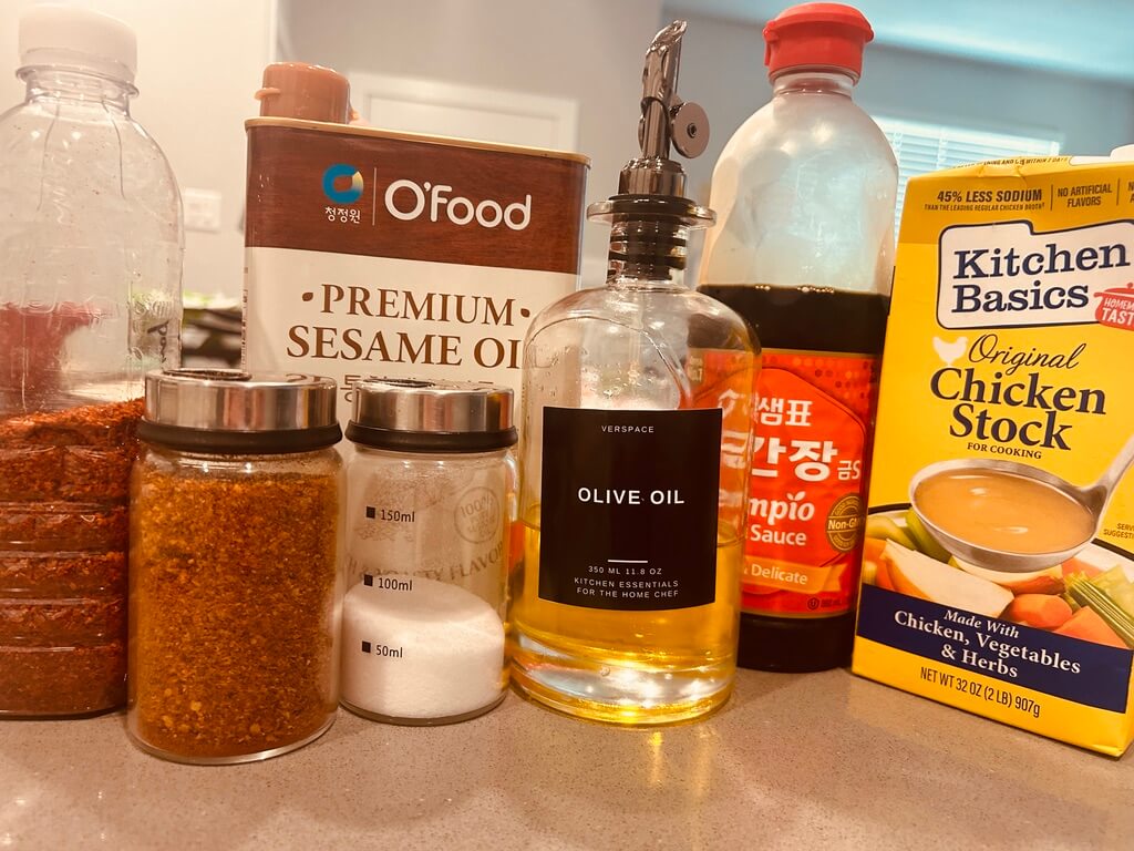 간장, 올리브유, 참기름, 고춧가루, 치킨스톡, 소금