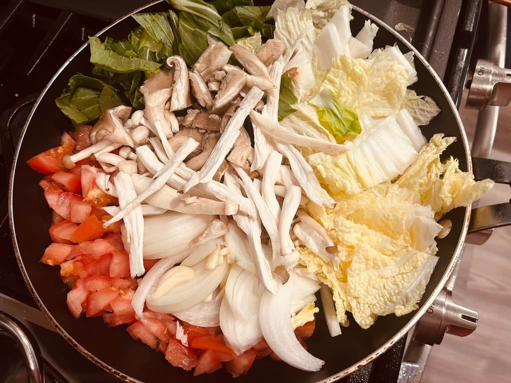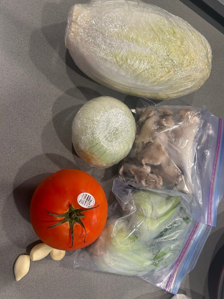 1. 토마토, 배추, 양파, 느타리버섯, 청경채, 마늘을 준비합니다.