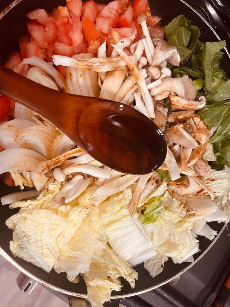 5. 프라이팬에 준비한 토마토, 채소들을 넣어줍니다.