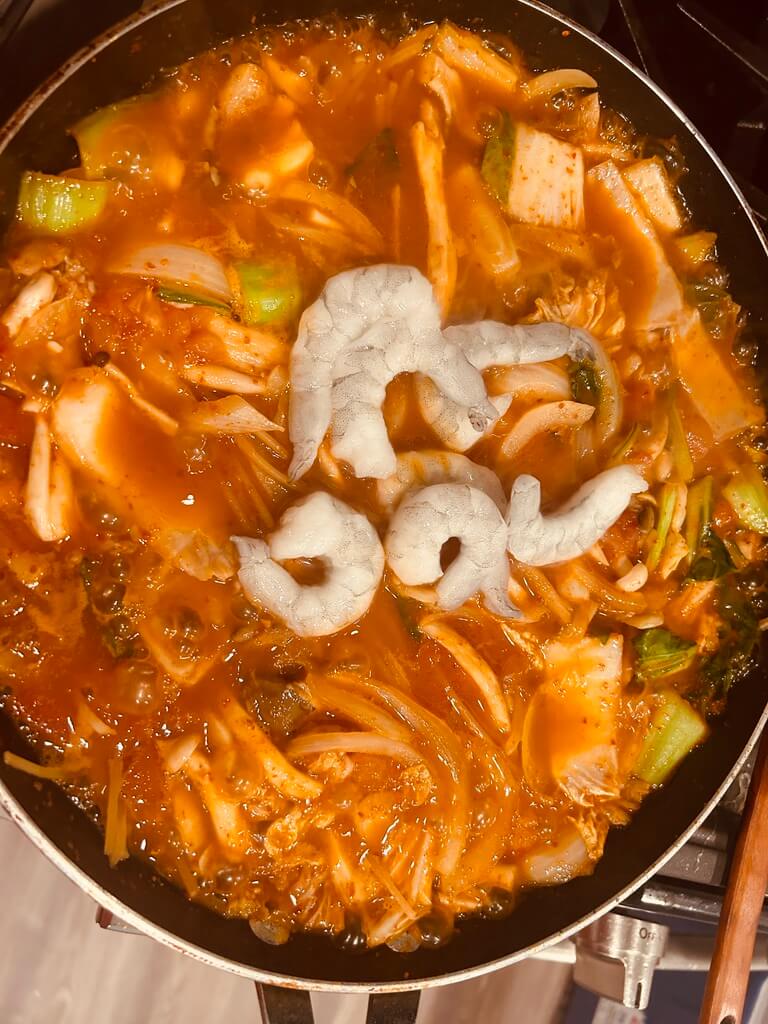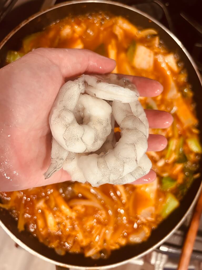 12. 한번 팔팔 끓을 때쯤 새우를 넣어줍니다.