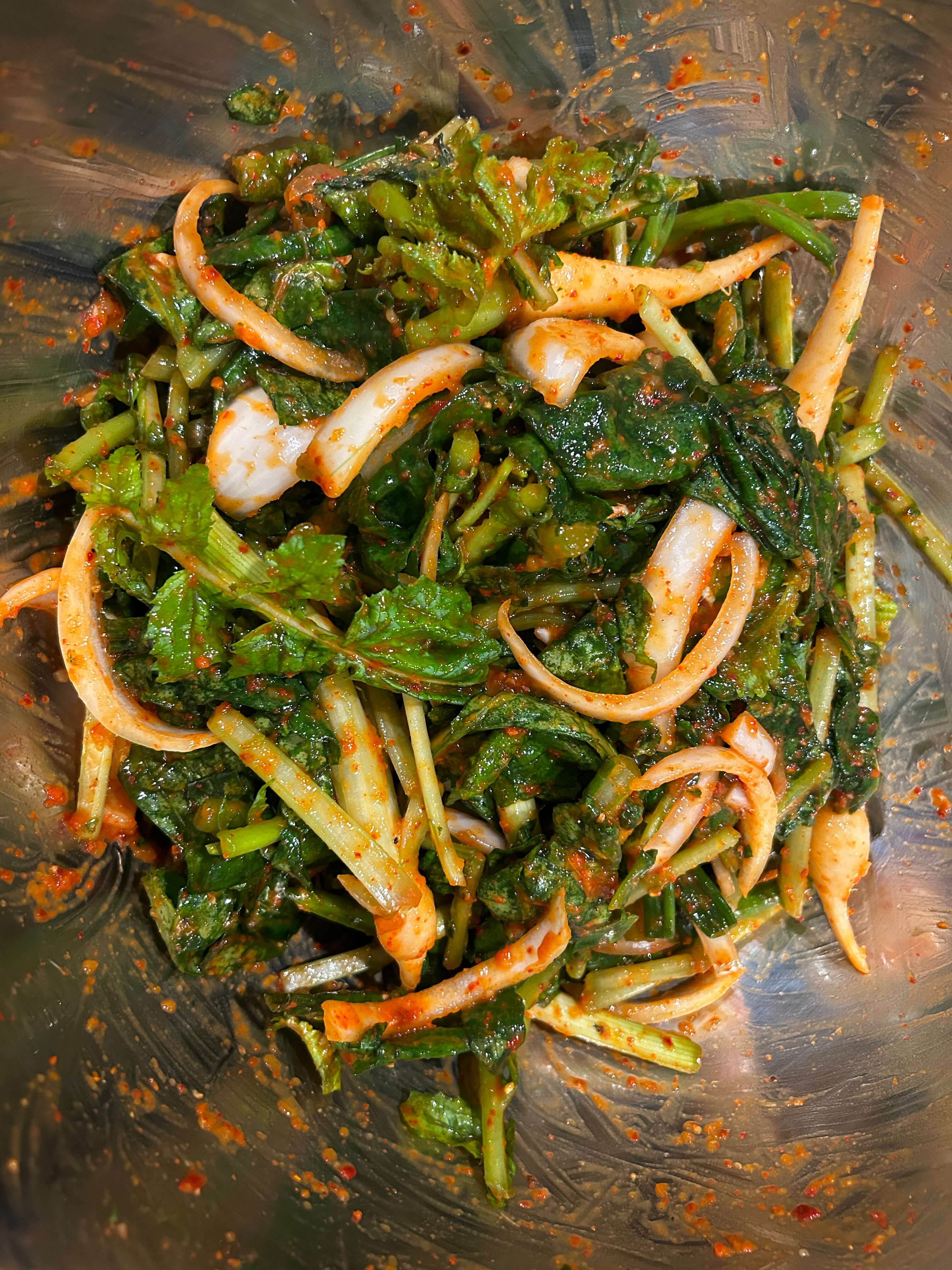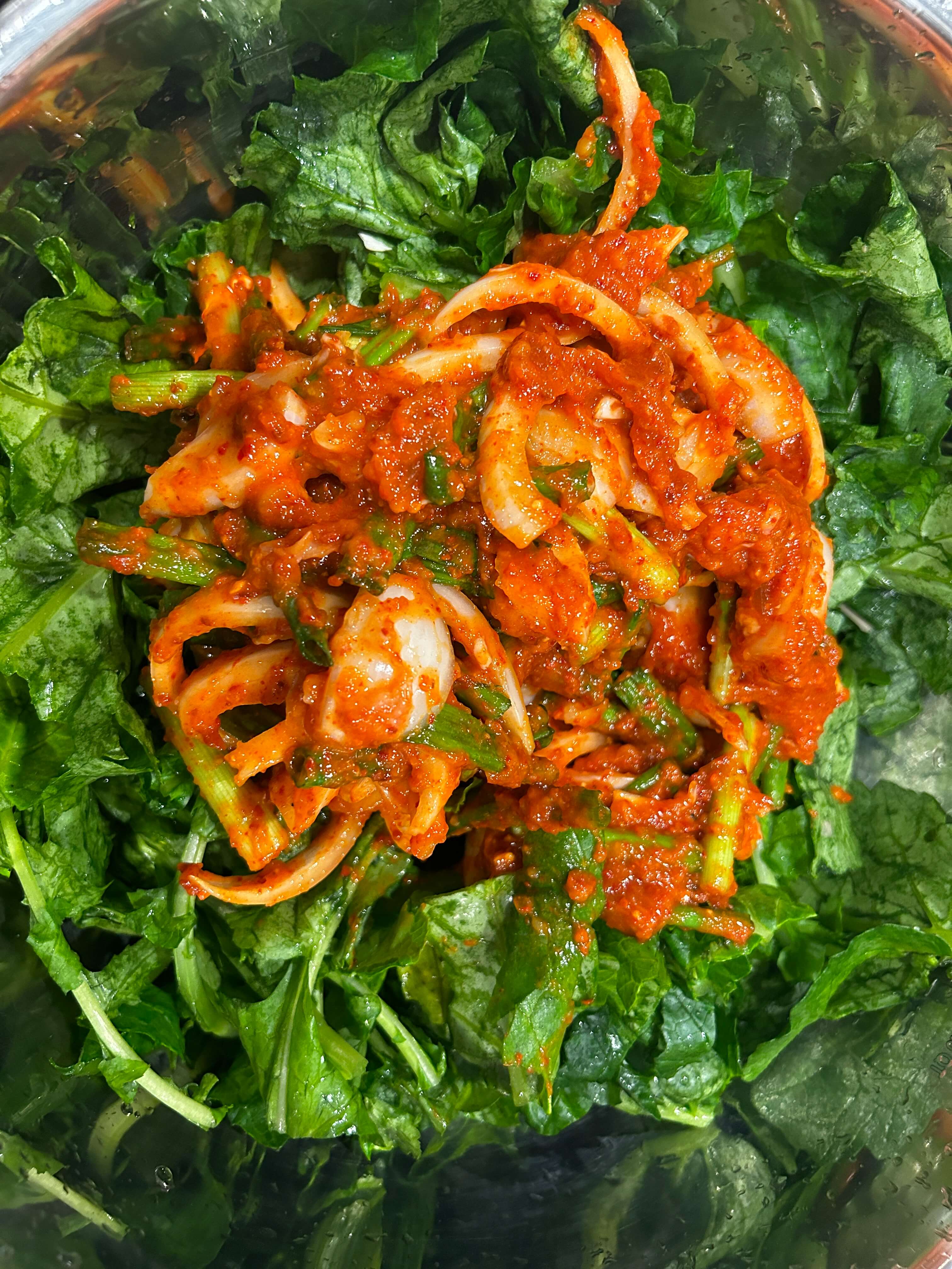14. 준비된 열무에 양념된 속재료를 넣고 잘 버무려 줍니다.