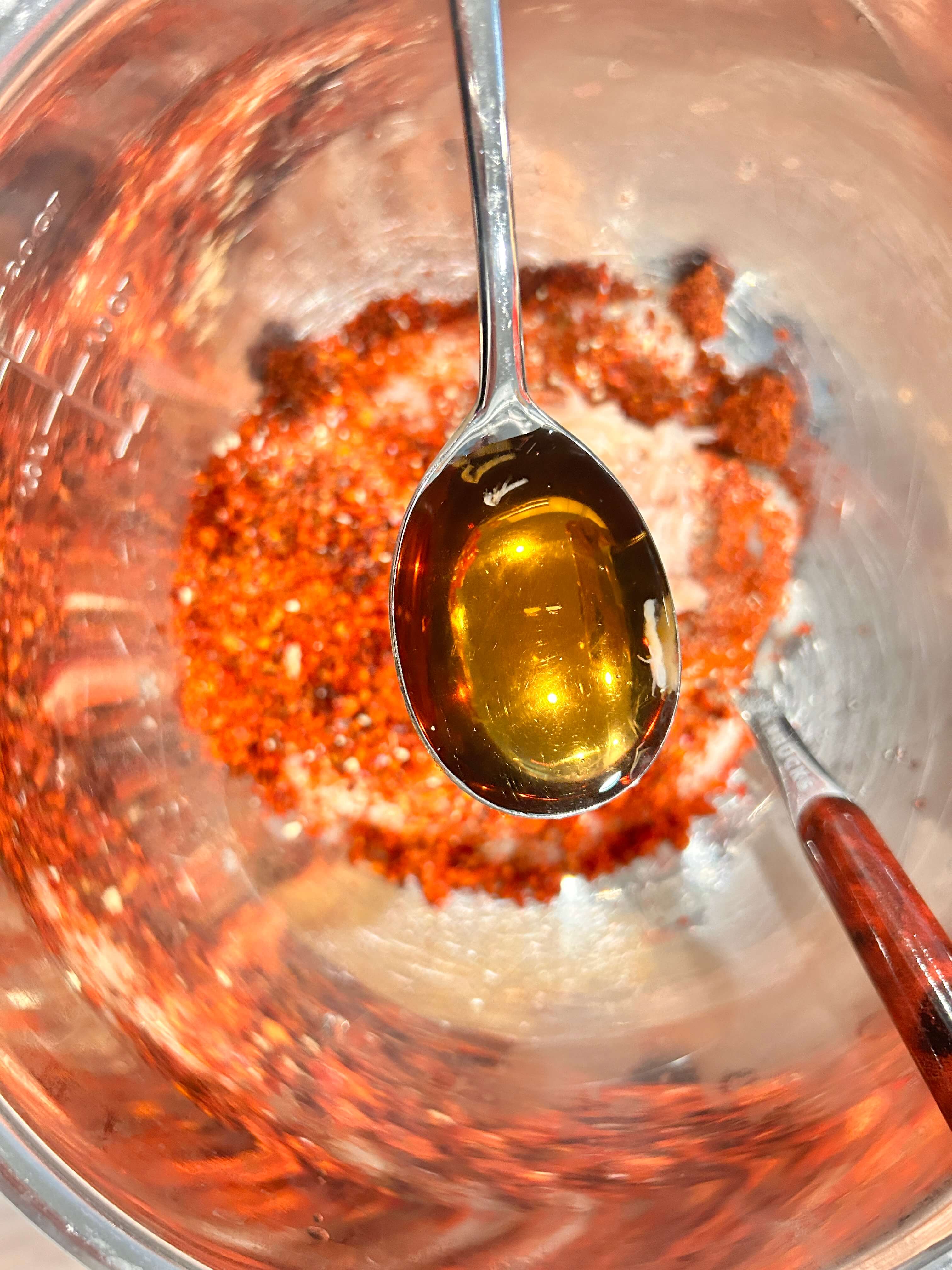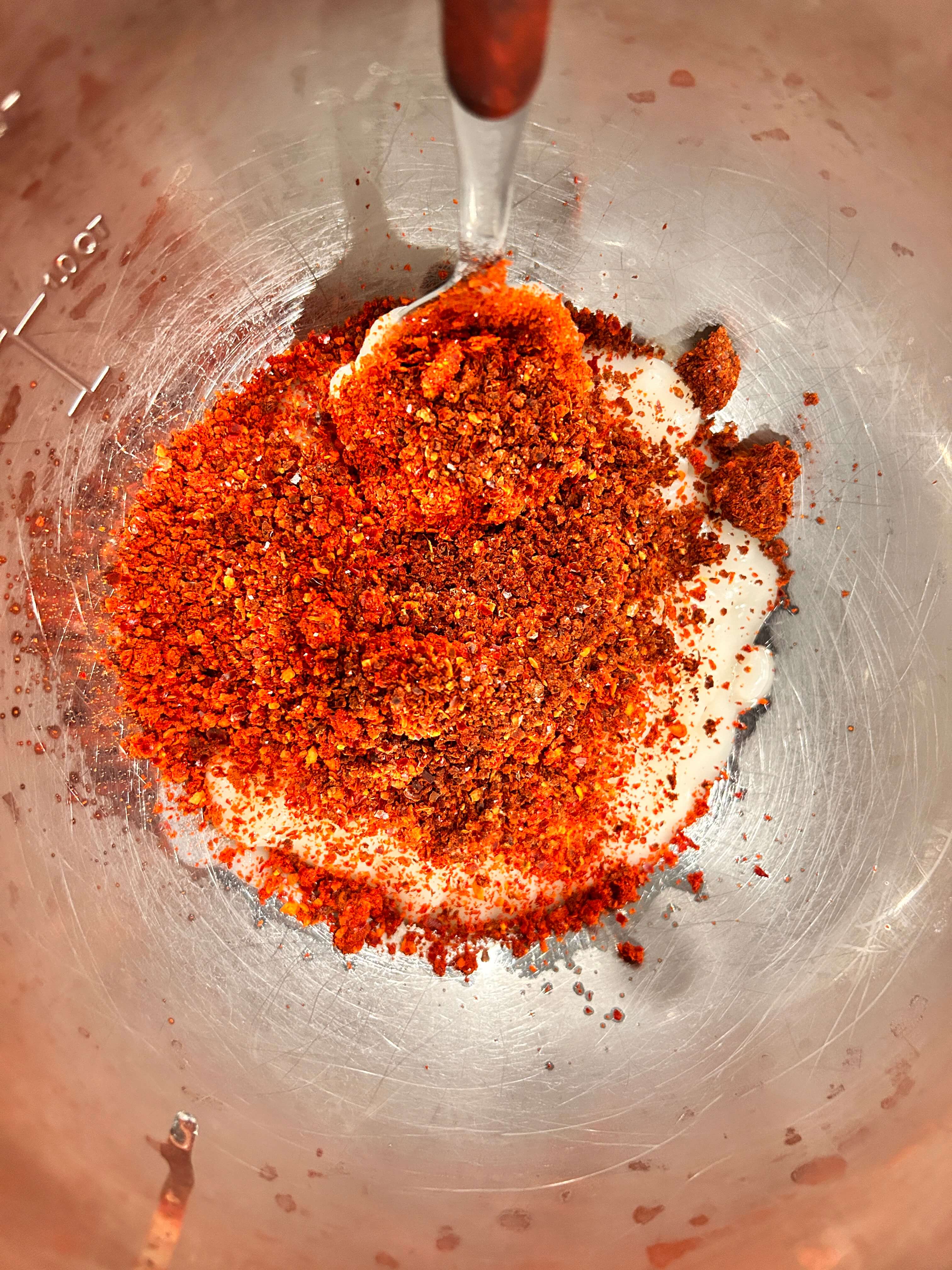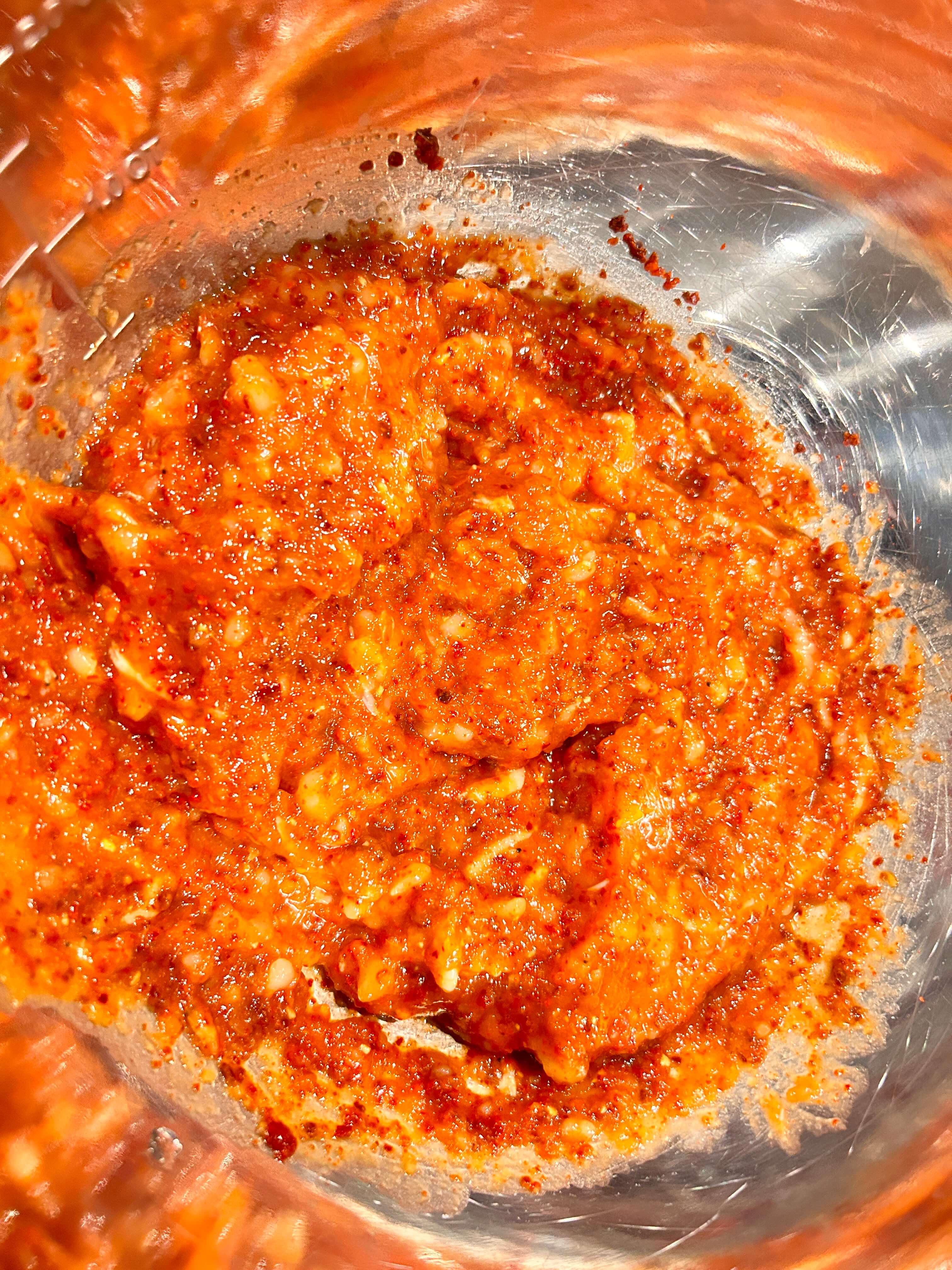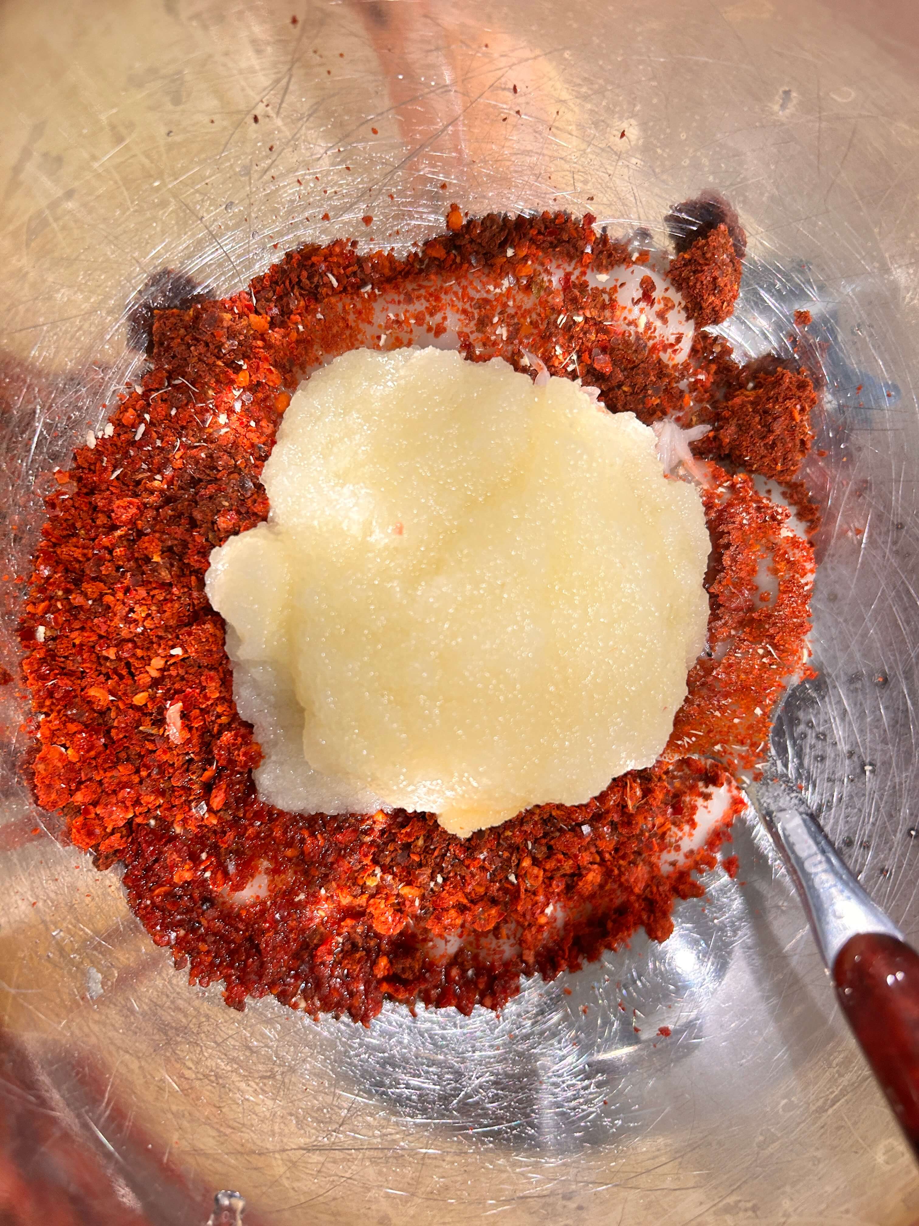 9. 볼에 밀가루풀 4.5 숟가락, 고춧가루 5숟가락, 새우젓 1 숟갈, 액젓 1 숟갈을 넣어줍니다.