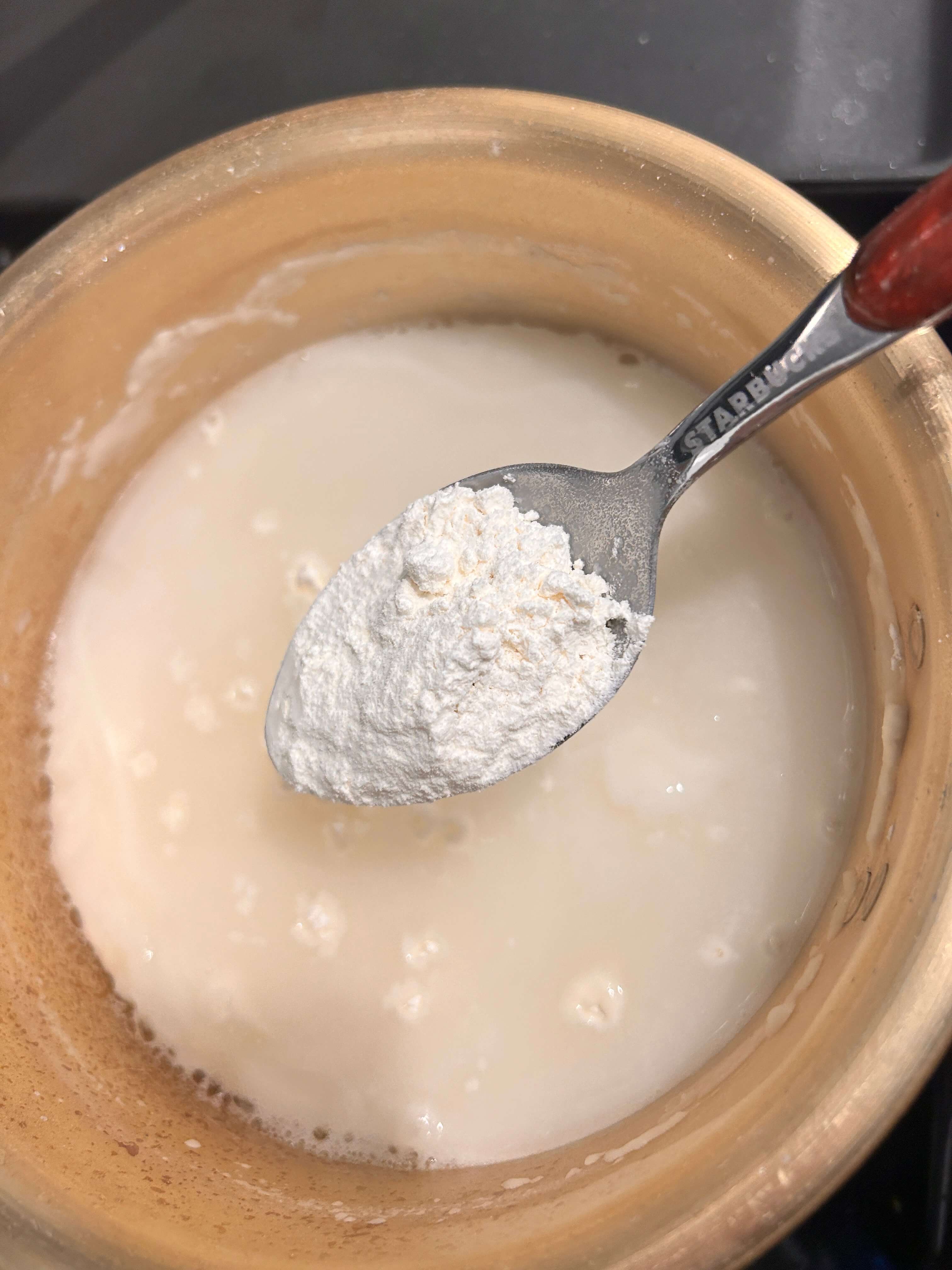 6. 물에 밀가루 한 숟갈정도를 넣고 걸쭉해질 때까지 저어주면서 끓여줍니다.
